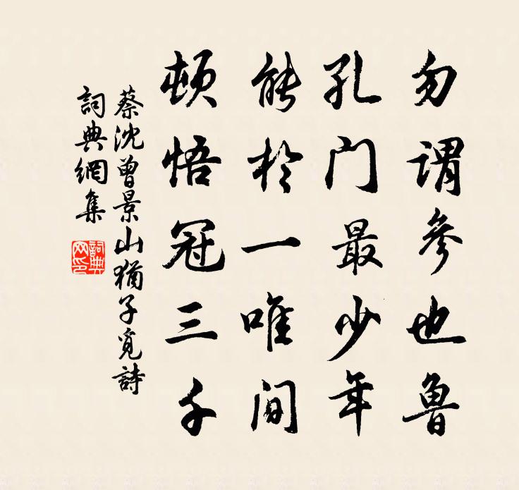 詩詞名句歷史字典書法欣賞書法字典國語詞典說文解字康熙字典古漢語字典標 題 作 者 詩 句 曾景山猶子覓詩作者:蔡沈 朝代:宋代曾景山猶子覓詩原文勿謂參也魯,孔門最少年。能於一唯間,頓悟冠三千。詩詞問答問:曾景山猶子覓詩的作者是誰?答:蔡沈問:曾景山猶子覓詩寫於哪個朝代?答:宋代蔡沈曾景山猶子覓詩書法欣賞曾景山猶子覓詩書法作品詩詞推薦石州慢 赴召史館,與德新丈別於岳祠西新店元好問〔金代〕系築行歌,鞍馬賦詩,年少豪舉。從渠里社浮沈,枉笑人間兒女。生平王粲,而今憔悴登樓,江山信美非吾土。天晴日元稹〔唐代〕多病苦虛羸,晴明強展眉。讀書心緒少,閒臥日長時。偈頌一百六十首釋宗杲〔宋代〕正朝把筆,萬事皆吉。應時納祜,慶無不宜。若作世諦,流布平地,吃交更在佛法,商量眉須隨落。送程給事知越州姚原道〔宋代〕共登龍榜早翱翔,青瑣黃扉佐有唐。金印隔江閒督府,月娥環席勸飛觴。皋夔勛鼎先三事,杭越詩同第一章。不比絕句六十四首張伯端〔宋代〕偃月爐中玉蕊生,硃砂鼎內水銀平。只因火力調和後,種得黃芽漸長成。曲江亭晚望白居易〔唐代〕曲江岸北憑欄乾,水面陰生日腳殘。塵路行多綠袍故,風亭立久白須寒。詩成暗著閒心記,山好遙偷病眼看。不被十二時/憶少年佚名〔宋代〕臨寰宇,恭已岩廊。屬意在耕桑。愛民利物,德邁陶唐。躋俗盡淳龐。開千畝、帝籍神倉。舉彝章。祗祓壇場。為歲儉吟邵雍〔宋代〕歲儉心非儉,家貧道不貧。誰知天地內,別有好乾坤。寄懷二十首趙蕃〔宋代〕晏齋生理比何如,破硯今來亦已枯。珍重此君為耐久,澹然相對只清癯。慶資深康樂園四詠王之道〔宋代〕露梢戛戛敲鳴玉,雲葉差差傳新綠。這前十頃碧琉璃,過雨荷花淨如浴。客來不迎君莫嗔,我有清風如故人。先生西江月佚名〔宋代〕蹴踘場中年少,鞦韆架上佳人。三三兩兩趁芳辰。玩賞風光美景。日暖風和明媚,更加花草香馨。紅顏移步出閨門致仕後即事陸游〔宋代〕敕過鸞台鳳閣來,清晨初拆驛書開。繡箱香案迎門拜,身著朝衫止此回。傷春孟郊〔唐代〕兩河春草海水清,十年征戰城郭腥。亂兵殺兒將女去,二月三月花冥冥。千里無人旋風起,鶯啼燕語荒城裡。春色水仙花·天機織罷月梭閒喬吉〔元代〕天機織罷月梭閒,石壁高垂雪練寒。冰絲帶雨懸霄漢,幾千年曬未乾。露華涼人怯衣單。似白虹飲澗,玉龍下山,青玉案(閒居)張炎〔宋代〕萬紅梅里幽深處。甚杖屨、來何暮。草帶湘香穿水樹。塵留不住。雲留卻住。壺內藏今古。獨清懶入終南去。有忙遠遊十首韓元吉〔宋代〕雷出九地底,化為萬鼓鼙。豕首柄石斧,剨然四海馳。夔{魁斗換虛}與罔象,辟除靡有遺。無私乃帝令,負雨多山齋詩庾信〔南北朝〕寂寥尋靜室。蒙密就山齋。滴瀝泉澆路。穹窿石臥階。淺槎全不動。盤根唯半埋。圓珠墜晚菊。細火落空槐。直置陸賈二首劉克莊〔宋代〕酈烹未久蒯幾烹,陸子優遊享令名。南帝稱臣橐金返,更推餘智教陳平。贈邊縣尹何夢桂〔宋代〕君家久富五經儲,更有兒孫讀祖書。事究麟經明亥豕,理窮羲易得筌魚。枳業不是棲鸞處,花縣來觀展驥初。北道贊張英玉所畫山谷老蟻蝶圖姚勉〔宋代〕穹碑一立承天寺,吟骨遂重宜州樓。當年群蟻亦策勛,豈知須臾夢封侯。南柯一散風雨惡,未若栩栩為莊周。名句推薦人生天地間,忽如遠行客。佚名《青青陵上柏》 立身不嫌家世貧賤,但能忠厚老成,所行無一毫苟且處,便為鄉黨仰望之人。王永彬《圍爐夜話·第十七則》 故大人之務,將在於眾賢而已。墨子《墨子·08章 尚賢(上)》 尋常一樣窗前月,才有梅花便不同。杜耒《寒夜》 人犯一苟字,便不能振;人犯一俗字,便不可醫。王永彬《圍爐夜話·第一二九則》 孤煙村際起,歸雁天邊去。孟浩然《南歸阻雪》 可惜一溪風月,莫教踏碎瓊瑤。蘇軾《西江月·頃在黃州》 黃花本是無情物,也共先生晚節香。于謙《過菊江亭》 適與野情愜,千山高復低梅堯臣《魯山山行》 因思杜陵夢,鳧雁滿回塘。溫庭筠《商山早行》