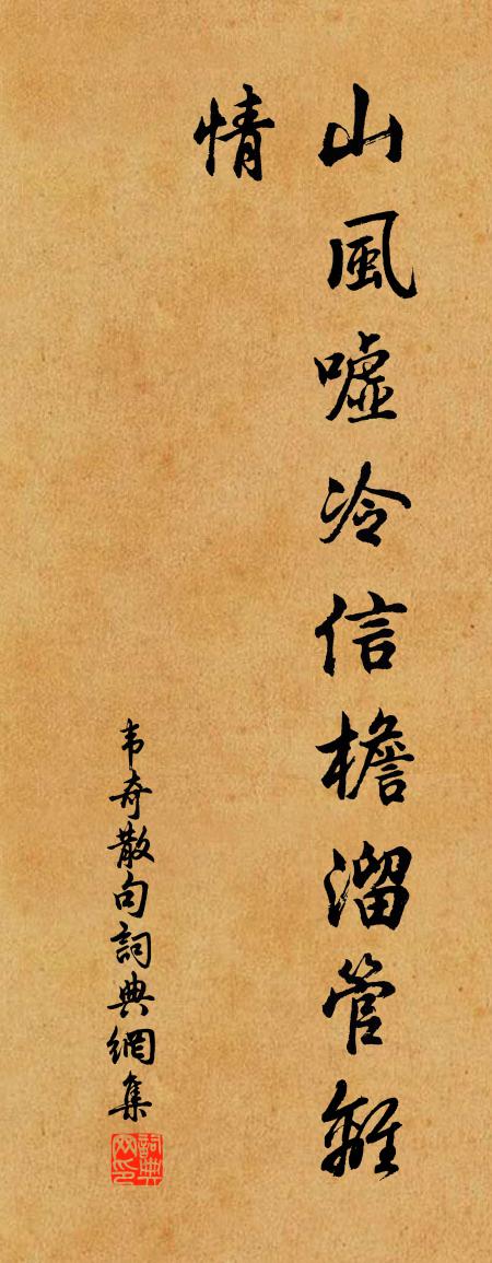 詩詞名句歷史字典書法欣賞書法字典國語詞典說文解字康熙字典古漢語字典標 題 作 者 詩 句 句作者:韋奇 朝代:宋代句原文山風噓冷信,檐溜管離情。詩詞問答問:句的作者是誰?答:韋奇問:句寫於哪個朝代?答:宋代韋奇句書法欣賞句書法作品詩詞推薦寄吳山淨上人顧非熊〔唐代〕憶共 * 話夜鍾,別來落葉閟行蹤。遙知黛色秋常玩,住向靈岩第幾峰。偈頌一百零二首釋紹曇〔宋代〕未入雞足山,不踏黃梅路。惡業苦無多,平白披毛去。明眼人前,一場笑具。梁審計輓詞樓鑰〔宋代〕壯歲嶄頭角,夷塗試著鞭。群公爭倒屣,諸老亦忘年。論議傾朝譽,功名短世緣。神傷賢伯仲,同雨夜無眠。送朱秀才歸閩齊己〔唐代〕荊門來幾日,欲往又囊空。遠客歸南越,單衣背北風。近鄉微有雪,到海漸無鴻。努力成詩業,無謀謁至公。出關言懷黃滔〔唐代〕又乞書題出,關西謁列侯。寄家僧許岳,釣浦雨移洲。賣馬登長陸,沾衣逐勝游。菜腸終日餒,霜鬢度年秋。詩苦萬席仰之許酒以詩戲之王洋〔宋代〕花色芳菲酒力醲,坐中上客索千鍾。朱陳繾綣論前契,子婿牽聯本一宗。獨為棋高能假借,眾同酒伴不阿容。歸來雜劇·溫太真玉鏡台關漢卿〔元代〕第一折(老旦扮夫人引梅香上,詩云)花有重開時,人無再少日。生女不生男,門戶憑誰立?老身姓溫,夫主姓劉寧廉仲載王洋〔宋代〕吾州阿載志尚古,瓦豆鉶羹列尊俎。存心淡泊自有餘,過眼浮華俱不與。但知古人力可到,不管今人棄如土。白頭五凌晨七月閒賦曾豐〔宋代〕二十年前到已曾,今雖重到眼猶生。海無棄水歸斯受,山不留雲用則行。去雁來鴻如互避,稚金老火若交爭。天機朗上人見訪復謁不還留刺而還有詩見謝依韻和王禹偁〔宋代〕湯休訪我我重尋,獨叩松關絕好音。滿袖塵埃回俗步,一爐香火隔禪林。偶留刺字情非淺,忽枉詩章思更深。猶喜連雪不已復作絕句詠之及六而止殆未免不愁凍趙蕃〔宋代〕粲粲初投米,飄飄旋落花。巷深迷吠犬,林合誤歸鴉。以廬山三疊泉寧張宗瑞湯巾〔宋代〕九疊峰頭一道泉,分明來處與雲連。幾人競賞飛流勝,今日方知至味全。鴻漸但嘗唐代水,涪翁不到紹熙年。從茲無夢令丘處機〔元代〕皇統年時飢餓。萬戶愁生眉鎖。有口卻無餐,滴淚謾成珠顆。災禍。災禍。災禍臨頭怎躲。故相國苗公輓歌錢起〔唐代〕灞陵誰寵葬,漢主念蕭何。盛業留青史,浮榮逐逝波。隴雲仍作雨,薤露已成歌。悽愴平津閣,秋風弔客過。送王充道游三茅廬阜楊時〔宋代〕荊吳相望各天涯,千里柴車鹿自隨。解轡定應春盡日,及歸宜待鶴來時。聖賢莫負樽中淥,日月長為物外遲。若過玉漏遲 壽張右丞張伯淳〔元代〕太平元夜好。鰲山宴徹,祥煙凝曉。端正嬋娟,為我玳筵留照。曾待龍潛舊邸,更欣際、鴻圖初造。人盡道。兩宮王氏碧雞園六詠露香亭王灼〔宋代〕北渚一帝子,洛川一宓妃。池有十種蓮,平生所見稀。纖濃各態度,紅白爭光輝。我來亭上飲,夜久未忍歸。翁家登越王台呂定〔宋代〕海上荒台草樹平,登臨不盡古人情。白雲萬里懷親舍,紅日中天望帝京。百粵山咱秋歷落,山城樓閣晚崢嶸。醉來雨花台方岳〔宋代〕孤雲落日倚西風,歷歷興亡望眼中。山入六朝青未了,江浮五馬恨無窮。客愁已付葡萄綠,逕雨空餘瑪瑙紅。我亦句釋曉瑩〔宋代〕詩成聊疥壁。名句推薦安居不用架高堂,書中自有黃金屋。趙恆《勸學詩》 枯楊枯楊爾生稊,我獨七十而孤棲。李白《雉朝飛》 空門寂寞汝思家,禮別雲房下九華。金地藏《送童子下山》 近重陽、偏多風雨,絕憐此日暄明。姚雲文《紫萸香慢·近重陽》 春思遠,誰嘆賞、國香風味。周密《繡鸞鳳花犯·賦水仙》 不堪腸斷思鄉處,紅槿花中越鳥啼。李德裕《謫嶺南道中作》 君子之德風,小人之德草,草上之風必偃。孔子弟子《論語·顏淵篇》 九日明朝酒香,一年好景橙黃。張可久《滿庭芳·客中九日》 落花夜雨辭寒食。塵香明日城南陌。吳文英《菩薩蠻·落花夜雨辭寒食》 見素抱樸,少私寡慾,絕學無憂。老子《老子·道經·第十九章》