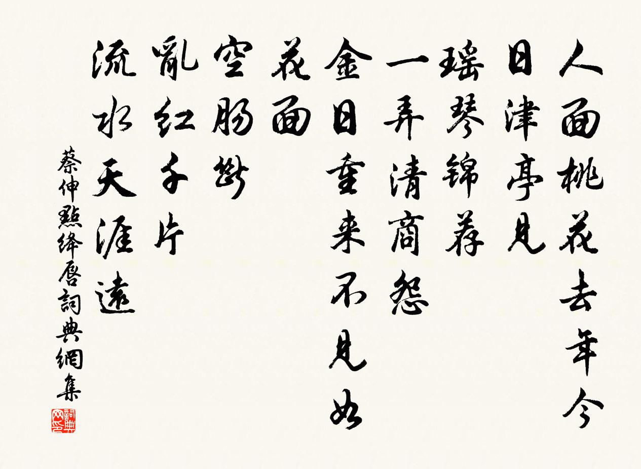 詩詞名句歷史字典書法欣賞書法字典國語詞典說文解字康熙字典古漢語字典標 題 作 者 詩 句 點絳唇作者:蔡伸 朝代:宋代點絳唇原文人面桃花,去年今日津亭見。瑤琴錦薦。一弄清商怨。金日重來,不見如花面。空腸斷。亂紅千片。流水天涯遠。詩詞問答問:點絳唇的作者是誰?答:蔡伸問:點絳唇寫於哪個朝代?答:宋代問:點絳唇是什麼體裁?答:詞蔡伸點絳唇書法欣賞點絳唇書法作品詩詞推薦癸丑除夕陳維崧〔清代〕響銅簽。許多年、舊事壓眉尖。記得當初,後堂弟妹,團圞圍定紅簾。飲盡了、屠蘇千盞,撻畫鼓,憨笑賭黃柑。游廬山山陽七詠其七白鶴觀蘇轍〔宋代〕五老相攜欲上天,玄猿白鶴盡疑仙。浮雲有意藏山頂,流水無聲入稻田。古木微風時起籟,諸峰落日盡生煙。歸鞍金陵雜興二百首蘇泂〔宋代〕五馬浮江一馬龍,亡何兵滿建康宮。瓜分鼎峙從來事,猶說金陵王氣濃。仗錫平老自都城回見訪索怡雲堂詩陸游〔宋代〕東華軟塵飛撲帽,黃金絡馬人看好。渠儂胸中誰得知,畏禍憂讒鬢先老。舉世輸與平元衡,青山白雲過一生;出門和陳正言讜題尊賢堂二首譚景先〔宋代〕孰識東坡第一仙,謫來儋耳久悠然。潛心學易忘憂患,築屋閒居度歲年。興遣不為哀屈事,情高嘗見和陶篇。拜公居厚弟和七十四吟再賦劉克莊〔宋代〕列城若個是張巡,拊髀方思志義臣。懷印綬亡多委郡,援鍪弧死更無人。肆雞竿赦還遷客,出褭蹄金聚散民。待得次韻張提刑送行六絕洪咨夔〔宋代〕扁舟觸熱下涪忠,肩聳無人肯拍洪。詩送涼風天外至,魚龍起舞浪化中。苑舍人能書梵字兼達梵音,皆曲盡其妙,戲為之贈王維〔唐代〕名儒待詔滿公車。才子為郎典石渠。蓮花法藏心懸悟,貝葉經文手自書。楚詞共許勝揚馬,梵字何人辨魯魚。故舊予往來秦熙汧隴間不啻十數年時聞下里之歌遠李復〔宋代〕鳴鳳山西五里坂,未渡汧河山漸淺。東來行人漸長嘆,已覺秦川不在眼。雜詠一百首史蘇劉克莊〔宋代〕繇語幾於讖,流傳信有諸。王何謾辛苦,易自是占書。留肅子歌楊維楨〔元代〕留肅子,草衣儒,居無室屋出無驢。十年落魄走吳下,一日奮迅游天都。自言袖有黃帝書,淮荒海盜及吳租。大臣皇太后合春帖子六首蘇頌〔宋代〕花影遲遲轉午陰,漸聞宮柳變鳴禽。休呈金彩矜工巧,但閱圖書鑑古今。冬賽行周弼〔宋代〕大巫舞袍奉酒尊,小巫湔裙進盤彘。野風吹樹龍馬歸,瓦爐柏根香滿地。白衣老須撚向前,叉手大膽不敢言。去年建昌渡暝吟韋莊〔唐代〕月照臨官渡,鄉情獨浩然。鳥栖彭蠡樹,月上建昌船。市散漁翁醉,樓深賈客眠。隔江何處笛,吹斷綠楊煙。行都春事詩朱繼芳〔宋代〕紫陌無泥雨後天,綠陰多處正鞦韆。土風未必知農事,也聽村夫說種田。題清蘿翁雙泉耿湋〔唐代〕側弁向清漪,門中夕照移。異源生暗石,疊響落秋池。葉擁沙痕沒,流回草蔓隨。泠泠無限意,不獨遠公知。鴛鴦湖棹歌 之九十一朱彝尊〔清代〕江市魚同海市鮮,南湖菱勝北湖偏。四更枕上歌聲起,泊遍冬瓜堰外船。龜堂獨坐遣悶陸游〔宋代〕放逐還山八見春,枯顱槁項雪霜新。大床不解除豪氣,凡眼安能識貴人?食有淖糜猶足飽,衣存短褐未全貧。北窗奉和御製硯歌夏竦〔宋代〕南方潛璞出寒溪,沉沉紫蔚凝堅姿。兩信肖像磨礱異,三趾承琢飾奇。銀帶參華貢雙闕,玉蟾分滴潤圓池。微波澄贈唐德輿通判趙蕃〔宋代〕憶昔中原全盛日,猶推巴羅多人物。況今王氣在東南,北望中原渺蕭瑟。先生隱居談曲墳,博士乃有垂世文。內前名句推薦去歲江南見雪時,月底梅花發。張孝祥《卜運算元·雪月最相宜》 狡兔盡則良犬烹,敵國滅則謀臣亡。韓非及後人《韓非子·內儲說下六微》 工欲善其事,必先利其器。佚名《論語七則》 淮水悠悠。萬頃煙波萬頃愁。淮上女《減字木蘭花·淮山隱隱》 江南三月聽鶯天,買酒莫論錢。吳錫麒《少年游·江南三月聽鶯天》 路出寒雲外,人歸暮雪時。盧綸《李端公 / 送李端》 一信字是立身之本,所以人不可無也王永彬《圍爐夜話·第六則》 獵人箭底求傷雁,釣戶竿頭乞活魚。王建《寄舊山僧》 君去滄江望澄碧,鯨鯢唐突留餘跡。李白《赤壁歌送別》 巧笑東鄰女伴,採桑徑里逢迎。晏殊《破陣子·春景》