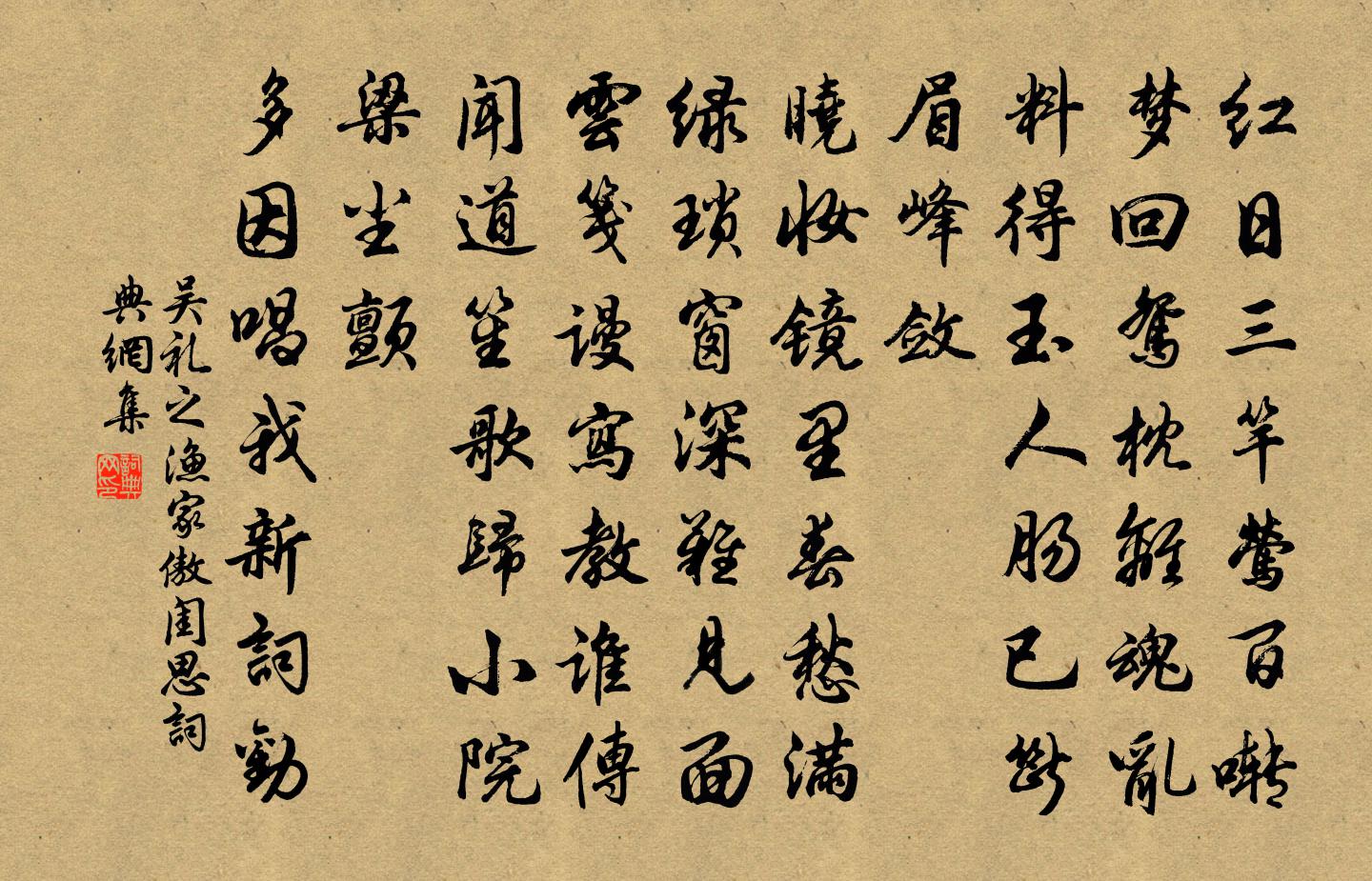 詩詞名句歷史字典書法欣賞書法字典國語詞典說文解字康熙字典古漢語字典標 題 作 者 詩 句 漁家傲(閨思)作者:吳禮之 朝代:宋代漁家傲(閨思)原文紅日三竿鶯百囀。夢回鴛枕離魂亂。料得玉人腸已斷。眉峰斂。曉妝鏡里春愁滿。綠瑣窗深難見面。雲箋謾寫教誰傳。聞道笙歌歸小院。梁塵顫。多因唱我新詞勸。詩詞問答問:漁家傲(閨思)的作者是誰?答:吳禮之問:漁家傲(閨思)寫於哪個朝代?答:宋代問:漁家傲(閨思)是什麼體裁?答:詞吳禮之漁家傲(閨思)書法欣賞漁家傲(閨思)書法作品詩詞推薦和隱老見懷二首吳芾〔宋代〕獨立溪頭悵望時,高人遺我送春詩。不知春色歸何處,月落空庭費夢思。讀吳怡詩卷二首張耒〔宋代〕羅田春動雪消初,主簿清詩雪不如。休學風騷窮事業,花前莫負古銅壺。西江月(壽詞)崔敦禮〔宋代〕暖日江南梅柳,春風堂上笙歌。滿斟醽醁笑聲嘩。再拜千年壽嘏。清健非緣服玉,紅顏不是蒼霞。仙姿福祿自無涯追和張學士從沂公游廣固城司馬光〔宋代〕蒼鵝集宋幕,游鹿上燕台。霸氣山河盡,王師江漢來。重圍經歲合,嚴鎖夜深開。廢殿余沙礫,頹牆翳草萊。清時西江月張榘〔宋代〕春事三分之二,落花庭院輕寒。翠屏圍夢寶熏殘。窗外流鶯聲亂。睡起猶支雪腕,覺來慵整雲鬟。閒拈樂府憑闌乾秋晚雜興陸游〔宋代〕老病侵凌不可當,時時攬鏡自悲傷。西風吹散朝來酒,依舊衰顏似葉黃。登峴首阻雨楊時〔宋代〕羊公風績幾經秋,獨繞龜趺為少留。欲問荊人尋舊事,一江清泚自東流。送實師弟釋重顯〔宋代〕天倫曾重意難分,爭奈孤蹤若斷雲。去去休同亮禪者,西山一入杳無聞。醉太平(送人入湘)王夢應〔宋代〕寒窗月晴。寒梢露明。一痕歸影燈青。又分攜短亭。蘅皋佩雲。蒸溪酒春。有誰勤說歸程。是峰頭雁聲。已亥雜詩 241龔自珍〔清代〕少年尊隱有高文,猿鶴真堪張一軍。難向史家搜比例,商量出處到紅裙。小舟游近村舍舟步歸陸游〔宋代〕借得漁船泝小溪,繫船浦口卻扶藜。莫言村落蕭條甚,也勝京塵沒馬蹄。北望感懷陸游〔宋代〕榮河溫洛帝王州,七十年來禾黍秋。大事竟為朋黨誤,遺民空嘆歲時遒。乾坤恨入新豐酒,霜露寒侵季子裘。食粟甘溪方信孺〔宋代〕甘溪依約舊城東,陵谷遷移一夢中。春盡踏青人不見,桄榔老大木棉紅。觀燈玉台體十首徐鉉〔唐代〕火樹燈山高入雲,紅筵翠幄自成春。游女有時還解佩,青樓何處不留人。楚觀歌趙汝鐩〔宋代〕吾聞楚鄉江山多勝處,今之楚觀尤得江山趣。萬象排拶索應酬,丹青閣筆無所措。大則湘水小臨蒸,眾流合派銀河嘆別羅鄴〔唐代〕北來南去幾時休,人在光陰似箭流。直待江山盡無路,始因拋得別離愁。一叢花陸游〔宋代〕尊前凝佇漫魂迷。猶恨負幽期。從來不慣傷春淚,為伊後、滴滿羅衣。那堪更是, * 池館,青子綠陰時。迴廊簾贈魏安石趙汝騰〔宋代〕彈鋏歸歟何太速,捫腹掀髯飽藷粥。囊空裘敝未一貧,剩買松明照幽讀。游太平寺趙蕃〔宋代〕一水縈紆渡,千松高下栽。童師空有塔,皖伯已無台。似為尋山至,那因問法來。茶香從汝供,詩味遣誰陪。次韻外舅黃虞卿為愛山園好八首喻良能〔宋代〕為愛山園好,紅塵半點無。自應成小隱,誰復嘆將蕪。香秫五十畝,黃柑二百株。何必隨俯仰,歸去亦良圖。名句推薦枉己者,未有能直人者也。孟子《孟子·滕文公章句下·第一節》 諸葛大名垂宇宙,宗臣遺像肅清高。杜甫《詠懷古蹟五首·其五》 憶君遙在瀟湘月,愁聽清猿夢裡長。王昌齡《送魏二》 人生天地之間,若白駒之過隙,忽然而已。莊子《莊子·外篇·知北游》 秋草六朝寒,花雨空壇。朱彝尊《賣花聲·雨花台》 鏡湖三百里,菡萏發荷花。李白《子夜吳歌·夏歌》 知恩不報,非為人也。施耐庵《水滸傳·第二十回》 雪中何以贈君別,惟有青青松樹枝。岑參《天山雪歌送蕭治歸京》 野客預知農事好,三冬瑞雪未全消。戴復古《除夜》 無求到處人情好,不飲任他酒價高。佚名《增廣賢文·上集》