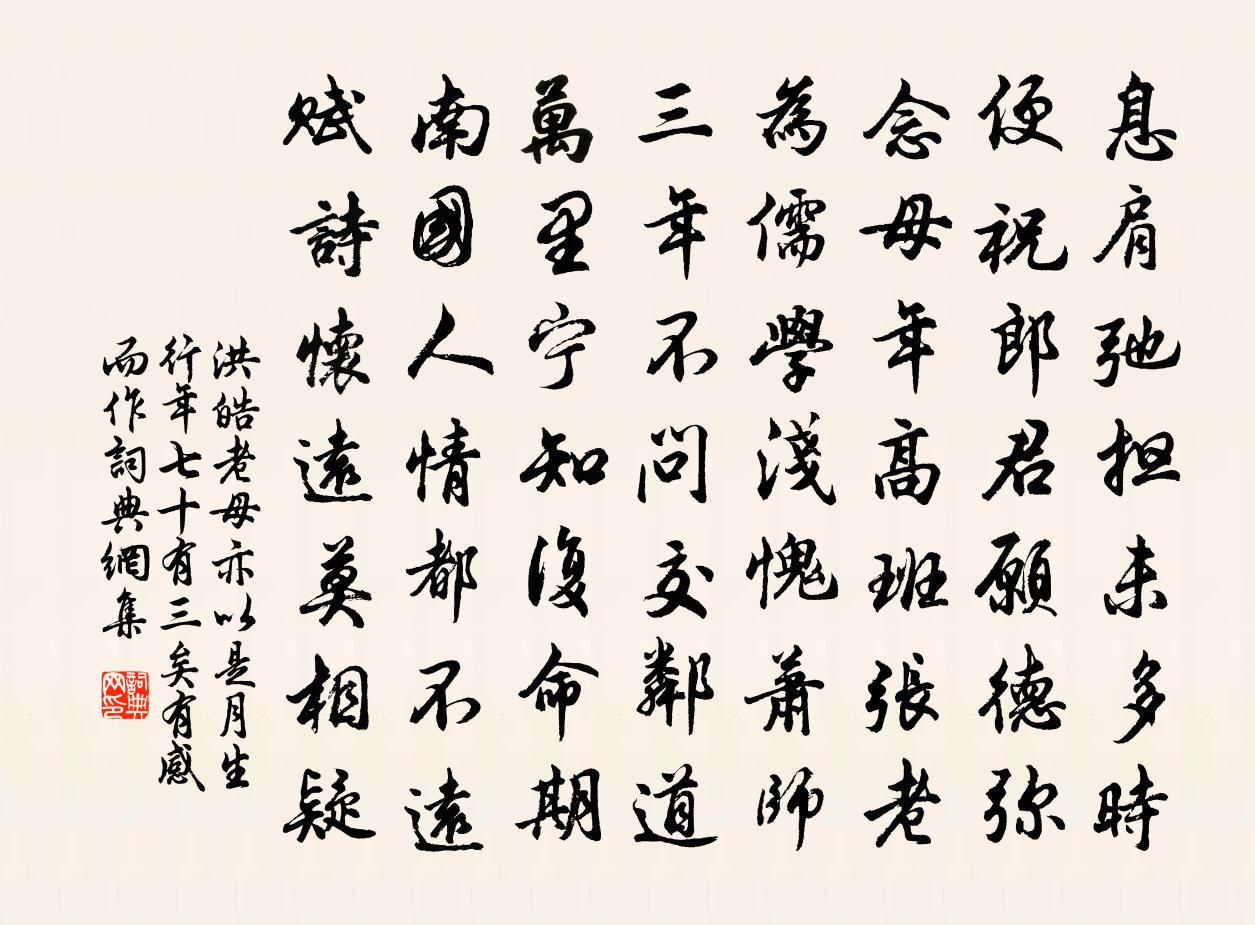 詩詞名句歷史字典書法欣賞書法字典國語詞典說文解字康熙字典古漢語字典標 題 作 者 詩 句 老母亦以是月生行年七十有三矣有感而作作者:洪皓 朝代:宋代原文息肩弛擔未多時,便祝郎君願德彌。念母年高班張老,為儒學淺愧蕭師。三年不問交鄰道,萬里寧知復命期。南國人情都不遠,賦詩懷遠莫相疑。詩詞問答問:《老母亦以是月生行年七十有三矣有感而作》的作者是誰?答:洪皓問:該詩寫於哪個朝代?答:宋代書法欣賞老母亦以是月生行年七十有三矣有感而作書法作品詩詞推薦送吳蜀州還朝郭印〔宋代〕達官視貧賤,遼絕間天壤。門牆奧莫窺,鼎茵恣居享。令行雷風前,氣吐虹霓上。陋彼衡門流,揮斥同草莽。堂堂百字謠/念奴嬌禪峰〔宋代〕中秋近也,正於門瑞氣,蔥蔥時節。隔歲維熊占吉夢,今夕天生英傑。仙籍流芳,瑞龍毓秀,應是非凡骨。詩書勛鷓鴣天劉辰翁〔宋代〕白髮平津起褎然。燕飛定遠望生還。世間最有團欒樂,又是平平過一年。銀信近,玉鞭先。東來西去爵銜鱔。人生參寥新秋帖贊岳珂〔宋代〕帖中書督字,法當為篤,世間豈有不識字參寥子耶。應世以文,特師以文,特師之粗,於此乎何拘,維以觀其書。沁園春(同前)劉克莊〔宋代〕我夢見君,戴飛霞冠,著宮錦袍。與牧之高會,齊山詩酒,謫仙同載,採石風濤。萬卷星羅,千篇電掃,肯學窮兒題孟處士宅張祜〔唐代〕高才何必貴,下位不妨賢。孟簡雖持節,襄陽屬浩然。鵲橋仙姬翼〔元代〕妻男鐵鎖。家緣猛火。煎近猖狂怎么。蠅頭蝸角有多來,便捨命、爭人競我。執迷不躲。甘心籠里。黑謎猜他不破和吳侍郎答汝州諸官唱酬之作宋庠〔宋代〕青管裁篇屬舊僚,賡歌奇意亦飄飄。橫徽曲妙誰逃賞,過物風清盡應簫。此路煙霞催入洛,他年簪笏慶歸朝。乘秋經理武夷書院熊禾〔宋代〕大隱東南第幾峰,我思論學武夷翁。春秋時義今如昨,文獻風流已不同。陽欲復時宜靜俟,道當窮處有時通。先生次岳尚書韻王諶〔宋代〕細字書橫雙眼明,破窗閱盡幾陰晴。年來乾祿渾夢行,老去吟詩尚有情。謾向紙田耕石硯,斷無金縷侑銀觥。和篇無題王灼〔宋代〕桐孫枝有海潮音,玉指初調萬簌沉。燭影熒熒鎖窗底,此時端欲見琴心。破陣子陸游〔宋代〕看破空花塵世,放輕昨夢浮名。蠟屐登山真率飲,筇杖穿林自在行。身閒心太平。料峭餘寒猶力,廉纖細雨初晴。陽關曲蘇軾〔宋代〕暮雲收盡溢清寒。銀汗無聲轉玉盤。此聲此夜不長好,明月明年何處看。歸時作黃子信〔宋代〕笑倩西風指舊埃,歸時行李似初來。也知三載清貧好,傅得一家強健回。雨中梅葉茵〔宋代〕竛竮竹外枝,啼妝凌曉霰。東君不主盟,對人作此面。和羅舜舉廖行之〔宋代〕岸岸花飛客思濃,拍空煙水與天東。暮雲橫嶺依依碧,朝日翻波袞痛紅。鷗共忘機元自適,鼉猶鳴鼓定誰攻。憑欄別一章改韻同五詩呈堯夫司馬光〔宋代〕家雖在城闕,蕭瑟似山阿。遠去名利窟,自稱安樂窩。雲歸白石洞,鶴立碧松柯。得喪非吾事,何須更寤歌。村郭寒食雨中作穆修〔宋代〕寂寥村郭見寒食,風光更著微雨遮。鞦千閒垂愁稚子,楊柳半濕眠春鴉。白社皆驚放狂客,青錢盡送沽酒家。眼前感事石介〔宋代〕吾賞觀中夏,地平如砥石。幅員數萬里,車馬通轍跡。帝宅君土中,紫垣當辰極。長江斷其南,絕塞經其北。東海縣尉廨宇蓮池邵雍〔宋代〕縣尉小齋前,水清池有蓮。豈唯觀菡萏,兼可聽潺湲。宛類江湖上,殊非塵土邊。古人用心處,料得不徒然。名句推薦一年春又盡,倚杖對斜暉。左緯《春晚》 一者階於道,幾於神。姜子牙《六韜·文韜·兵道》 紅深綠暗徑相交,抱暖含芳披紫袍。溫庭筠《寒食日作》 重陽佳節意休休,與客攜壺共上樓。姜塘《摘星樓九日登臨》 有鳥鷙立,羽翼張。柳宗元《唐鐃歌鼓吹曲十二首·其四》 佇久河橋欲去,斜陽淚滿。吳文英《三姝媚·過都城舊居有感》 路逢俠客須呈劍,不是才人莫獻詩。佚名《增廣賢文·上集》 一枕新愁,殘夜花香月滿樓。項鴻祚《減字木蘭花·春夜聞隔牆歌吹聲》 落日心猶壯,秋風病欲疏。杜甫《江漢》 孤雁飛南遊,過庭長哀吟。曹植《雜詩六首·其一》