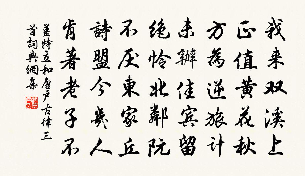 詩詞名句歷史字典書法欣賞書法字典國語詞典說文解字康熙字典古漢語字典標 題 作 者 詩 句 和唐戶古律三首作者:姜特立 朝代:宋代和唐戶古律三首原文我來雙溪上,正值黃花秋。方為逆旅計,未辦佳賓留。絕憐北鄰阮,不厭東家丘。詩盟今幾人,肯著老子不。詩詞問答問:和唐戶古律三首的作者是誰?答:姜特立問:和唐戶古律三首寫於哪個朝代?答:宋代姜特立和唐戶古律三首書法欣賞和唐戶古律三首書法作品詩詞推薦泛江偶成張耒〔宋代〕扁舟漾寒水,暫使客心清。天與秋陰合,江連野色平。洪波回赤壁,蒼野帶孤城。更想孫郎戰,臨風動壯情。夢中作晁公溯〔宋代〕舉鞭重到故都行,予亦咨嗟恨不勝。心與隴雲留漢苑,目隨煙樹繞秦陵。送進士田卓入華山姚合〔唐代〕何物隨身去,六經與一琴。辭家計已久,入谷住應深。偶坐僧同石,閒書葉滿林。業成須謁帝,無貯白雲心。和訥齋題曉山亭杜范〔宋代〕理粲萬象,孰妙孰徼。卓彼南山,目游心討。露氣澄澈,淨不容掃。瑟瑟風松,剪剪煙篠。甘夢未覺,一聲晨鳥。偈頌二百零五首釋正覺〔宋代〕九月又重陽,菊華依舊黃。淵明是醉不是酒,蕩蕩游心於大方。三月十八日雨後訪張二十五以詩見寄次其韻范祖禹〔宋代〕池上魚相樂,林間鳥不驚。雨余荷氣濕,風動水紋生。俗客心猶爽,高人興自清。何時作鄰里,卜宅翦榛荊。巫山歌孫應時〔宋代〕平生想巫山,奇絕冠三峽。及茲飽雙眸,無乃天下甲。遠看插天碧叢叢,近看玲瓏金玉峰。垠岩光彩相映發,交絡雜曲歌辭。古別離吳融〔唐代〕紫燕黃鵠雖別離,一舉千里何難追。猶聞啼風與叫月,流連斷續令人悲。賦情更有深繾綣,碧甃千尋尚為淺。蟾蜍希有鳥吟何夢桂〔宋代〕穹壤紛眾羽,固有仁不仁。鴞鳳雖異性,同為陰陽根。惟彼希有鳥,於禽集大成。力可振海岳,翂翐似無能。鯤鵬題章野人山居(一作馬戴詩)秦系〔唐代〕帶郭茅亭詩興饒,回看一曲倚危橋。門前山色能深淺,壁上湖光自動搖。閒花散落填書帙,戲鳥低飛礙柳條。向此示梅山寧老二首趙蕃〔宋代〕梅山不見梅夫子,宗派仍亡宗上人。梅句不刊宗有集,山應生喜亦生嗔。踏莎行錢宀孫〔宋代〕征雁雲深,亂蛩寒淺。驚心怕見年華晚。蕭疏堤柳不禁霜,江梅瘦影清相伴。舞暗香茵,歌闌團扇。月明夢繞天涯點絳唇 長安中作元好問〔金代〕沙際春歸,綠窗猶唱留春住。問春何處。花落鶯無語。渺渺吟懷,漠漠煙中樹。西樓暮。一簾疏雨。夢裡尋春去。次韻太學宋學正遐叔考試小疾見寄晁補之〔宋代〕蕭然如裴叔則,頰毛疏復長。邈然如王夷甫,高致宜廟廊。功名四皓雲泉外,詩賦三閭草木香。君莫夸熙寧登科面奉和崔尚書贈大理陸卿鴻臚劉卿見示之作蘇頲〔唐代〕戲藻嘉魚樂,棲梧見鳳飛。類從皆有召,聲應乃無違。美價逢時出,奇才選眾稀。避堂貽後政,掃第發前幾。出曳山居二首袁燮〔宋代〕城居未免囂塵役,野處閒觀德性初。究竟孰為清與濁,此心巡處即吾廬。論詩三十首·其一元好問〔金代〕漢謠魏什久紛紜,正體無人與細論。 誰是詩中疏鑿手,暫教涇渭各清渾。 送漢陽軍鞏教授項安世〔宋代〕今代清時有鞏兄,世間無處著才情。洗乾螺黛姿仍好,挽出鯨魚意轉平。千古未吟渠忽到,傍人不解我先驚。何如子駿運使八詠堂巽堂文同〔宋代〕華堂聳嚴台,地勢側隨水。高臨巽宮上,其取名以是。峨峨寶峰頂,日影正辰已。繚棧入雲林,詰屈如篆字。輕霏送林子長赴姑孰泮宮虞儔〔宋代〕綠波風駛引征帆,九萬扶搖入羽翰。詩句最憐雲不定,宦情況與月同寒。襟期莫作別時惡,出處須留晚歲看。漫道名句推薦最是多情汴堤柳,春來依舊帶棲鴉!曾棨《維揚懷古》 凍風時作,作則飛沙走礫。袁宏道《滿井遊記》 義典則弘,文約為美。劉勰《文心雕龍·銘箴》 痛飲狂歌空度日,飛揚跋扈為誰雄。杜甫《贈李白》 日暮東風怨啼鳥,落花猶似墜樓人。杜牧《金谷園》 征馬分飛日漸斜,見此空為人所嗟。孟浩然《高陽池送朱二》 三月休聽夜雨,如今不是催花。張炎《清平樂·采芳人杳》 壚邊人似月,皓腕凝霜雪。韋莊《菩薩蠻·人人盡說江南好》 青楓颯颯雨淒淒,秋色遙看入楚迷。李攀龍《送明卿之江西》 蝴蝶不傳千里夢,子規叫斷三更月。辛棄疾《滿江紅·點火櫻桃》