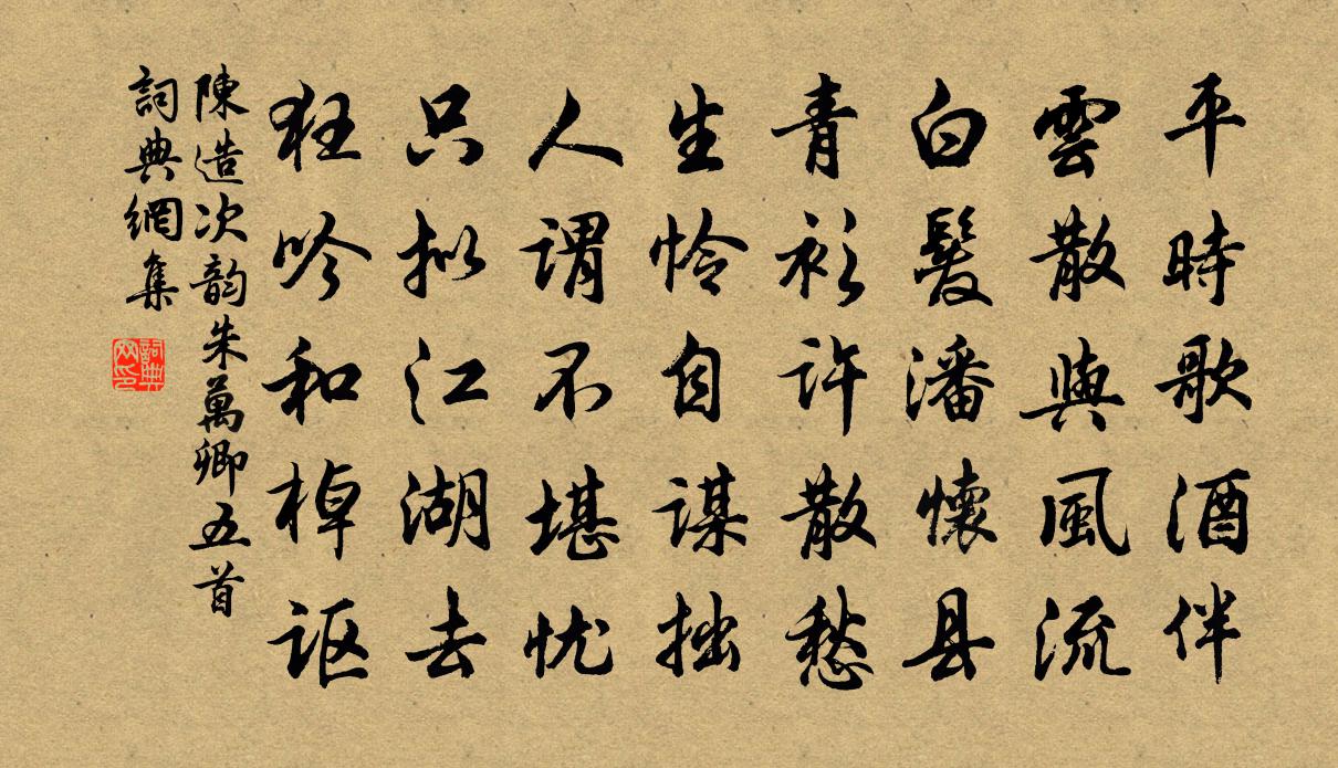 詩詞名句歷史字典書法欣賞書法字典國語詞典說文解字康熙字典古漢語字典標 題 作 者 詩 句 次韻朱萬卿五首作者:陳造 朝代:宋代次韻朱萬卿五首原文平時歌酒伴,雲散與風流。白髮潘懷縣,青衫許散愁。生憐自謀拙,人謂不堪憂。只擬江湖去,狂吟和棹謳。詩詞問答問:次韻朱萬卿五首的作者是誰?答:陳造問:次韻朱萬卿五首寫於哪個朝代?答:宋代陳造次韻朱萬卿五首書法欣賞次韻朱萬卿五首書法作品詩詞推薦故殿撰修史李舍人挽章二首曹彥約〔宋代〕丁未慈恩盛,從容最後來。一從辭墨綬,三徙入鳥台。記動時方好,持衡去不回。恩榮頻出綍,晚遇有餘哀。春日懷錢塘西湖袁說友〔宋代〕困臥籃輿中,醒視人影直。伸頭起四望,不斷山環碧。羊腸路百轉,當面一蹲石。高廣不可際,隆重誰與匹。宛如奉和始平公酬大將佩和吳侍郎司馬光〔宋代〕道盛經綸業,文高翰墨場。雍容偃藩地,密邇釣璜鄉。回首紅塵遠,清心白日長。山形抱城堞,豀影照公堂。{左三山先賢祠落成八首熊禾〔宋代〕武夷九曲水,流出三神山。考亭得勉齋,壁立孔門顏。信齋繼其志,經禮賴以完。六經復其一,百世功不刊。偶題五言絕句五首方回〔宋代〕為客彈長鋏,□□□短衣。奈何年不肯,五過古來希。趙開府訪霞谷次韻謝之釋智愚〔宋代〕旌幢天外見,縹緲谷中來。望重草先偃,山靈雲自開。禪衣坐幽石,棕柄拂清埃。勳業凌煙上,難教隱釣台。清明後登城眺望劉長卿〔唐代〕風景清明後,雲山睥睨前。百花如舊日,萬井出新煙。草色無空地,江流合遠天。長安在何處,遙指夕陽邊。江樓獨酌懷從叔李群玉〔唐代〕水國發爽氣,川光靜高秋。酣歌金尊醁,送此清風愁。楚色忽滿目,灘聲落西樓。雲翻天邊葉,月弄波上鉤。芳意奉答宋中道服除還朝示親友韓維〔宋代〕喧然佳句落神都,哀此援琴尚有餘。未見校文登子政,空傳為賦似相如。道存固可輕華冕,談進當知得異書。推轂壬戌立春日王炎〔宋代〕晼晼流年度,淒涼短景催。月圓疑臘半,歲閏已春回。一箸青絲菜,三杯白玉醅。主人無喜事,蠟炬誤花開。偈頌五十一首釋大觀〔宋代〕凌霄跨灶,凌滅吾宗。危分險布,鐵綱千重。三更白如晝,掇轉太虛空。幻智庵前覓不得,蕭蕭松竹引清風。湖州竹枝詞張雨〔元代〕臨湖門外是儂家,郎若閒時來吃茶。黃土築牆茅蓋屋,門前一樹紫荊花。 賀新郎 邑中園亭,仆皆為賦此詞。一日,辛棄疾〔宋代〕甚矣我衰矣!悵平生、交遊零落,只今余幾?白空垂三千丈,一笑人間萬事。問何物、能令公喜?我見青山多嫵和微之十七與君別及隴月花枝之詠白居易〔唐代〕別時十七今頭白,惱亂君心三十年。垂老休吟花月句,恐君更結後身緣。幽事陸游〔宋代〕曳杖驚林鵲,投竿罥澗花。若非詩滿卷,只道夢還家。開士分朝飯,鄰翁喚午茶。悠然吾事足,歸路並山斜。禪人請贊釋鹹傑〔宋代〕水黑染成,恰似真箇。據坐胡床,胡揮亂做。三十年後,此話大行。籍沒乃翁,膠黏滯貨。贈日者楊應齋徐元傑〔宋代〕爛柯山客命能知,人事更番一局棋。甜卦易窮行苦卦,此時相語驗他時。窮通任理胡不可,災福緣人要自持。我老陳氏童子草書歌皎然〔唐代〕書家孺子有奇名,天然大草令人驚。僧虔老時把筆法,孺子如今皆暗合。飆揮電灑眼不及,但覺毫端鳴颯颯。有時示程生二首胡寅〔宋代〕利域名途較少多,人生那用學燈蛾。如君甘作長貧士,視古寧慚獨行科。可羅時煩意寵顧,鳶嘗跕處重經過。扁舟和仲長統詩二首郭印〔宋代〕造化一機,乾坤一殼。死生蟲臂,勝負蝸角。達人於道,混混殊俗。瞽非喪明,刖非卞足。賊生戶牖,禍徵帷幄。名句推薦昨夜雨疏風驟,濃睡不消殘酒。李清照《如夢令·昨夜雨疏風驟》 醉後涼風起,吹人舞袖回。李白《與夏十二登岳陽樓》 枯楊枯楊爾生稊,我獨七十而孤棲。李白《雉朝飛》 不怕三十而死,只怕死後無名。佚名《增廣賢文·下集》 蓬門未識綺羅香,擬托良媒益自傷。秦韜玉《貧女》 上有愁思婦,悲嘆有餘哀。曹植《明月上高樓》 西宮南內多秋草,落葉滿階紅不掃。白居易《長恨歌》 此意有誰知,恨與孤鴻遠。楊無咎《生查子·秋來愁更深》 有善始者實繁,能克終者蓋寡吳兢《貞觀政要·卷一·論君道》 想當年,金戈鐵馬,氣吞萬里如虎。辛棄疾《永遇樂·京口北固亭懷古》