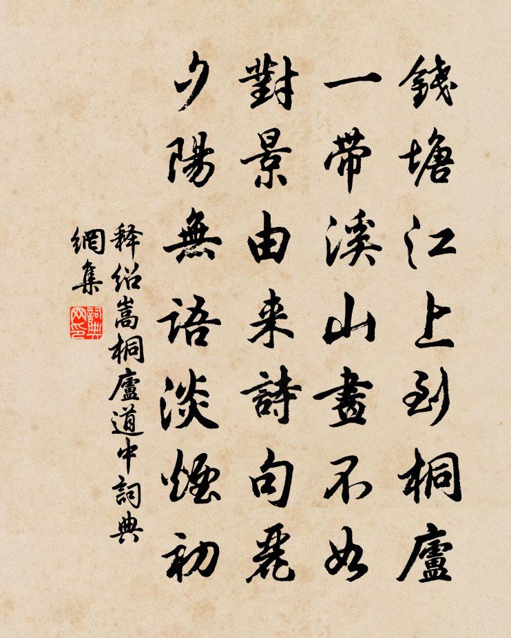 詩詞名句歷史字典書法欣賞書法字典國語詞典說文解字康熙字典古漢語字典標 題 作 者 詩 句 桐廬道中作者:釋紹嵩 朝代:宋代桐廬道中原文錢塘江上到桐廬,一帶溪山畫不如。對景由來詩句麗,夕陽無語淡煙初。詩詞問答問:桐廬道中的作者是誰?答:釋紹嵩問:桐廬道中寫於哪個朝代?答:宋代釋紹嵩桐廬道中書法欣賞桐廬道中書法作品詩詞推薦鳳棲梧/蝶戀花杜安世〔宋代〕別浦遲留戀清淺。菱蔓荷花,盡日妨鉤線。向晚澄江靜如練。風送歸帆飛似箭。鷗鷺相將是家眷。坐對雲山,一任次韻能之賀除徐僑〔宋代〕初無家學贍三餘,濫被君恩有此除。非取金華能占對,但令東觀與觀書。汗顏莫稱英髦選,冷眼終輸山澤居。自昔山庵睡起吳晦之〔宋代〕策蹇尋幽過草堂,困來欹枕臥禪床。鳥啼花落春風裡,睡起不知春晝長。贈仲國美陳造〔宋代〕三閱春光一建瓴,依然歸棹泊危亭。烏迎客子各頭白,柳學故人俱眼青。曾是縱譚僵婢僕,又成豪飲臥罍瓶。明朝與高紫微雪溪餞客雖已預盟然坐次予每居上為岳珂〔宋代〕碧梧正耐雪溪秋,況是西風送客舟。華宴雖思奉婪尾,粗官何敢作遨頭。達尊諒識詩囊意,負約仍輸酒斛籌。想見振策釋紹嵩〔宋代〕振策出遊眺,清吟竹景東。石門千仞斷,秀水一篙通。郡閣煙光裹,人家秋色中。烏衣多勝概,老了奈途窮。袁公濟和劉景文登介亭詩複次韻答之蘇軾〔宋代〕昏昏墮醉夢,奈此六月溽。君詩如清風,吹我朝睡足。登臨得佳句,江白照湖淥。袖手獨不言,默稿已在腹。是時栽梅郭印〔宋代〕平生不愛花,獨喜雪中梅。江皋無人問,移近小亭栽。連朝勤培溉,的皪犯寒開。青枝綴瓊粒,絳萼扶冰腮。奇哉分繡閣夜作二首高似孫〔宋代〕一燈炯微明,敲盡寒更永。老蛩泣月罅,脆葉鳴霜井。此事誰主宰,凡物皆動靜。不了達者觀,卻似醉難醒。久無喜遷鶯佚名〔宋代〕古今三絕。惟鄭國三良,漢家三傑。三俊才名,三儒文學,更有三君清節。爭似一門三秀,三子三孫奇特。人總道送陸侍御還越韋應物〔唐代〕居藩久不樂,遇子聊一欣。英聲頗籍甚,交辟乃時珍。繡衣過舊里,驄馬輝四鄰。敬恭尊郡守,箋簡具州民。謬忝阮郎歸·湘天風雨破寒初秦觀〔宋代〕湘天風雨破寒初。深沉庭院虛。麗譙吹罷小單于。迢迢清夜徂。鄉夢斷,旅魂孤。崢嶸歲又除。衡陽猶有雁傳書。與崔子向泛舟自招橘經箬里宿天居寺…聯一十六韻以寄之皎然〔唐代〕晴日春態深,寄游恣所適。 ——皎然寧妨和傅山父小園十詠李曾伯〔宋代〕喬木豈能忘故國,結茅聊復紀新亭。此君玉立傍無友,猶有幽禽靜可聽。清溪逢故人秦觀〔宋代〕共約來春會,牙檣發畫船。和風楊柳岸,微雨杏花天。故國應攜手,前途共箸鞭。吳兒看環佩,珠樹秀嬋娟。山林釋文珦〔宋代〕舊無卓錐地,今者亦忘錐。中心子無著,清淨如流離。野猿偶然來,問我何所為。道我此意真,長嘯不相疑。生平黃榦〔宋代〕生平因寡合,歲晚交更少。非乾世俗薄,自是志量小。延祥寺耿南仲〔宋代〕羅浮仙客隱,準擬訪丹台。為國身將老,逢山眼倍開。月依松上過,風自竹間來。僧欲延清話,茶香屢撥灰。偈傾一百六十九首釋智朋〔宋代〕平地起堆從古有,青天霹靂避猶難。杖頭自有通方眼,風月一天非等閒。五月二十八日四絕舒岳祥〔宋代〕雨來元有路,內過本無痕。小立清溪曲,欹眠白石根。名句推薦舌為利害本,口是禍福門。馮夢龍《醒世恆言·卷二十九》 不患人之不己知,患不知人也。孔子弟子《論語·學而篇》 煢煢白兔,東走西顧。佚名《古艷歌》 相思難表,夢魂無據,惟有歸來是。歐陽修《青玉案·一年春事都來幾》 誰言千里自今夕,離夢杳如關塞長。薛濤《送友人》 馬嘶經戰地,雕認打圍山。王鎡《塞上曲》 非其地而樹之,不生也。劉向《說苑·雜言》 春風倚棹闔閭城,水國春寒陰復晴。劉長卿《別嚴士元》 夫君子之行,靜以修身,儉以養德。諸葛亮《誡子書》 己不自信,何以信於人?張廷玉《明史·列傳·卷四十九》