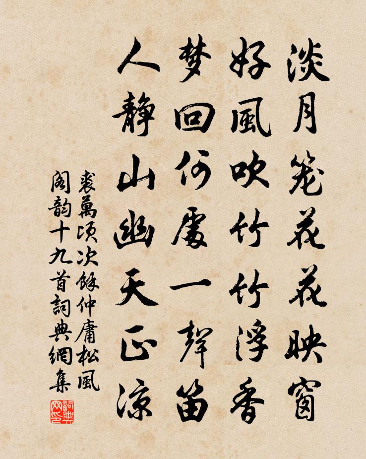 詩詞名句歷史字典書法欣賞書法字典國語詞典說文解字康熙字典古漢語字典標 題 作 者 詩 句 次余仲庸松風閣韻十九首作者:裘萬頃 朝代:宋代次余仲庸松風閣韻十九首原文淡月籠花花映窗,好風吹竹竹浮香。夢回何處一聲笛,人靜山幽天正涼。詩詞問答問:次余仲庸松風閣韻十九首的作者是誰?答:裘萬頃問:次余仲庸松風閣韻十九首寫於哪個朝代?答:宋代裘萬頃次余仲庸松風閣韻十九首書法欣賞次余仲庸松風閣韻十九首書法作品詩詞推薦南歌子佚名〔宋代〕禁苑沈沈靜,春波漾漾行。仙姿才韻兩相併。葉上題詩、千古得佳名。牆外分明見,花間隱約聲。銀鉤擲處眼雙明賦梅彭岩肖〔宋代〕清獻堂前樹,無梢可著春。豈知三百載,復有種花人。次韻邵僉判幽居於石〔宋代〕閉門久不出,摩挲鬢欲翁。有杯問明月,無扇障西風。神駿老嘶櫪,紙鳶高入空。天應憐我懶,瓜圃自泉通。道人歌楊維楨〔元代〕道人飛來朗風岑,玄都上下三青禽。傅桑已作青海斷,鰲丘又逐羅浮沉。初見蜍精生月腹,前身搗藥婆娑明。還仙大德歌·冬關漢卿〔元代〕雪紛紛,掩重門,不由人不斷魂,瘦損江梅韻。那裡是清江江上村?香閨里冷落誰瞅問?好一個憔悴的憑欄人!同子瞻賦游惠山三首秦觀〔宋代〕樓觀相復重,邈然閟深樾。九龍吐清泠,虢虢曾未絕。罌缶馳千里,真珠猶不滅。況復從茶僊,茲焉試葵月。岸巾廣化遇雨張耒〔宋代〕浮雲蔽高峰,台殿延晚色。風聲轉谷豪,雨腳射山白。東樓瞰虛明,龍甲排松柏。蕭森異人境,坐視動神魄。撞鐘登盤陀石釋紹嵩〔宋代〕盤陀石上少從容,秋色偏宜晚望中。欲賦勝游無傑句,獨搔蓬鬢立西風。出居十六詠幽谷方岳〔宋代〕入林不厭深,避世不厭獨。倦飛鳥知還,毋憚下喬木。過呂城閘六首楊萬里〔宋代〕閘頭洲子許團欒,古廟蕭條暮雨寒。榆柳千株無半葉,各青一樹碧琅玕。次韻和盛博士喜梅大丞授戶部判官楊億〔宋代〕新來乘傳抵秦川,會府須才果峻遷。應見流錢從地上,物聞聚米向君前。聲華南國推高士,名姓丹台綴列仙。每話招黃魏二生陳師道〔宋代〕出門不雨即偶風,閉門值睡極力攻。似聞湯鼎作吟聲,已賀勝敵收全功。郤思二子共一笑,撥棄舊語無新工。卒行送吳正仲婺倅歸梅溪待闕梅堯臣〔宋代〕山水東陽去未去,朋親苕霅朝復朝。更無越相逃名舸,猶看吳王送女潮。海燕歸齊聲滿屋,溪梅開過子生條。明年重送杜牧〔唐代〕手撚金僕姑,腰懸玉轆轤。爬頭峰北正好去,系取可汗鉗作奴。六宮雖念相如賦,其那防邊重武夫。亦好園海棠秋開紅英滿樹喻良能〔宋代〕微雲澹日映寒流,畫出西園一幅秋。白帝幻成紅玉蘂,金風吹綻碧枝頭。睡余艷艷真妃子,夢罷愔愔一解愁。熟賞立春帖子太上皇帝閣周必大〔宋代〕氣沖魚鑰敞金扉,風射蛟冰泮玉池。從此苑中多樂事,和詩誰是沈佺期。賀新郎(海棠次劉草窗韻)佚名〔宋代〕舊事憑誰訴。記錦宮、初試農妝,前身天女。玉輦行春嬌待夜,浴殿溫泉輕注。一點點、猩紅啼吐。繡幄篝香春睡中秋日菊盛開家鉉翁〔宋代〕蓓蕾黃花當徑開,朣朧佳月出雲來。中秋見菊從前少,端為瀛公詩句催。贈久軒提刑江東二首湯漢〔宋代〕向來廷靜偉堂堂,不負西山與紫陽。盡道拾遺當召黯,不應甭詔久煩滂。真儒事業誰能測,憂國忠純不謾狂。一上臨城道中作蘇軾〔宋代〕逐客何人著眼看,太行千里送征鞍。未應愚谷能留柳,可獨衡山解識韓。名句推薦想牧之、千載尚神遊,空山冷。吳潛《滿江紅·齊山繡春台》 長江如虹貫,蟠繞其下。宋濂《閱江樓記》 愁煩中具瀟灑襟懷,滿抱皆春風和氣王永彬《圍爐夜話·第七八則》 今夜故人來不來,教人立盡梧桐影。呂岩《梧桐影·落日斜》 丈夫為志,窮當益堅,老當益壯。范曄《後漢書·列傳·馬援列傳》 落日心猶壯,秋風病欲疏。杜甫《江漢》 憂勞可以興國,逸豫可以亡身歐陽修《伶官傳序》 百二禁兵辭象闕,三千宮女下龍舟。許渾《汴河亭》 君子以成德為行,日可見之行也。佚名《易傳·文言傳·乾文言》 馬上逢寒食,愁中屬暮春。宋之問《途中寒食題黃梅臨江驛寄崔融》