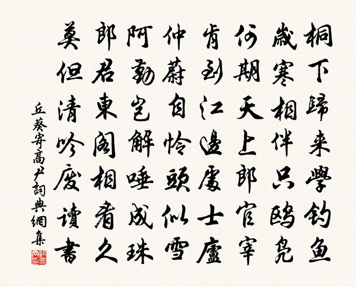 詩詞名句歷史字典書法欣賞書法字典國語詞典說文解字康熙字典古漢語字典標 題 作 者 詩 句 寄高尹作者:丘葵 朝代:宋代寄高尹原文桐下歸來學釣魚,歲寒相伴只鷗鳧。何期天上郎官宰,肯到江邊處士廬。仲蔚自憐頭似雪,阿勤豈解唾成珠。郎君東閣相看久,莫但清吟廢讀書。詩詞問答問:寄高尹的作者是誰?答:丘葵問:寄高尹寫於哪個朝代?答:宋代丘葵寄高尹書法欣賞寄高尹書法作品詩詞推薦八月十四夜趙處澹〔宋代〕洲渚雲飛盡,江流碧映天。明朝秋欲半,今夜月先圓。玉宇濃垂露,銀河冷墜煙。焦桐彈一曲,孤鶴舞風前。南野暮鎔鄭瀛〔宋代〕村南野老亦多伎,兩鬢鬔松狀如鬼。嬴顛秦蹶了不聞,一心只向紅爐裹。風鞴在手金在鎔,等閒變化天無工。日暮春日早朝應制戴叔倫〔唐代〕仙仗肅朝官,承平聖主歡。月沈宮漏靜,雨濕禁花寒。丹荔來金闕,朱櫻貢玉盤。六龍扶御日,只許近臣看。武林書事九首方回〔宋代〕金石典古呂伯可,風霜清聳方巨山。尚見八音合韶樂,早能九鼎象神奸。黃鶯貫休〔唐代〕一種為春禽,花中開羽翼。如何此鳥身,便是黃金色。黃金色,若逢竹實終不食。夜句三首陳師道〔宋代〕短短長長柳,三三五五星。斷雲當極目,不盡遠峰青。賀岷州守種誼破鬼章二首游師雄〔宋代〕圍合洮州敵未知,煙雲初散見旌旗。忽驚漢將從天下,始恨羌酋送死遲。江行早發齊己〔唐代〕舟子相呼起,長江未五更。幾看星月在,猶帶夢魂行。鳥亂村林迥,人喧水柵橫。蒼茫平野外,漸認遠峰名。天柱杜范〔宋代〕削成一柱是何年,屹立當空更不偏。我欲借渠成大廈,少陵此意久無傳。西軒同諸君探題得奩韓維〔宋代〕簡素與夙尚,提攜得茲器。春芳席餘紅,夏木蔭初翠。酣游性所適,甘脆略雲備。獨愧顏氏子,終朝守簞食。閒思陸游〔宋代〕畢世為農不復疑,還東六見歲陰移。閉門旋了和詩債,賣藥不償沽酒資。意倦投床效龜息,齒疏嚼飯類牛齝。兀然上已呈嚴叟葛天民〔宋代〕時俗常談已斷霜,雨寒翻著絮衣裳。花枝照眼堂堂去,茗碗關心故故香。楊柳稍傳鶯割據,茅茨敢望燕商量。舊遊游水東諸洞次同游韻二首劉克莊〔宋代〕舊聞岩洞勝,欲往自髫年。聳秀過靈隱,幽深似善權。遠環州堞外,近獻屋檐邊。儻有登臨約,甘為子執鞭。松屋釋文珦〔宋代〕試問青松若個栽,僧門只向樹邊開。月明定有仙人過,露滴頻聞野鶴回。千歲老根成虎魄,幾尋枯乾裹莓苔。住來送沈侍郎貫休〔唐代〕從知無遠近,木落去閩城。地入無諸俗,冠峨甲乙精。山多高興亂,江直好風生。儉府清無事,唯應薦禰衡。送劉虛白二首歐陽修〔宋代〕我嗟韁鎖若牽拘,久羨南山去結廬。自顧豈勞君借譽,偶然章服裹猿狙。示徒釋印肅〔宋代〕未得塵勞息,須依善知識。若肯慈悲學,發願施心力。入泥併入水,莫作閒戲劇。揚眉動目庭,法身無窮極。於中偶書楊簡〔宋代〕無聲之樂聞四方,純德孔明即就將。哀樂相生不可見,衾衾非燠箑非涼。秋毫莫大泰山小,殤子上壽彭祖夭。入門次韻朱晦翁十梅嶺梅王炎〔宋代〕北枝未春風,南枝先暖雪。吹香只自憐,驛使音塵絕。鄴都懷古劉滄〔唐代〕昔時霸業何蕭索,古木唯多鳥雀聲。芳草自生宮殿處,牧童誰識帝王城。殘春楊柳長川迥,落日蒹葭遠水平。一望名句推薦握手經年別,驚心九日霜。妙信《九日酬諸子》 把酒對斜日,無語問西風。楊炎正《水調歌頭·把酒對斜日》 新啼痕壓舊啼痕,斷腸人憶斷腸人。王實甫《十二月過堯民歌·別情》 夫君子之行,靜以修身,儉以養德。諸葛亮《誡子書》 何處飛來林間鵲,蹙踏松梢微雪。辛棄疾《賀新郎·把酒長亭說》 彩舟載得離愁動。無端更借樵風送。賀鑄《菩薩蠻·彩舟載得離愁動》 此後錦書休寄,畫樓雲雨無憑。晏幾道《清平樂·留人不住》 鳥飛千白點,日沒半紅輪。白居易《彭蠡湖晚歸》 道可道,非常道;名可名,非常名。劉安及其門客《淮南子·道應訓》 數點雨聲風約住,朦朧淡月雲來去李冠《蝶戀花·春暮》
