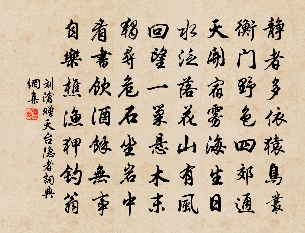 詩詞名句歷史字典書法欣賞書法字典國語詞典說文解字康熙字典古漢語字典標 題 作 者 詩 句 贈天台隱者作者:劉滄 朝代:唐代贈天台隱者原文靜者多依猿鳥叢,衡門野色四郊通。天開宿霧海生日,水泛落花山有風。回望一巢懸木末,獨尋危石坐岩中。看書飲酒余無事,自樂樵漁狎釣翁。詩詞問答問:贈天台隱者的作者是誰?答:劉滄問:贈天台隱者寫於哪個朝代?答:唐代問:贈天台隱者是什麼體裁?答:七律劉滄贈天台隱者書法欣賞贈天台隱者書法作品注釋全唐詩:卷586-41詩詞推薦登太白絕頂龍池望遠釋文珦〔宋代〕蒼莽勢連空,躋攀徑絕蹤。亂峰排似戰,片石響於鍾。鳥語春雲密,龍歸暮雨重。下觀群岫小,始覺此為宗。鷓鴣天(深秋悲感)趙長卿〔宋代〕亭樹蕭蕭生暮涼。安排清夢到胡床。楚山楚水秋江外,江北江南客恨長。苹渚冷,橘汀黃。斷魂殘夢更斜陽。欲將張七及辛大見尋南亭醉作(一作張七及辛大見訪)孟浩然〔唐代〕山公能飲酒,居士好彈箏。世外交初得,林中契已並。納涼風颯至,逃暑日將傾。便就南亭里,餘尊惜解酲。寄題安福彭文昌春風樓二首楊萬里〔宋代〕沂水何人解問津,樓中蠹簡拂蛛塵。杏花壇下朱弦瑟,十指風生別是春。送范西叔教授西歸張栻〔宋代〕乃祖至和間,忠謀書鼎彝。但知陛下聖,豈知吾言危。元佑愛君語,讀者猶涕洟。典刑今不亡,盛德故在茲。歲晚送趙仁則官滿西歸三首方回〔宋代〕宇宙今年氣數新,不愁無地著閒身。西成稼穡占魚夢,南紀干戈息馬塵。隨分田園勝仕宦,及時兒女了婚姻。細思宿龍瑞山房次周雲隱韻黃庚〔宋代〕木葉秋容瘦,客懷思故鄉。淡雲微見月,薄露不成霜。忽忽朱顏改,悠悠白日長。空心仍獨夜,減盡昔年狂。雙魚花朱翌〔宋代〕物生本不同,所貴以形似。如何小草間,或作潛淵類。宛然花葉分,有此尾鬣備。如以柳貫腮,十百共一蒂。可肩移居北新橋彥質惠詩和答程公許〔宋代〕束書欲去意遲遲,從此寧無一會期。客路相逢如宿契,人生難得是間時。虛廊過午陪行食,淨院中宵共說詩。此樂秦淮雜詩王士禎〔清代〕新歌細字寫冰紈,小部君王帶笑看。千載秦淮嗚咽水,不應仍恨孔都官[1]。與南陵常贊府游五松山(山在南陵銅井西五里有古精舍)李白〔唐代〕安石泛溟渤,獨嘯長風還。逸韻動海上,高情出人間。靈異可並跡,澹然與世閒。我來五松下,置酒窮躋攀。征古沁園春(送洪漕使憲閩)李曾伯〔宋代〕天目山房,洪崖老仙,親授一燈。自檄草參籌,賓筵領袖,鼎梅助味,省闥權衡。 * 文章,立朝風力,猶有老成西暉亭王禹偁〔宋代〕孤亭疊嶂東,宛是古屏風。每到天將暮,渾疑日再中。餘霞猶散綺,新月已張弓。一水漪漣媚,千岩木葉紅。玳筵龍門閣杜甫〔唐代〕清江下龍門,絕壁無尺土。長風駕高浪,浩浩自太古。危途中縈盤,仰望垂線縷。滑石欹誰鑿,浮梁裊相拄。目眩南康六老堂戴復古〔宋代〕廬山腳下開亭館,柰此千峰百嶂何。逸少大書池上墨,少陵狂作醉時歌。碧荷秋老香猶在,好月夜深明更多。五老相和歌辭上留田僧貫休〔唐代〕父不父,兄不兄,上留田,蝥賊生。徒陟岡,淚崢嶸。我欲使諸凡鳥雀,盡變為鶺鴒;我欲使諸凡草木,盡變為田牽牛花三首楊萬里〔宋代〕曉思歡欣晚思愁,繞籬縈架太嬌柔。木犀未發芙蓉落,買斷西風恣意秋。高宗郊前朝獻景靈宮二十一首真宗〔宋代〕奠鬯告成,式旋厥位。天步雍容,神人燕喜。九廟觀德,百靈薦補。子孫其昌,垂千萬祀。青杏兒劉處玄〔元代〕念道玉漿多。得真歡、大笑呵呵。自然酩酊逍遙快,依山臨水,雲霞洞外,忻後高歌。世景急如梭。戀恩山、灑灑題雙竹堂壁蘇軾〔宋代〕江上檣竿一百尺,山中樓台十二重。山僧樓上望江上,遙指檣竿笑殺儂。名句推薦蕭蕭梧葉送寒聲,江上秋風動客情。葉紹翁《夜書所見》 抽刀斷水水更流,舉杯消愁愁更愁。李白《宣州謝朓樓餞別校書叔雲》 宿草春風又,新阡去歲無。楊萬里《寒食上冢》 君子懷德,小人懷土;君子懷刑,小人懷惠。孔子弟子《論語·里仁篇》 音塵絕,西風殘照,漢家陵闕。李白《憶秦娥·簫聲咽》 獨倚闌乾凝望遠。一川菸草平如剪。謝逸《蝶戀花·豆蔻梢頭春色淺》 瀑布風前千尺影,疑瀉銀河一派。朱栴《念奴嬌·雪霽夜月中登樓望賀蘭山作》 郭門臨渡頭,村樹連谿口。王維《新晴野望》 懷舊空吟聞笛賦,到鄉翻似爛柯人。劉禹錫《酬樂天揚州初逢席上見贈》 翠葉吹涼,玉容消酒,更灑菇蒲雨。姜夔《念奴嬌·鬧紅一舸》
