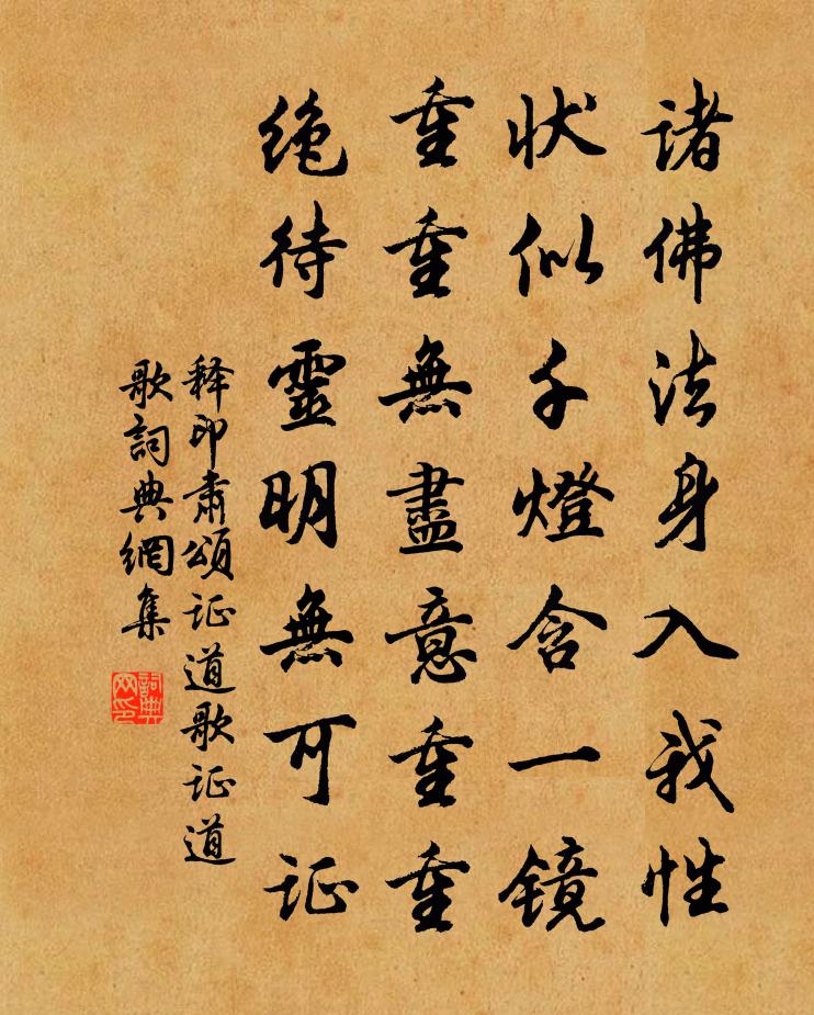 詩詞名句歷史字典書法欣賞書法字典國語詞典說文解字康熙字典古漢語字典標 題 作 者 詩 句 頌證道歌證道歌作者:釋印肅 朝代:宋代頌證道歌證道歌原文諸佛法身入我性,狀似千燈含一鏡。重重無盡意重重,絕待靈明無可證。詩詞問答問:頌證道歌證道歌的作者是誰?答:釋印肅問:頌證道歌證道歌寫於哪個朝代?答:宋代釋印肅頌證道歌證道歌書法欣賞頌證道歌證道歌書法作品詩詞推薦浣溪沙·著酒行行滿袂風姜夔〔宋代〕著酒行行滿袂風。草枯霜鶻落晴空。銷魂都在夕陽中。恨入四弦人慾老,夢尋千驛意難通。當時何似莫匆匆。秦門趙高周曇〔唐代〕趙高胡亥速天誅,率土興兵怨毒。豐沛見機群小吏,功成兒戲亦何殊。厭雨趙處澹〔宋代〕擬欲占晴待暮鴉,不禁愁思滿蒹葭。片雲飛渡風和雨,斜日低穿水浸沙。薏苡石邊收釣笠,芙蓉籬外響蘆笳。最憐雨雪曲江總〔南北朝〕雨雪隔榆溪,從軍度隴西。繞陣看狐跡,依山見馬蹄。天寒旗彩壞,地暗鼓聲低。漫漫愁雲起,蒼蒼別路迷。閒居雜興十首薛嵎〔宋代〕鐵硯幾磨研,依然螢雪邊。薄才遺聖世,無祿盡親年。多病唯諳藥,當寒不識綿。素心期淡泊,冰櫱誓能堅。稻田韋莊〔唐代〕綠波春浪滿前陂,極目連雲罷亞肥。更被鷺鶿千點雪,破煙來入畫屏飛。用前韻答黃一翁五首王炎〔宋代〕青雲諸貴人,鳴玉朝未央。我無封侯骨,難入鵷鷺行。生女不出門,生男志四方。十年九不就,食薺苦我腸。未能謝制帥高卿剡四首陳造〔宋代〕去年來甬東,旄倪喜勸色。色今畫船西,行路亦嗟惜。去來本何心,民自作欣慼。達人了世緣,八極付揮斥。臨川過永叔植慈竹義木於庭乃榜其堂曰慈義索魏了翁〔宋代〕冬筍與霜堇,孝可使之生。老槐與枯荊,義可使之榮。芸芸天壤閒,何物非吾誠。根心貫芽卉,影響於形聲。過君書上元夜遊蘇軾〔宋代〕 己卯上元,予在儋州,有老書生數人來過,曰:“良月嘉夜,先生能一出乎?”予欣然從之。步城西,入僧舍夢秦氏贈言曹雪芹〔清代〕三春過後諸芳盡,各自須尋各自門。偈傾一百三十三首釋法薰〔宋代〕透過牢關,縱橫獨步。腳頭到處生涯,誰道此山無路。和半庵慶成詩韻王志道〔宋代〕重屋祗承敬勿休,前星主鬯貳凝旒。度筵九尺陳黃目,助祭諸王白頭人。精意已知通烈祖,儀文元不減圜丘。兩階翠蛟亭怡然〔宋代〕擘石斗雷霆,蛟乎爾□怒。會當卷銀河,凌空瀉甘澍。余秋村創書院黎廷瑞〔宋代〕五鳳樓修謾賦空,不堪四壁老秋風。黃金白璧相逢頃,文杏香茅一笑中。子美堂資須錄事,堯夫宅契出溫公。諸公過江州岸,回望廬山楊萬里〔宋代〕廬山山南刷銅綠,黃金鋸解純蒼玉。廬山山北潑藍青,碧羅幛裹翡翠屏。昨日山南身歷遍,今朝山北舟中看。山南送七兄赴揚州帥幕陸游〔宋代〕初報邊烽照石頭,旋聞胡馬集瓜州。諸公誰聽芻蕘策,吾輩空懷畎畝憂。急雪打窗心共碎,危樓望遠涕俱流。豈知踏莎行王哲〔元代〕莫騁兒群,休夸女隊。與公便是為身害。脂膏刮削苦他人,只還兒女從前債。悅目亭堂,衷心念愛。直饒鐵打堅牢題江貫道山水十絕劉克莊〔宋代〕雪冒禹碑石,雲埋泌草堂。早知抱遺恨,悔不挾乾糧。鴛鴦夢(臨江仙)賀鑄〔宋代〕午醉厭厭醒自晚,鴛鴦春夢初驚。閒花深院聽啼鶯。斜陽如有意,偏傍小窗明。莫倚雕闌懷往事,吳山楚水縱橫。名句推薦恨身翻不作車塵,萬里得隨君。歐陽炯《巫山一段雲·春去秋來也》 月上柳梢頭,人約黃昏後。歐陽修《生查子·元夕》 君子以行言,小人以舌言佚名《孔子家語·顏回》 誰料蘇卿老歸國,茂陵松柏雨蕭蕭。李商隱《茂陵》 非學無以廣才,非志無以成學。諸葛亮《誡子書》 滿眼遊絲兼落絮,紅杏開時,一霎清明雨。馮延巳《鵲踏枝·清明》 丹青不知老將至,富貴於我如浮雲。杜甫《丹青引贈曹將軍霸》 白雲千里萬里,明月前溪後溪。劉長卿《謫仙怨·晴川落日初低》 敬他人,即是敬自己;靠自己,勝於靠他人。王永彬《圍爐夜話·第五七則》 勸君莫惜金縷衣,勸君惜取少年時。杜秋娘《金縷衣》