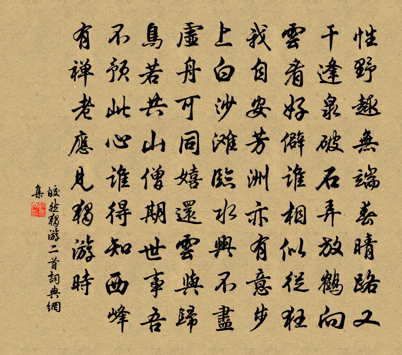 詩詞名句歷史字典書法欣賞書法字典國語詞典說文解字康熙字典古漢語字典標 題 作 者 詩 句 獨游二首作者:皎然 朝代:唐代獨游二首原文性野趣無端,春晴路又乾。逢泉破石弄,放鶴向雲看。好僻誰相似,從狂我自安。芳洲亦有意,步上白沙灘。臨水興不盡,虛舟可同嬉。還雲與歸鳥,若共山僧期。世事吾不預,此心誰得知。西峰有禪老,應見獨游時。詩詞問答問:獨游二首的作者是誰?答:皎然問:獨游二首寫於哪個朝代?答:唐代問:獨游二首是什麼體裁?答:五律皎然獨游二首書法欣賞獨游二首書法作品注釋全唐詩:卷817-25詩詞推薦浣溪沙元好問〔金代〕一片煙蓑一葉舟。夢中身世是滄洲。鯉魚風退不勝秋。秋月春風行處有,蒼苔濁酒醉時休。人生雖異水同流。金瀨吊貞女王端朝〔宋代〕嗟彼戰國秋,風俗日以漓。卓哉史氏女,粲粲蘭蕙姿。宋貞奉慈母,克盡烏鳥私。業貧不辭苦,擊漂臨清漪。適爾挽李主簿長民二首廖行之〔宋代〕帝里從游情最親,江頭一別幾經春。追思語笑恍如昨,時枉音書寧厭頻。憂患自嗟非故我,昂藏不復見斯人。每喔北固山蔡肇〔宋代〕一徑杉松駐晚煙,漸看台影入雲間。江拖縞帶縈危堞,地注青螺出遠山。當日英雄無復見,此時簫鼓有誰閒。我來送人南遊賈島〔唐代〕此別天涯遠,孤舟泛海中。夜行常認火,帆去每因風。蠻國人多富,炎方語不同。雁飛難度嶺,書信若為通。過故友舊居許渾〔唐代〕往年公子宅,夜宴樂難忘。高竹動疏翠,早蓮飄暗香。珠盤凝寶瑟,綺席遞華觴。今日皆何處,閉門春草長。即事趙若槸〔宋代〕可意黃鸝喚得醒,日移山影正當庭。飛花忽趁春風過,點破苔痕一片青。湖南春日二首戎昱〔唐代〕自憐春日客長沙,江上無人轉憶家。光景卻添鄉思苦,檐前數片落梅花。三湘漂寓若流萍,萬里湘鄉隔洞庭。羈客憶蘿月(寓清平樂客盱江,秋夜鼓琴,思故山作)張輯〔宋代〕新涼窗戶。閒對琴言語。彈到無人知得處。兩袖五湖煙雨。坐中斗轉參橫。珠躔碎落瑤觥。憶著故山蘿月,今宵應春日退朝劉禹錫〔唐代〕紫陌夜來雨,南山朝下看。戟枝迎日動,閣影助松寒。瑞氣轉綃縠,游光泛波瀾。御溝新柳色,處處拂歸鞍。山中小集文天祥〔宋代〕江山閒勝賞,萬戶不須留。客醉客多事,吾詩吾自酬。夕風吹絳蠟,春色漾黃流。賓從歸來夜,滁翁無此游。次樓宗簿禱雨韻陳宓〔宋代〕君侯憂國念,食頃詎能忘。盡變庖廚饌,全銷燕寢香。連朝成靄靄,中夜忽浪浪。坐想溪十曲,恩波似個長。偈頌七十六首釋師範〔宋代〕天地之根,萬物之主。大千無以居其尊,劫石難以並其固。謝饋藥宋自適〔宋代〕投老如僧不出家,羸軀無奈病相加。頭旋似倚當風柳,目眩如看隔霧花。高束詩書參素問,盡拋琴劍學丹砂。舊時觀韓玉汝胡人貢奉圖梅堯臣〔宋代〕時世重古不重新,破圖誰畫四胡人。臂鷹捧盤犀利水,鐵鎖師子同麒麟。翹翹雉尾插頭上,深目鉅鼻青搭巾。塗朱觀音大士贊釋師範〔宋代〕大哉觀自在,善觀諸音聲。而於諸音聲,不作音聲見。是見亦寂滅,亦無寂滅者。由來離眾苦,處處得解脫。分身潯陽與孫郎中宴回周賀〔唐代〕別酒已酣春漏前,他人扶上北歸船。潯陽渡口月未上,漁火照江仍獨眠。岐下送友人歸襄陽賈島〔唐代〕蹉跎隨泛梗,羈旅到西州。舉翮籠中鳥,知心海上鷗。山光分首暮,草色向家秋。若更登高峴,看碑定淚流。驀山溪黃人傑〔宋代〕翠環驚報,葉底梅如彈。小摘試嘗看,齒微酸、生香不斷。煙丸露顆,肥得頰兒紅,還欲近,淺黃時,風雨摧殘半莫獨行曹勛〔宋代〕莫獨行,風雨慘慘兮夜不得明。道有石坂兮,使汝車敗而馬驚。山有猛虎兮水多暴鯨。任重塗遠兮無欲速其小程。名句推薦翠葉吹涼,玉容消酒,更灑菇蒲雨。姜夔《念奴嬌·鬧紅一舸》 反聽之謂聰,內視之謂明,自勝之謂強。司馬遷《史記·商君列傳》 美色不同面,皆佳於目;悲音不共聲,皆快於耳王充《論衡·卷三十·自紀篇》 竹喧歸浣女,蓮動下漁舟。王維《山居秋暝》 心病終須心藥治,解鈴還是系鈴人。曹雪芹《紅樓夢·第九十回》 人有賢愚,任人勿求過己。來俊臣《羅織經·固榮卷第六》 隨意春芳歇,王孫自可留。王維《山居秋暝》 斜髻嬌娥夜臥遲,梨花風靜鳥栖枝。唐寅《美人對月》 曲終過盡松陵路,回首煙波十四橋。姜夔《過垂虹》 閒倚博山長嘆,淚流沾皓腕。韋莊《歸國遙·春欲晚》