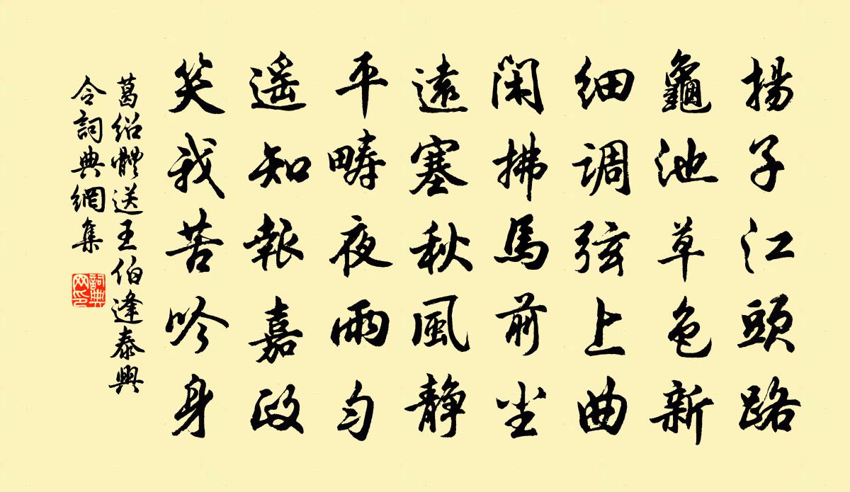 詩詞名句歷史字典書法欣賞書法字典國語詞典說文解字康熙字典古漢語字典標 題 作 者 詩 句 送王伯逢泰興令作者:葛紹體 朝代:宋代送王伯逢泰興令原文揚子江頭路,龜池草色新。細調弦上曲,閒拂馬前塵。遠塞秋風靜,平疇夜雨勻。遙知報嘉政,笑我苦吟身。詩詞問答問:送王伯逢泰興令的作者是誰?答:葛紹體問:送王伯逢泰興令寫於哪個朝代?答:宋代葛紹體送王伯逢泰興令書法欣賞送王伯逢泰興令書法作品詩詞推薦又和洪咨夔〔宋代〕寒燈芳爐發春紅,讀到豳詩繼匪風。吾道有消還有長,欲將此意寫絲桐。句潘先生〔宋代〕大江今古怒聲怒,長為將軍氣不平。次韻關令送魚蘇軾〔宋代〕舉網驚呼得巨魚,饞涎不易忍流酥。更煩赤腳長須老,來趁西風十幅蒲。頌古十七首釋宗演〔宋代〕黑漆竹篦非觸背,大地山河俱粉碎。咬人師子急反身,莫學韓獹猶逐塊。送呂子陽自永康攜所解老子訪餘留未久其家報葉適〔宋代〕收纓古蜜浦,抱袂生薑門。九九書自註,邀余綴篇端。久衰余學廢,彌隱子道尊。時維冬雷數,雲雪常晝昏。火把相和歌辭。輓歌白居易〔唐代〕丹旐何飛揚,素驂亦悲鳴。晨光照閭巷,輀車儼欲行。蕭條九月天,哀輓出重城。借問送者誰,妻子與弟兄。蒼蒼飲田家洞李新〔宋代〕日腳歸雲到坐隅,凍禽唧{左口右栗}樹扶疏。望窮野麥綠不斷,春入山梅香有餘。恐是滕公千載室,定無汲冢五次蒲大受檢覆韻郭印〔宋代〕身親掃除役,敝袍染塵泥。青雲一何高,天險不可躋。西風吹秋來,草木含淒淒。韝鷹屢飛掣,櫪馬空鳴嘶。丈夫萬年歡(丙午生日)程大昌〔宋代〕老鈍迂疏,盡世間樂事,不忄欠不覷。痴向韋編,根究卦爻來處。渾沌包中天地。謝東家、從頭指示。便和那、八金縷詞/賀新郎石麟〔宋代〕欲上南樓壽。記當年、祥占玉燕。一陽生候。今數書雲猶七日,宮線未添刺繡。便草就、壽詞盈袖。合捧金荷稱鶴次韻日新見招王灼〔宋代〕聞道山中熟臘醅,懸知瓮面喚春回。桃花亦解相勾引,前度劉郎擬獨來。曉霽司馬光〔宋代〕夢覺繁聲絕,林光透隙來。開門驚烏鳥,余滴墮蒼苔。題華林書院賈黃中〔宋代〕旌陽舊山曲,書室構山前。景物塵埃外,軒窗樹石邊。寧惟集儒業,兼恐混神仟。百行家門最,宜當世有賢。步出夏門行 艷曹操〔魏晉〕雲行雨步,超越九江之皋。臨觀異同,心意懷豫,不知當復何從?經過至我碣石,心惆悵我東海。歸別墅周文璞〔宋代〕幽棲久不到,猿鶴擅藤蘿。叢絛生將遍,流泉咽更多。鄰翁新釀熟,野寺暮鍾和。亦有經行者,來觀倚杖歌。過道州謁周濂溪故居柴隨亨〔宋代〕迢迢豸嶺過縈紆,知是元公此結廬。老屋至今圖太極,古碑猶在勒通書。落花啼鳥春無恙,窗草池蓮景自如。閒立柳李商隱〔唐代〕為有橋邊拂面香,何曾自敢占流光。後庭玉樹承恩澤,不信年華有斷腸。梨花憶梅堯臣〔宋代〕欲問梨花發,江南信始通。開因寒食雨,落盡故園風。白玉佳人死,青銅寶鏡空。今朝兩眼淚,怨苦屬衰公。喜雨二首陳造〔宋代〕永寧開善皆留宿,夢破階除急雨傾。人道行車定膏澤,我知龍伯念春耕。醉花陰毛滂〔宋代〕金葉猶溫香未歇。塵定歌初徹。暖透薄羅衣,一霎清風,人映團團月。持杯試聽留春闋。此個情腸別。分付與鶯鶯名句推薦吏呼一何怒,婦啼一何苦。杜甫《石壕吏》 日色已盡花含煙,月明欲素愁不眠。李白《長相思三首·其二》 欲知悵別心易苦,向暮春風楊柳絲。李白《下途歸石門舊居》 青春幾何時,黃鳥鳴不歇。李白《江南春懷》 報導先生歸也,杏花春雨江南。虞集《風入松·寄柯敬仲》 宿草春風又,新阡去歲無。楊萬里《寒食上冢》 清明節,雨晴天,得意正當年。薛昭蘊《喜遷鶯·清明節》 豪傑向簡淡中求,神仙從忠孝上起。陳繼儒《小窗幽記·集醒篇》 漠漠梨花爛漫,紛紛柳絮飛殘。陳允平《紅林擒近·壽詞·滿路花》 朱門酒肉臭,路有凍死骨。杜甫《自京赴奉先縣詠懷五百字 / 自京赴奉先詠懷五百字》