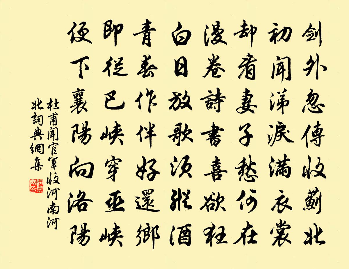 杜甫在這首詩下自註:“余田園在東京。”詩的主題是抒寫忽聞叛亂已平的捷報,急於奔回老家的喜悅。“劍外忽傳收薊北”,起勢迅猛,恰切地表現了捷報的突然。詩人多年飄泊“劍外”,備嘗艱苦,想回故鄉而不可能,就是由於“薊北”未收,安史之亂未平。如今“忽傳收薊北”,驚喜的洪流,一下子沖開了鬱積已久的情感閘門,令詩人心中濤翻浪涌。“初聞涕淚滿衣裳”,“初聞”緊承“忽傳”,“忽傳”表現捷報來得太突然,“涕淚滿衣裳”則以形傳神,表現突然傳來的捷報在“初聞”的一剎那所激發的感情波濤,這是喜極而悲、悲喜交集的真實表現。“薊北”已收,戰亂將息,乾坤瘡痍、黎民疾苦,都將得到療救,詩人顛沛流離、感時恨別的苦日子,總算熬過來了。然而痛定思痛,詩人回想八年來熬過的重重苦難,又不禁悲從中來,無法壓抑。可是,這一場浩劫,終於像噩夢一般過去了,詩人可以返回故鄉了,人們將開始新的生活,於是又轉悲為喜,喜不自勝。這“初聞”捷報之時的心理變化、複雜感情,如果用散文的寫法,必需很多筆墨,而詩人只用“涕淚滿衣裳”五個字作形象的描繪,就足以概括這一切。