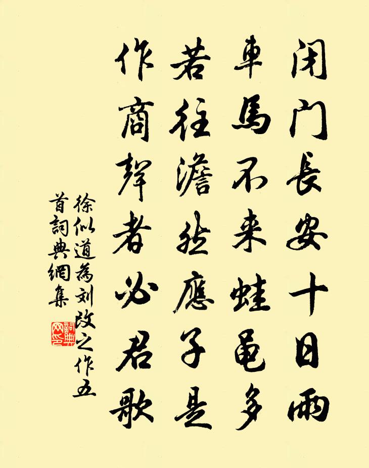 詩詞名句歷史字典書法欣賞書法字典國語詞典說文解字康熙字典古漢語字典標 題 作 者 詩 句 為劉改之作五首作者:徐似道 朝代:宋代為劉改之作五首原文閉門長安十日雨,車馬不來蛙黽多。若往澹然應子是,作商聲者必君歌。詩詞問答問:為劉改之作五首的作者是誰?答:徐似道問:為劉改之作五首寫於哪個朝代?答:宋代徐似道為劉改之作五首書法欣賞為劉改之作五首書法作品詩詞推薦穴蟻一首劉克莊〔宋代〕穴蟻能防患,常於未雨移。聚如營洛日,散似去邠時。斷續緣高壁,周遭避淺池。誰為謀國者,見事反傷遲。獨坐絕句二首陸游〔宋代〕蛙鳴乃是怒,鵩嘯固非妖。獨宿空山夜,何妨伴寂寥。和梅公儀嘗茶歐陽修〔宋代〕溪山擊鼓助雷驚,逗曉靈芽發翠莖。摘處兩旗香可愛,貢來雙鳳品尤精。寒侵病骨惟思睡,花落春愁未解酲。喜共湘中贈范鄖羅隱〔唐代〕丹桂無心彼此諳,二年疏懶共江潭。愁知酒醆終難捨,老覺人情轉不堪。雲外鴛鴦非故舊,眼前膠漆似煙嵐。勞歌寄崔萬芳夔皎然〔唐代〕氣殺高隼擊,惜芳步寒林。風搖蒼琅根,霜剪荍艹遙心。歸思忽眇眇,佳氣亦沉沉。我身豈遐遠,如隔湘漢深。事泛舟呈元制照老李流謙〔宋代〕落日清江闊,臨流一慨然。斷鴻煙際渚,雌霓雨余天。照海珠成市,騎鯨客是仙。輕風借帆力,送我玉妃前。試周郎(訴衷情)賀鑄〔宋代〕喬家深閉鬱金堂。朝鏡事梅妝。雲鬟翠鈿浮動,微步擁釵梁。情尚秘,色猶莊。遞瞻相。弄絲調管,時誤新聲,翻游彰法寺打擢秀閣詩以行趙蕃〔宋代〕四海擢秀閣,茲晨彰法游。名隨寺俱徙,地入道家流。尚喜黃詩在,仍容墨本求。從今茅屋底,自有皖山幽。送春詞劉禹錫〔唐代〕昨來樓上迎春處,今日登樓又送歸。蘭蕊殘妝含露泣,柳條長袖向風揮。佳人對鏡容顏改,楚客臨江心事違。萬古偈頌一百六十首釋宗杲〔宋代〕毗藍園裡不曾生,雙林樹下何曾滅。不生不滅見瞿曇,眼中又是重添屑。干將墓汪遵〔唐代〕橐籥冰霜萬古聞,拍灰松地見余墳。應緣神劍飛揚久,水水山山儘是雲。游惠山蘇軾〔宋代〕薄雲不遮山,疏雨不濕人。蕭蕭松徑滑,策策芒鞋新。嘉我二三子,皎然無淄磷。勝游豈殊昔,清句仍絕塵。弔古寄玉溪林逢吉六首戴復古〔宋代〕經年不見玉溪翁,百里江山萬里同。無計相從話心曲,時揮一紙寄西風。鷓鴣天黃機〔宋代〕柳際梅邊臘雪乾。釵頭蝴蝶又成團。飄零萍梗江湖客,冷落笙簫燈火天。澆濁酒,惜流年。牙旗夜市幾時穿。太平寶鼎現(四時懷古春詞)陳著〔宋代〕問今何日,舊也曾尾,東風鵷鷺。回首念,家山桃李,歸去來兮聞早賦。夢境裡、盡何妨疏散,時趁鶯晴信步。是西江月(閏重陽)韓元吉〔宋代〕一度難逢佳節,今年兩度重陽。菊花猶折御衣黃。莫惜危亭更上。況有飛觴灩玉,從教醉帽吹香。興來相與共清狂姑孰十詠。靈墟山李白〔唐代〕丁令辭世人,拂衣向仙路。伏煉九丹成,方隨五雲去。松蘿蔽幽洞,桃杏深隱處。不知曾化鶴,遼海歸幾度。楚橋秋暮阻雨張耒〔宋代〕水滿城西釣艇橫,雲豪風弱晚冥冥。天寒小店人愁雨,燈暗孤舟客臥聽。和歐陽南陽月夜思揭傒斯〔元代〕月出照中園,鄰家猶未眠。不嫌風露冷,看到樹陰圓。句蘇紳〔宋代〕它年躍馬相逢處,記得先生舊姓名。名句推薦自見者不明;自是者不彰老子《老子·道經·第二十四章》 無父無君,是禽獸也。孟子《孟子·滕文公章句下·第九節》 力勝貧,謹勝禍,慎勝害,戒勝災。劉向《說苑·談叢》 失道而後德,失德而後仁,失仁而後義,失義而後禮。老子《老子·德經·第三十八章》 馬行無力皆因瘦,人不風流只為貧。佚名《增廣賢文·上集》 謾道愁須殢酒,酒未醒、愁已先回秦觀《滿庭芳·碧水驚秋》 近來何處有吾愁,何處還知吾樂。辛棄疾《念奴嬌·賦雨岩》 鄉心新歲切,天畔獨潸然。劉長卿《新年作》 壯年何事憔悴,華發改朱顏。蘇舜欽《水調歌頭·滄浪亭》 地白風色寒,雪花大如手。李白《嘲王歷陽不肯飲酒》