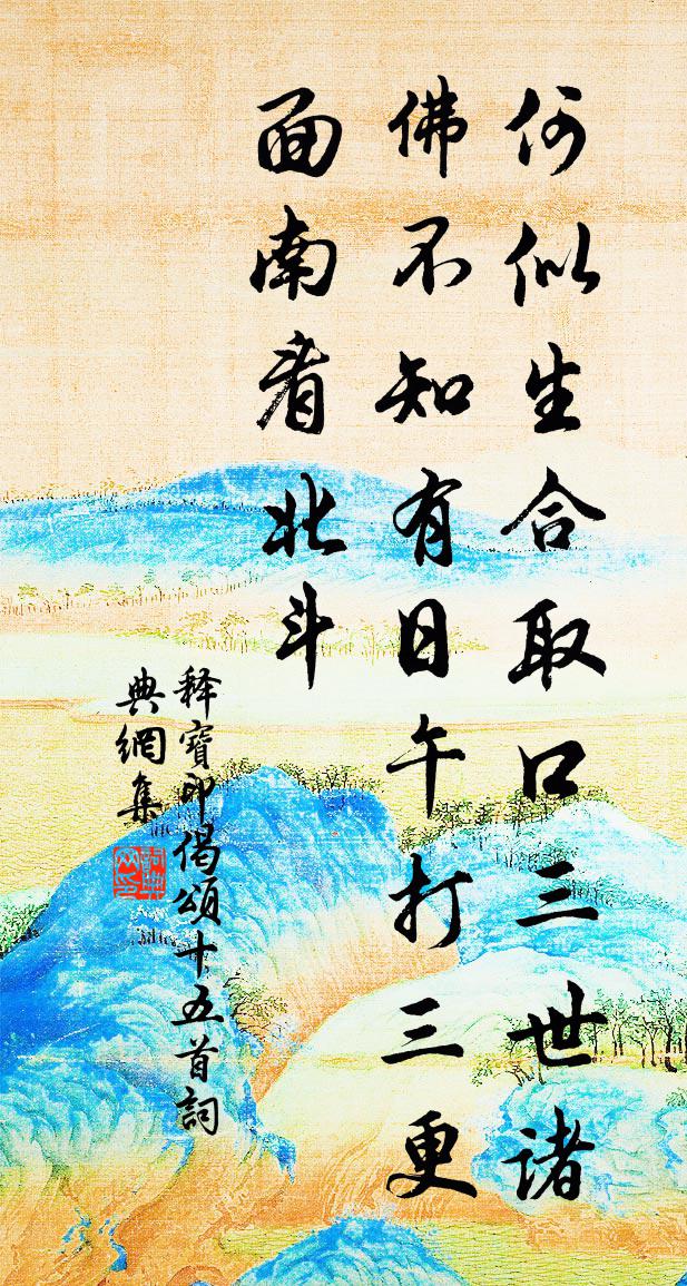 詩詞名句歷史字典書法欣賞書法字典國語詞典說文解字康熙字典古漢語字典標 題 作 者 詩 句 偈頌十五首作者:釋寶印 朝代:宋代偈頌十五首原文何似生,合取口,三世諸佛不知有。日午打三更,面南看北斗。詩詞問答問:偈頌十五首的作者是誰?答:釋寶印問:偈頌十五首寫於哪個朝代?答:宋代釋寶印偈頌十五首書法欣賞偈頌十五首書法作品詩詞推薦觀舊題再書梅摯〔宋代〕方丈前詩映後詩,更無塵點碧紗圍。老僧相顧應相笑,不似揚州刺史歸。榮木 其二陶淵明〔魏晉〕采采榮木,於茲托根。繁華朝起,慨暮不存。貞脆由人,禍福無門。匪道曷依,匪善奚敦!水調歌頭(小憩袁氏園用前韻)吳潛〔宋代〕老圃無關鎖,放客意中行。頗欣天地開闊,煙釣與雲耕。荷長亭亭翠蓋,竹長森森翠葆,景致鬧裝成。幾樹榴花發同題仙遊觀韓翃〔唐代〕仙台下見五城樓,風物淒淒宿雨收。山色遙連秦樹晚,砧聲近報漢宮秋。疏鬆影落空壇靜,細草香閒小洞幽。何用送黃知新歸安南賈島〔唐代〕池亭沉飲遍,非獨曲江花。地遠路穿海,春歸冬到家。火山難下雪,瘴土不生茶。知決移來計,相逢期尚賒。林居張耒〔宋代〕林居觀變化,寒暑無時停。日月迭奔走,汲汲作昏明。彼人於其間,起妄自經營。寧知運之去,不受如力爭。終古依韻和原甫廳壁錢諫議畫蟹梅堯臣〔宋代〕諫議吳王孫,特畫水物具。至今圖寫名,不減南朝顧。濃淡一以墨,螯殼自有度。意將輕蔡謨,殆被蟛蜞誤。漁家傲歐陽玄〔元代〕二月都城春動野。引龍灰向銀床畫。士女城西爭買架。看馳馬。官家引佛官蘭若。水暖天鵝紛欲下。鷹房奏獵催車浪淘沙曾覿〔宋代〕一線海門來。雪噴雲開。崑山移玉下瑤台。捲地西風吹不斷,直到蓬萊。羯鼓譟春雷。鼉舞蛟回。歌樓鼓吹夕陽催六州歌頭 次馬明初韻書所見許有壬〔元代〕軒昂仙侶,風度似吾儕。凡鳥輩,雖累百,總與台。敢偕偕。何處風絲客,昧平昔,恣*突,形跡異,天壤隔,劇塔山作徐照〔宋代〕東岸沙新淤,西村半失田。夕陽明望外,寒雁落愁邊。懶下遮風帽,誰添買酒錢。小坡人不渡,燈火壓潮船。戲效屏山書齋十詠劉克莊〔宋代〕工師將考室,何止大為杗。搘案雖微用,由來寸有長。西江月陳德武〔宋代〕時序去如流矢,人生宛如飛蓬。石灣江上又逢冬。且喜一場初動。但見堪輿杳杳,更連山水重重。淒涼雲物雨濛濛偈頌一百二十三首釋崇岳〔宋代〕十五已前取不得,十五已後捨不得。正當十五日,築著磕著七花八裂,明眼衲僧只得一橛。俗有社日不飲酒變為豬之說作詩示兒曹趙蕃〔宋代〕雨勢來相續,陰霾郁不舒。舉觴隨楚俗,酌體從枯魚。宰肉非吾事,祈田顧歲儲。龍豬自有分,社飲不關渠。偈釋建〔宋代〕兔馬有角,牛羊無角。絕毫絕厘,如山如岳。針鋒上師子翻身,藕竅中大鵬展翼。等閒突過北俱盧,日月星辰一時登翠微亭余迪〔宋代〕數年樂此宦池城,每愛湖光分外清。遠浦落霞秋水闊,亂山斜日碧雲橫。牧吹牛背歸林晚,漁唱舟中對月明。同覽送張丞歸使幕(一作張繼詩)韓翃〔唐代〕獨受主恩歸,當朝似者稀。玉壺分御酒,金殿賜春衣。拂席流鶯醉,鳴鞭駿馬肥。滿台簪白筆,捧手戀清暉。丙子仲冬紫閣寺聊句蘇舜元〔宋代〕白石太古水,蒼厓六月冰。昏明咫尺變,身世逗留增。橋與飛霞亂,人間獨鳥升。風泉冷相搏,樓閣暮逾澄。反覆鷓鴣天(九月十三日攜家游夏氏林亭燕集作,並送湯詞)葛勝仲〔宋代〕小榭幽園翠箔垂。雲輕日薄淡秋暉。菊英露浥淵明徑,藕葉風吹叔寶池。酬素景,泥芳卮。老人痴鈍強伸眉。歡華名句推薦燕支落漢家,婦女無華色。李白《塞上曲》 春雨斷橋人不度,小舟撐出柳陰來。徐俯《春遊湖》 荊州麥熟繭成蛾,繰絲憶君頭緒多。李白《荊州歌》 人主之患,在於信人,信人,則制於人。韓非及後人《韓非子·備內》 樓上黃昏欲望休,玉梯橫絕月中鉤李商隱《代贈二首》 儒者在本朝則美政,在下位則美俗。荀子《荀子·儒效》 狐死首丘,代馬依風。范曄《後漢書·列傳·班梁列傳》 明歲秋風知再會,暫時分手莫相思。曹雪芹《殘菊》 本分人,即是快活人,無奈做本分人者甚少。王永彬《圍爐夜話·第四則》 寢興目存形,遺音猶在耳。潘安《悼亡詩三首》
