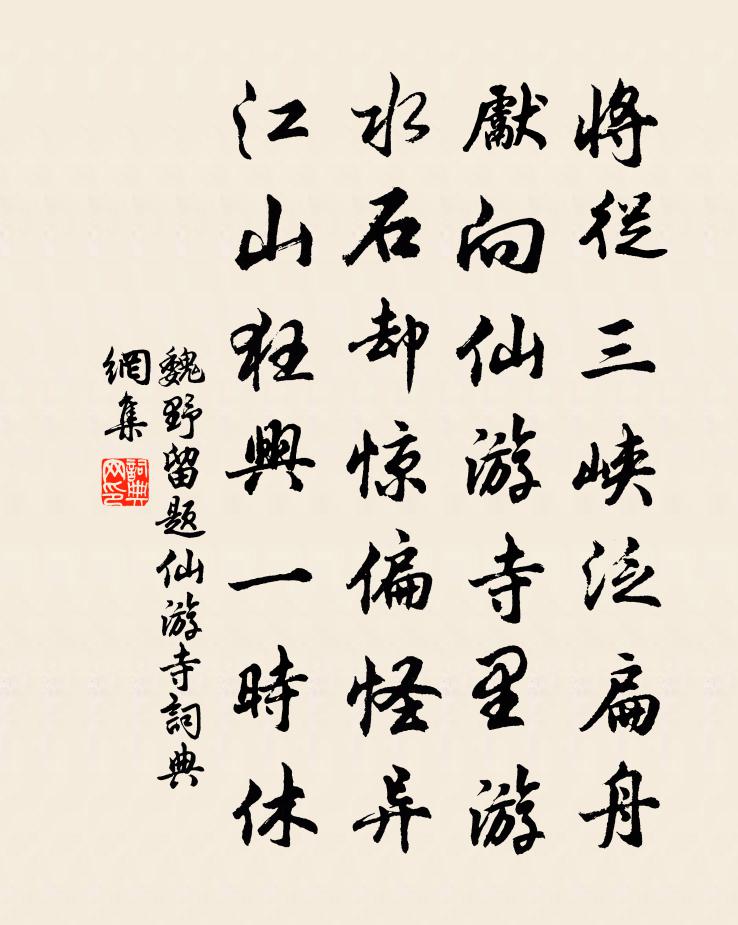 詩詞名句歷史字典書法欣賞書法字典國語詞典說文解字康熙字典古漢語字典標 題 作 者 詩 句 留題仙遊寺作者:魏野 朝代:宋代留題仙遊寺原文將從三峽泛扁舟,先向仙遊寺里游。水石卻驚偏怪異,江山狂興一時休。詩詞問答問:留題仙遊寺的作者是誰?答:魏野問:留題仙遊寺寫於哪個朝代?答:宋代魏野留題仙遊寺書法欣賞留題仙遊寺書法作品詩詞推薦御筵送鄧王徐鉉〔唐代〕禁里秋樂隊似水清,林煙池影共離情。暫移黃閣只三載,卻望紫垣都數程。滿座清風天子送,隨車甘雨郡人迎。綺自詠絕句陸游〔宋代〕平生寧獨愛吾廬,何處茅檐不可居。晝闕僮奴停接客,夜無膏火罷觀書。十二時歌釋印肅〔宋代〕黃昏戌,更點分明黑如漆。一道常光絕世倫,來往不通金密積。知不知,識不識,自古至今非外覓。木女清宵何所寒夜讀書陸游〔宋代〕憶昨從戎出渭濱,秋風金鼓震鹹秦。鳶肩竟欠封侯相,三尺檠邊老此身。思子台有感二首白居易〔唐代〕曾家機上聞投杼,尹氏園中見掇蜂。但以恩情生隙罅,何人不解作江充。闇生魑魅蠹生蟲,何異讒生疑阻中。但使觀棋大吟邵雍〔宋代〕人有精遊藝,予嘗觀弈棋。筭餘知造化,著外見幾微。好勝心無已,爭先意不低。當人盡賓主,對面如蠻夷。財利始生之日黎明以職事出郊喻良能〔宋代〕征鞍隨曉色,重露濕衣巾。誰謂懸弧日,翻為執轡辰。野花工笑客,啼鳥故窺人。呼酒澆孤悶,何心作好春。出京別同年黃滔〔唐代〕一枝仙桂已攀援,歸去煙濤浦口村。雖恨別離還有意,槐花黃日出青門。勸石集賢飲楊億〔宋代〕日上三竿宿霧披,章台走馬帽簷欹。祇傳祖席觴無算,肯顧尚書對有期。芸省繙經終寂寞,柳隄飛鞚好追隨。靈均和邵興宗棋聲文同〔宋代〕二客與棋酬,寒聲滿側楸。急因隨行發,斷為見遲休。花下鶯翻翼,林間鶴轉頭。丁丁竹樓下,不獨在黃州。臘月九日雪三絕句蘇轍〔宋代〕去年家釀不須沽,秫米今年絕市無。雪沒前山薇蕨盡,誰憐無語獨攜鋤。西江月(和張文伯臘日席上)王之道〔宋代〕北陸藏冰欲竟,東風解凍非遙。一時芳意巧相撩。入眼綠嬌紅小。柳色輕搖弱線,梅英紛綴枯梢。觥籌醉里賴君饒伯時往河東戲與廉夫分韻道相思之意三首傅察〔宋代〕朝氛霽西山,晚日明仿佛。遙憐太行上,陟巘眩可畏。王侯眇小夫,中盤凌雲氣。端如車公賢,談笑出真味。胡為浪淘沙曹勛〔宋代〕歸意逐飛鴻。點點書空。愛渠南去曉煙中。不似老人塵土裡,一似痴聾。庭院晚來風。還過秋客。舊時與客繞珍叢送管憲出城曾豐〔宋代〕海上連旬雨,城東一尺泥。肩輿行轍兀,據板坐猶欹。鳥語如相問,松聲似見嗤。平生說高尚,何事送迎為。次韻奉酬李質夫王安石〔宋代〕逸少池邊有舊山,幾年征淚染衣斑。駑駘自飽方爭路,騕褭長飢不在閒。雪漲江南歸浩蕩,煙埋河朔去間關。勞歌過池陽舊治和呂子西韻袁說友〔宋代〕浮沈宦海幾春秋,歲晚重來舊典州。昔日青山雖在眼,故侯白髮已盈頭。吟邊感慨關情久,忙裡工夫著意偷。聞說送王節推夷仲秩滿赴闕喻良能〔宋代〕中年謝傅良多感,欲別能忘作惡無。今日與公休惜別,須知元不隔江湖。沁園春佚名〔宋代〕法從西清,雅志山東,超然燕怡。笑洛城盧老,貧來屋破,花溪杜叟,雨里床移。晚乃經營,歡言結架,夭矯晴虹農家望晴雍裕之〔唐代〕嘗聞秦地西風雨,為問西風早晚回。白髮老農如鶴立,麥場高處望雲開。名句推薦粉身碎骨渾不怕, 要留清白在人間于謙《石灰吟》 今人嗤點流傳賦,不覺前賢畏後生。杜甫《戲為六絕句》 芳原綠野恣行事,春入遙山碧四圍。程顥《郊行即事》 以少總多,情貌無遺矣。劉勰《文心雕龍·物色》 一朝權在手,便把令來行。佚名《增廣賢文·下集》 塞雁高飛人未還,一簾風月閒。李煜《長相思·一重山》 空獨倚東風,芳思誰寄。周密《繡鸞鳳花犯·賦水仙》 倩何人喚取,紅巾翠袖,搵英雄淚!辛棄疾《水龍吟·登建康賞心亭》 笑指吾廬何處是?一池荷葉小橋橫。陳繼儒《浣溪沙·初夏夜飲歸》 洊雷,震;君子以恐懼修省。佚名《易傳·象傳下·震》