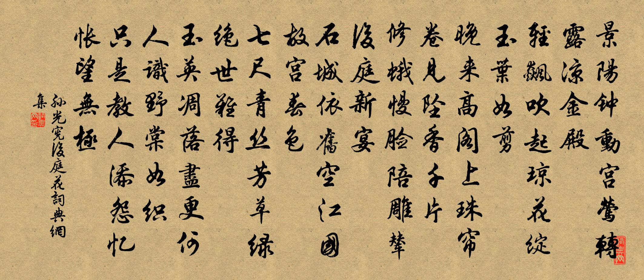 景陽鍾動宮鶯轉,露涼金殿。輕飆吹起瓊花綻,玉葉如剪。