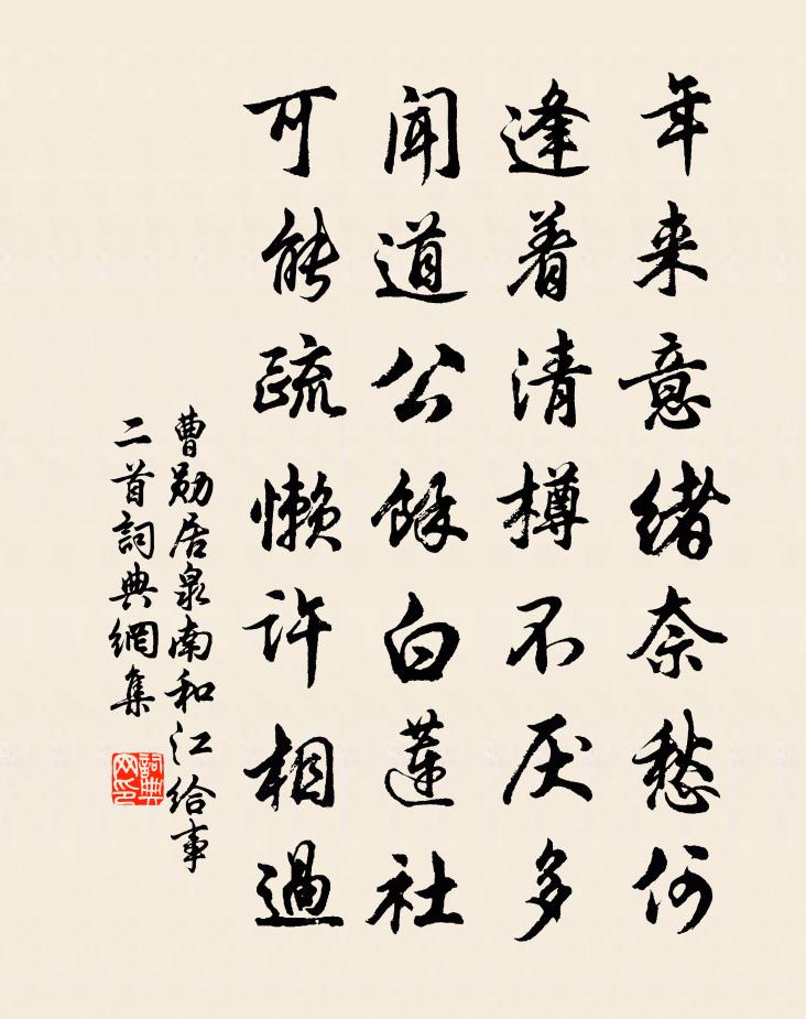詩詞名句歷史字典書法欣賞書法字典國語詞典說文解字康熙字典古漢語字典標 題 作 者 詩 句 居泉南和江給事二首作者:曹勛 朝代:宋代居泉南和江給事二首原文年來意緒奈愁何,逢著清樽不厭多。聞道公餘白蓮社,可能疏懶許相過。詩詞問答問:居泉南和江給事二首的作者是誰?答:曹勛問:居泉南和江給事二首寫於哪個朝代?答:宋代曹勛居泉南和江給事二首書法欣賞居泉南和江給事二首書法作品詩詞推薦灃浦范成大〔宋代〕葦岸齊齊似碧城,江船罨岸逆風行。綠苹白芷俱憔悴,惟有蔞蒿滿意生。磉石釋紹曇〔宋代〕鎚鑿工夫見十全,潤時知雨玉餘溫。看渠負載擎天柱,個個無非硬腳跟。寄題向伯恭侍郎企疏堂李彌遜〔宋代〕太沖扶策招隱士,德璋移文謝逋客。欲分勝地高世流,未辨賢愚相什百。薌林居士人中珍,胸中不點元規塵。平生贈後山僧謙自牧游艾性夫〔宋代〕為僧不游醯瓮雞,游不名山沮澤龜。見山無詩僧亦俗,詩不高古猶無詩。吾謙年少鍾老氣,髮根甫斷撥雲去。歸來漁家傲李光〔宋代〕海外無寒花發早。一枝不忍簪風帽。歸插淨瓶花轉好。維摩老。年來卻被花枝惱。忽憶故鄉花滿道。狂歌痛飲俱年清平樂袁去華〔宋代〕春愁錯莫。風定花猶落。鬥草踏青閒過卻。乳燕鳴鳩自樂。行人江北江南。滿庭萱草毿毿。且恁亡憂可矣,只他怎臨安久雨曹勛〔宋代〕初夏連朝雨,土人云入梅。但聞檐溜密,不見曉光開。衣潤疑沾汗,階空任長苔。地車無住著,只擬上層台。和田錄事新燕賀鑄〔宋代〕新巢故國兩依依,似與春華秋葉期。雨過池塘得泥近,日高台榭捲簾遲。鞦韆節後初相見,祓禊人歸有所思。雙侶憶秦娥李清照〔宋代〕臨高閣,亂山平野煙光保。煙光薄,棲鴉歸後,暮天聞角。斷香殘香情懷惡,西風催襯梧桐落。梧桐落,又還秋色平居遺興葛天民〔宋代〕隔籬人語自喧嘲,緊閉苔扉不許敲,談麈帶塵懸屋角,牽牛承露上林梢。投閒得計心常足,擬古成編手自抄。風雨清水道上望隔山桃花盛開趙蕃〔宋代〕青山深處桃花紅,應有幽人住此中。又疑山深人跡絕,封泥彈核如芙蓉。樹成花開亦既實,實落山中還自植。年年宮中三台王建〔唐代〕魚藻池邊射鴨,芙蓉帳里看花。日色赭袍相似,不著紅鸞扇遮。和太素密杏韓維〔宋代〕甘滋不假蜂房取,美種疑隨鶴馭來。方朔偷桃徒語爾,安期食棗足珍哉。觀魚楊萬里〔宋代〕老夫不柰熱,跣足坐瓦鼓。臨池觀游魚,定眼再三數。魚兒殊畏人,欲度不敢度。一魚試行前,似報無他故。眾魚幽居張嵲〔宋代〕避地依荒谷,衡茅苟自安。門前山四塞,不用買峰巒。句張釜〔宋代〕試問梅花可忍不。華嚴寺逢舊蒼頭劉克莊〔宋代〕曾向叢林寄幅巾,十年塵涴臥雲身。侍琴童子長於竹,去禮山僧作主人。步蟾宮(春景)蔣捷〔宋代〕玉窗掣鎖香雲漲。喚綠袖、低敲方響。流蘇拂處字微訛,但斜倚、紅梅一餉。濛濛月在簾衣上。做池館、春陰模樣西台哭所思謝翱〔宋代〕殘年哭知已,白日下荒台。淚落吳江水,隨潮到海回。故衣猶染碧,后土不憐才。未老山中客,惟應賦八哀。初秋普明寺竹林小飲餞梅聖俞分韻得亭皋木葉歐陽修〔宋代〕勸客芙蓉杯,欲搴芙蓉葉。垂楊礙行舟,演漾回輕楫。名句推薦昨夜風兼雨,簾幃颯颯秋聲。李煜《烏夜啼·昨夜風兼雨》 千家閉戶無砧杵,七夕何人望鬥牛。李嘉祐《早秋京口旅泊章侍御寄書相問因以贈之時七夕》 翻被梨花冷看,人生苦戀天涯。張炎《朝中措·清明時節》 耿斜河、疏星淡月,斷雲微度。張元乾《賀新郎·送胡邦衡待制赴新州》 欲窮千里目,更上一層樓。王之渙《登鸛雀樓》 以其行理也。行理性於染當。墨子《墨子·03章 所染》 君不見,高堂明鏡悲白髮,朝如青絲暮成雪。李白《將進酒》 一生傲岸苦不諧,恩疏媒勞志多乖。李白《答王十二寒夜獨酌有懷》 那裡有鬧紅塵香車寶馬?祗不過送黃昏古木寒鴉。王磐《古蟾宮·元宵》 過雨西風,數葉井梧愁舞。吳文英《荔枝香近·七夕》