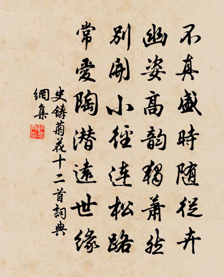 詩詞名句歷史字典書法欣賞書法字典國語詞典說文解字康熙字典古漢語字典標 題 作 者 詩 句 菊花十二首作者:史鑄 朝代:宋代菊花十二首原文不真盛時隨從卉,幽姿高韻獨蕭然。別開小徑連松路,常愛陶潛遠世緣。詩詞問答問:菊花十二首的作者是誰?答:史鑄問:菊花十二首寫於哪個朝代?答:宋代史鑄菊花十二首書法欣賞菊花十二首書法作品詩詞推薦柳絮韓琦〔宋代〕絮雪紛紛不自持,亂愁縈困滿春暉。有時穿入花枝過,無限蜂兒作隊飛。和胡宗澤見寄吳芾〔宋代〕故 * 里貯陽秋,愛我身如不繫舟。羞向人間為諂首,喜來林下作遨頭。雖無仙骨能騎鶴,尚有閒心可狎鷗。乘興游水南一首劉克莊〔宋代〕九馬如飛不用鞭,微塵一道起晴川。有司誤謗為山賊,好事俄傳是地仙。何處名樓風月爽,誰家修竹主人賢。橐詩春日書懷王之道〔宋代〕高文知已動天庭,昨日春雷下六丁。濟旱會施惟肖雨,舉賢先應少微星。行趨北闕形神健,坐對東風醉夢醒。連日敬贊月林觀禪師陳貴謙〔宋代〕傳得西林夜半長,解將鐵笛逆風吹。重重話墮全擔荷,青出於藍只自知。舞鶴亭歌真德秀〔宋代〕舞鶴亭空亭,無鶴胡為名。亦如西山賦招鶴,無鶴可招也不惡。何必玄裳縞袖二八真娉婷,想像標緻便足使人毛骨春日田園雜興楊舜舉〔宋代〕露畦煙陌裹,名利等秋豪。引犢隨牛放,祈靈望貢繅。和根挑齊菜,帶葉摘櫻桃。讀罷歸來賦,臨風欲和陶。留題東岩院強至〔宋代〕仁祠倚岩腹,無處入囂氛。古像棲深殿,高僧傲白雲。山花暖自發,溪溜遠猶聞。我正為名縛,翻羞猿鳥群。戊早年七夕五絕張秉〔宋代〕斜漢西傾桂魄新,停梭今夕度天津。世間縱有支機石,誰是成都賣卜人。觀諸北子射石孫七齡亦能二十四步四十的方岳〔宋代〕飽聞吾季藝穿楊,試手春風百步強。赤白羽飛低日月,東西朋立凜冰霜。共觀棲鵠如環堵,亦笑童烏敢擅場。莫計小軒夏夜涼甚偶得長句呈杜叔高秀才陸游〔宋代〕遙夜簾櫳已借秋,闌乾星斗掛檐頭。鵲翻清影移枝宿,螢弄孤光拂簟流。榻上琴書紛枕藉,髮根風露冷颼飀。故人題李都畫枯木李石〔宋代〕毫端看運斤,筆老木亦老。莫盡春風枝,秋來厭枯槁。次景琳錄事贈別韻范成大〔宋代〕放船鳴櫓便秦吳,送別空煩長者車。宿霧鎖山常冪冪,斷雲將雨忽疏疏。高城五嶺花深處,短棹三江木落初。賴得寒食清明十首劉克莊〔宋代〕時節澆松近,人家擘紙歸。但知題墓好,不笑乞墦非。瑞鷓鴣(二之一)柳永〔宋代〕天將奇艷與寒梅。乍驚繁杏臘前開。暗想花神、巧作江南信,鮮染燕脂細翦裁。壽陽妝罷無端飲,凌晨酒入香腮。徐君季純常德教授廨中名一室日如舟取東坡為趙蕃〔宋代〕我本江湖一釣竿,直鉤不幸得魚難。雖然尚有扁舟念,一到君齋作是觀。正月十日作宋庠〔宋代〕偶隨和氣上層台,河裡風煙已暗開。空說虎牢天地險,不知春色過關來。侍郎李公輓詞二首黃定〔宋代〕昭代論人物,如公實罕儔。行藏一無愧,才業兩俱優。矜式新韋布,封章動冕旒。持荷簪筆地,猶想舊風流。偈頌三十首釋印肅〔宋代〕化藏經語,結般若因,度有緣眾。一卷一千,共亦不共,才出頭來,便得受用。此經無價,擬議不中。除非自肯,浣溪沙(王仲時席上賦木犀)張元乾〔宋代〕翡翠釵頭綴玉蟲。秋蟾飄下廣寒宮。數枝金粟露華濃。花底清歌生皓齒,燭邊疏影映 * 。惱人風味冷香中。名句推薦舊遊無處不堪尋。無尋處,惟有少年心。章良能《小重山·柳暗花明春事深》 燎沉香,消溽暑。周邦彥《蘇幕遮·燎沉香》 春無蹤跡誰知。除非問取黃鸝。黃庭堅《清平樂·春歸何處》 徒善不足以為政,徒法不能以自行。孟子《孟子·離婁章句上·第一節》 落地為兄弟,何必骨肉親!陶淵明《雜詩》 人無千日好,花無百日紅。馮夢龍《醒世恆言·卷一》 美人卷珠簾,深坐顰蛾眉。李白《怨情》 埋沒錢塘歌吹里,當年卻是皇都。魏大中《臨江仙·埋沒錢塘歌吹里》 燕子斜陽來又去,如此江山。朱彝尊《賣花聲·雨花台》 離宮絕曠,身體摧藏,志念沒沉,不得頡頏。王昭君《怨詞》