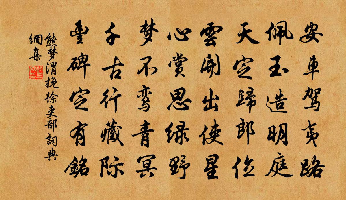 詩詞名句歷史字典書法欣賞書法字典國語詞典說文解字康熙字典古漢語字典標 題 作 者 詩 句 挽徐吏部作者:熊夢渭 朝代:宋代挽徐吏部原文安車駕夷路,佩玉造明庭。天定歸郎位,雲開出使星。心賞思綠野,夢不鸞青冥。千古行藏際,豐碑定有銘。詩詞問答問:挽徐吏部的作者是誰?答:熊夢渭問:挽徐吏部寫於哪個朝代?答:宋代熊夢渭挽徐吏部書法欣賞挽徐吏部書法作品詩詞推薦送翟簡卿制參赴南安二首李曾伯〔宋代〕自屈星屏佐碧油,艱危同濟此風舟。平山楊柳留佳話,庚嶺梅花想勝游。公到玉階宜抗論,我尋畫舸便歸休。他時太守林太博贈瑞香花劉克莊〔宋代〕短箋小草墨痕斜,句法來從和靖家。吟賞豈無神助筆,護持疑有物司花。莫因山鳥啼榕樹,便憶河豚飽荻芽。多少蟬徐照〔宋代〕葉落無蟬在,又隨林葉生。不離荒苑處,偏感異鄉情。幽韻松風合,枵腸竹露清。無端溪鳥逐,飛落地中行。雍台蕭衍〔南北朝〕日落登雍台。佳人殊未來。綺窗蓮花掩。網戶琉璃開。{艹/豐}茸臨紫桂。蔓延交青苔。月沒光陰盡。望子獨悠慶南樓居士周應合〔宋代〕南極垣頭現一星,輝光特著老人名。不隨東壁西庚照,要對南樓夜夜明。曆日許月卿〔宋代〕曆日從頭又一新,直饒燕雀喜新晴。梅花獻歲無邊景,喜鵲今朝第一聲。柳眼知時王幕綠,草心報國漢朝青。日晴麻線堆范成大〔宋代〕雲木湯胸起,郁峨一峰危。上有路千折,縺縷如縈絲。是為熊線堆,厥險天下稀。逼仄容半足,顛墜寧復稽。騰猱少年行(一作漢宮少年行)雍陶〔唐代〕不倚軍功有俠名,可憐球獵少年情。戴鈴健鶻隨聲下,撼珮驕驄弄影行。覓匠重裝燕客劍,對人新按越姬箏。豈知薦福寺講筵偶見又別(一作別後)韓偓〔唐代〕見時濃日午,別處暮鍾殘。景色疑春盡,襟懷似酒闌。兩情含眷戀,一餉致辛酸。夜靜長廊下,難尋屐齒看。寄襄陽王公子馬戴〔唐代〕君馬勒金羈,君家貯玉笄。白雲登峴首,碧樹醉銅鞮。澤廣荊州北,山多漢水西。鹿門知不隱,芳草自萋萋。春日春陪韓簽虞丞解監修禊事即席中有蝦菜梨曹彥約〔宋代〕雨餘春水壓堤沙,柳未花飛蒲茁芽。清流激湍石佛寺,崇山峻岭野人家。大酉之山檀溪壑,春俗未改書成車。居夷和內鄉李師甫長官見寄邵雍〔宋代〕雖未似神仙,能逃暑與寒。何嘗無水竹,未始離林巒。道不同新學,才難動要官。時和歲豐後,亦自有餘歡。前調李呂〔宋代〕兩鬢垂。珠璣滿斗猶慵起。玉馬象盤還得意。漏冷銅烏喚不應,更移紅燭桃花底花底。錦鋪地。繡浪瓊枝光似洗。安樂窩中吟邵雍〔宋代〕安樂窩中三月期,老來才會惜芳菲。自知一賞有分付,誰讓黃金無孑遺。美酒飲教微醉後,好花看到半開時。這般用舍弟韻送妹婿鄭子仁湖南漕試項安世〔宋代〕筆力追風力廄黃,詞源下峽九秋艎。經行帝子云敖地,祓飾騷人月璐章。親老一生兒共婿,吾衰七見暑成涼。門闌詠露珠韋應物〔唐代〕秋荷一滴露,清夜墜玄天。將來玉盤上,不定始知圓。送曹器遠從使虜陳造〔宋代〕暑風焮面黃塵底,曹侯據鞍輕萬里。曉趁官程夜未休,不為功名為知己。男兒生有四方誌,誰能挽眉婦車裡。周原青玉案(贈勉道琵琶人)趙彥端〔宋代〕當年萬里龍沙路。載多少、離愁去。冷壓層簾雲不度。芙蓉雙帶,垂楊嬌髻,弦索初調處。花凝玉立東風暮。曾記次韻黃貳車三絕句史彌寧〔宋代〕了卻文書可是痴,幅巾行散任風吹。揮毫颯颯詩驚雨,灑面蕭蕭雨送詩。偶得一絕劉錡〔宋代〕清風葉葉映黃鸝,綠暗紅稀半掩扉。我以忘言靜思慮,子規猶道不如歸。名句推薦笑十三楊柳女兒腰,東風舞。岳珂《滿江紅·小院深深》 一人飛升,仙及雞犬。蒲松齡《聊齋志異·卷四·促織》 月上柳梢頭,人約黃昏後。歐陽修《生查子·元夕》 蜂兒不解知人苦,燕兒不解說人愁。程垓《最高樓·舊時心事》 百歲落半途,前期浩漫漫。李白《登敬亭山南望懷古贈竇主簿》 兵起而程敵,政不若者勿與戰;食不若者勿與久;敵眾勿為客;敵盡不如,擊之勿疑。商鞅《商君書·戰法》 海畔尖山似劍鋩,秋來處處割愁腸。柳宗元《與浩初上人同看山寄京華親故》 至誠之道可以前知。國家將興,必有禎祥;國家將亡,必有妖孽。子思《中庸·第二十四章》 黯與山僧別,低頭禮白雲。李白《秋浦歌十七首》 空門寂寞汝思家,禮別雲房下九華。金地藏《送童子下山》