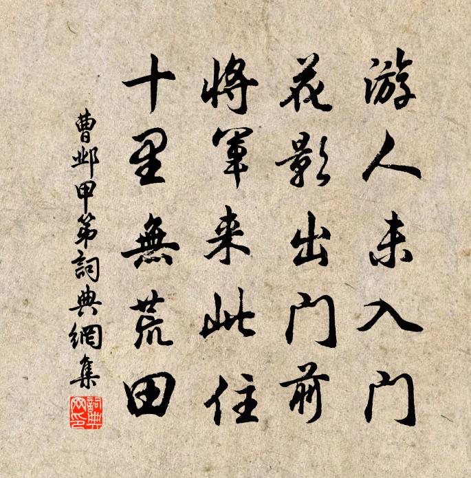 詩詞名句歷史字典書法欣賞書法字典國語詞典說文解字康熙字典古漢語字典標 題 作 者 詩 句 甲第作者:曹鄴 朝代:唐代甲第原文遊人未入門,花影出門前。將軍來此住,十里無荒田。詩詞問答問:甲第的作者是誰?答:曹鄴問:甲第寫於哪個朝代?答:唐代問:甲第是什麼體裁?答:五絕曹鄴甲第書法欣賞甲第書法作品注釋全唐詩詩詞推薦七兄初約登新樓作重陽敦前歲之盟適病足不能周必大〔宋代〕遍走三台一日中,前年樂事轉頭空。新樓期對萸並菊,舊約翻吟雨與風。魚繞長江殊有味,酒篘大甕浩無窮。登臨出山相贊釋紹曇〔宋代〕六年雪凍不死,見明星便說悟。走出山來一窖無,被人喚作赤鬚鬍。出潁口初見淮山是日至壽州蘇軾〔宋代〕我行日夜向江海,楓葉蘆花秋興長。平淮忽迷天遠近,青山久與船低昂。壽州已見白石塔,短棹未轉黃茅岡。波平之官新定同年李郎中以詩賦別即事感懷次韻上張伯玉〔宋代〕雨後驚濤激箭催,為君停櫂把離杯。宦遊向老令人笑,別恨傷春觸處來。故國未歸江令宅,全家且上子陵台。如今木蘭花慢 壽胡澗泉程文海〔元代〕耆英圖畫裡,笙鶴擁,地行仙。是曾識舊家,南宮禮樂,綾餤春筵。梅南早迎駰轡,凜霜威、風裁肅蠻煙。笑引霓春帖子詞夫人閣十首宋祁〔宋代〕雪罷雲初暖,天和日便遲。玉樓新燕子,禖下記來時。宿田家竹亭裘萬頃〔宋代〕我家西山巔,四壁皆此君。朅來事賓士,日與茅葦親。方思坡仙詩,恐入俗士群。止我宿者誰,此君滿其門。欣然聖柬將寓於衛行乞食於齊有可憐之色再次韻感黃庭堅〔宋代〕魯公但食粥,百口常憂煎。金張席貴寵,奴隸乘朱軒。丈夫例寒餓,萬世無後先。風霾天作惡,雷亦怒闐闐。俄頃泛霅溪程公許〔宋代〕旱嘆連旬塘水渾,移舟來泛霅溪雲。溪邊釣隱如無恙,那不嗤人骨俗氛。題赤城中岩寺周朴〔唐代〕浮世師休話,晉時燈照岩。禽飛穿靜戶,藤結入高杉。存沒詩千首,廢興經數函。誰知將俗耳,來此避囂讒。實禪者最省釋智愚〔宋代〕靈山禪起未溫席,卻問潮陽過海船。咨省壽堂春日靜,究心應記白雲邊。虞美人(同蔡寬夫置酒,王仲弓出歌人,聲甚妙)葉夢得〔宋代〕東風一夜催春到。楊柳朝來好。莫辭尊酒重攜持。老去情懷、能有幾人知。鳳台園裡新詩伴。不用相追喚。一聲清頌古二十九首釋師體〔宋代〕動口生荊棘,移身墮野狐。趙州來鬭富,東壁掛葫蘆。楊柳枝薛師石〔宋代〕汴水堤邊薪可束,永豐巷口綠成堆。盛衰到底皆惆悵,何不移根種馬嵬。頌十玄談塵異釋印肅〔宋代〕誰言卞璧無人鑒,但辦肯心終不賺,燎卻眉毛尚不知,詢岐欲往西天際。答屯田齊員外見贈宋祁〔宋代〕淹臥清漳續畔牢,平時賦筆謝登高。決科漫欲當三道,作頌何曾敵二豪。久侍經幃慚肉緩,驟歌樓雪覺心勞。兼金詠皖公山李家明〔唐代〕龍舟輕颭錦帆風,正值宸游望遠空。回首皖公山色翠,影斜不到壽杯中。偈十首釋正覺〔宋代〕衲僧巴鼻,圓明絕纇。直須推倒,卻要扶起。玉馬飲乾明月泉,泥牛耕破玻璃地。披毛戴角異中來,天上人間能幾謁金門(次韻鄭婺源)韓淲〔宋代〕行又住。水遠山遙村路。把酒問春春幾許。老年花似霧。坐上風流張緒。留我我還難去。卻憶章台飛柳絮。只愁縈過武寧縣(九月十九日)王周〔唐代〕行過武寧縣,初晴物景和。岸回驚水急,山淺見天多。細草濃藍潑,輕煙匹練拖。晚來何處宿,一笛起漁歌。名句推薦時見歸村人,沙行渡頭歇。孟浩然《秋登蘭山寄張五》 邊雪藏行徑,林風透臥衣。賈島《送鄒明府游靈武》 師嚴然後道尊,道尊然後民知敬學。戴聖《禮記·學記》 不 愛其親,豈能及物?姚思廉《陳書·列傳·卷十三》 客愁全為減,舍此復何之?杜甫《後游》 鳥聲有悲歡,我愛口流血。孟郊《苦寒吟》 滿紙荒唐言,一把辛酸淚!曹雪芹《紅樓夢·第一回》 報國無門空自怨,濟時有策從誰吐。吳潛《滿江紅·送李御帶珙》 有大略者,不可責以捷巧;有小智者,不可任以大功。劉安及其門客《淮南子·主術訓》 淒涼南浦,斷橋斜月。房舜卿《憶秦娥·與君別》