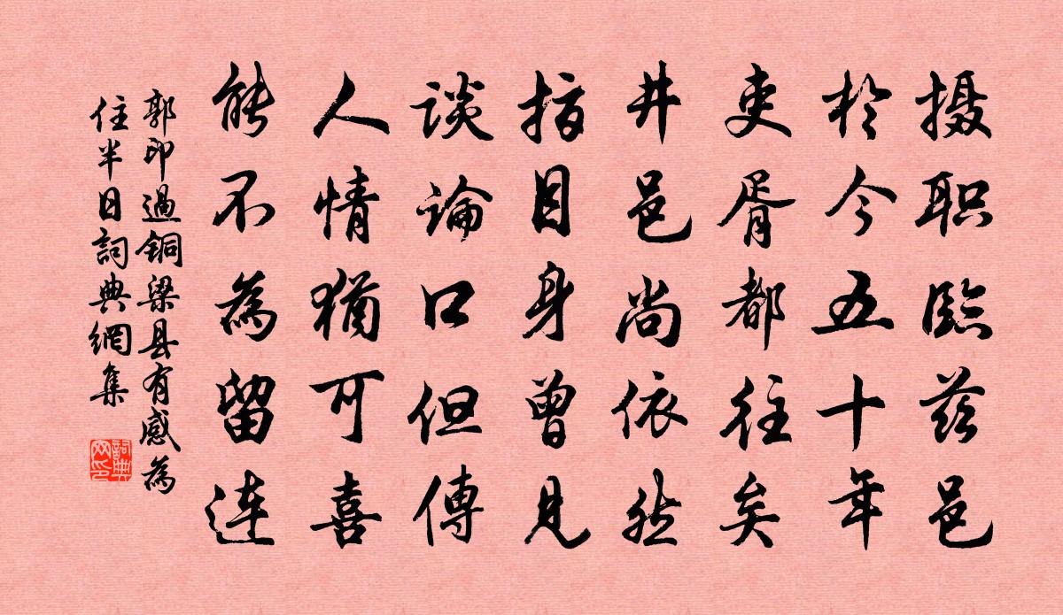 詩詞名句歷史字典書法欣賞書法字典國語詞典說文解字康熙字典古漢語字典標 題 作 者 詩 句 過銅梁縣有感為住半日作者:郭印 朝代:宋代過銅梁縣有感為住半日原文攝職臨茲邑,於今五十年。吏胥都往矣,井邑尚依然。指目身曾見,談論口但傳。人情猶可喜,能不為留連。詩詞問答問:過銅梁縣有感為住半日的作者是誰?答:郭印問:過銅梁縣有感為住半日寫於哪個朝代?答:宋代郭印過銅梁縣有感為住半日書法欣賞過銅梁縣有感為住半日書法作品詩詞推薦彭州上元二首李石〔宋代〕河漢無塵碧玉傾,萬枝燈里仰天庭。吾皇慈儉如堯舜,應有天邊退舍星。貴游羅隱〔唐代〕館陶園外雨初晴,繡轂香車入鳳城。八尺家僮三尺箠,何知高祖要蒼生。先雲洲訪予於萬玉歸而寄詩因用其韻釋文珦〔宋代〕曉行竺山心,草露濡衣襟。稽留雖在眼,謝客難重尋。靈木逾千齡,斤斧日見侵。侵伐殘未已,使我老氣瘖。雅樂送祖月上人王灼〔宋代〕月公別我浮三峽,欲往南中求 * 。此行初為梅州老,過嶺障煙恐難狎,掛帆勝指古鄱陽,驥子鳳鶵亦稱甲。十年幽居陸游〔宋代〕萬家水竹古山陰,揀得幽居愜素心。梁燕委巢知社近,井桐飄葉覺秋深。琴緣廢久塵常積,書為開稀蠹漸侵。幸自和陳生三首胡寅〔宋代〕車塵馬足兩紛綸,談叟渾如谷口真。鬧里光陰渠不駐,靜中滋味我嘗新。高眠展轉三竿日,熟飲頻煩一瓮春。請看資聖寺林夔孫〔宋代〕華峰跨蒼穹,下有雲一壑。翬飛二百秋,蜂巢幾千落。靈泉際空留,宿霧臨除薄。山呈萬古姿,竹隕六月籜。當年送劉大著赴任益州司理魏野〔宋代〕金口親除向錦川,一般監郡最榮遷。從來才已欺鸚鵡,此去冤應雪杜鵑。迎接僧攜筇竹杖,歌謠民寫浣花箋。移風送才夫之成都李流謙〔宋代〕客有可人期不來,昔人抱恨長悠哉。可得宦遊同一處,家有如願令人猜。郊東郊西踏春色,醉舞淋浪花插額。門前擬行路難鮑照〔南北朝〕璇閨玉墀上椒閣,文窗繡戶垂綺幕。中有一人字金蘭,被服纖羅蘊芳藿。春燕差遲風散梅,開幃對影弄禽爵。含歌飲東窗一首蘇籀〔宋代〕丈夫蘊挾胸懷奇,浩然幅郁乾虹霓。俚蜺婉孌習和雅,竊笑胡為瓶井湄。奈何平世事蹇蹇,奇士矯犖矜云為。伏波贈陳宣乾喻良能〔宋代〕嗜古心仍切,尋詩句益工。十年江左別,一笑日邊同。補外吾天幸,懷歸子道東。好為旬朔款,解榻待春風。何元立示九日詩臥病累日乃能次韻陸游〔宋代〕何郎戲寫菊花秋,落筆縱橫豈易酬。豪士乃能為老伴,寓公那得稱遨頭。早衰不耐危亭冷,獨臥空驚畫角愁。病起減字木蘭花陳三聘〔宋代〕殷勤舉白。昨夜東風猶有雪。莫恨春遲。曾見梅花第一枝。陰晴未決。早晚清明新火活。夢繞秦樓。欲趁歸潮上客癸未守歲陽枋〔宋代〕歲宜鄉里守,杯共弟兄銜。明日人相問,行年五十三。和秉彝李君五偈釋智愚〔宋代〕呈瑞喧傳是有年,眼前分曉被人謾。自家冷暖知來處,老骨從前不怕寒。次韻知郡郎中應期喜雪強至〔宋代〕公將民欲達天心,瑞雪如期白晝陰。皓色恍疑霄宇接,濃寒都為歲華深。辭妍席右人雄贍,興盡溪邊客訪尋。鈴閣壽傅守釋若芬〔宋代〕教令浮民一歲期,只將平易抗澆漓。朝廷若用循良課,換取樵川老吏歸。寄黃從善黃庭堅〔宋代〕故人千里隔談經,想見牛刀刃發硎。渴雨芭蕉心不展,未春楊柳眼先青。鳧飛葉縣郎官宰,虹貫江南處士星。天子簡寄鄭將使曾豐〔宋代〕經史舊家風,薰陶磊塊胸。書堪乾乙夜,學未輟三冬。豹略得無用,虎頭能不封。漢勛留我頌,相許細形容。名句推薦漢家天馬出蒲梢,苜蓿榴花遍近郊。李商隱《茂陵》 別來半歲音書絕,一寸離腸千萬結。韋莊《應天長·別來半歲音書絕》 天意眷我中興,吾皇神武,踵曾孫周發。黃中輔《念奴嬌·炎精中否》 經傳之文,賢聖之語,古今言殊,四方談異也。王充《論衡·卷三十·自紀篇》 紛披乍依迥,掣曳或隨風。李世民《詠興國寺佛殿前幡》 寺憶曾游處,橋憐再渡時。杜甫《後游》 不知天外雁,何事樂長征?徐禎卿《在武昌作》 古人不見今時月,今月曾經照古人。佚名《增廣賢文·上集》 邂逅淇南,歲寒獨在,故人襟抱。王惲《水龍吟·送焦和之赴西夏行省》 送君不相見,日暮獨愁緒。孟浩然《送辛大之鄂渚不及》