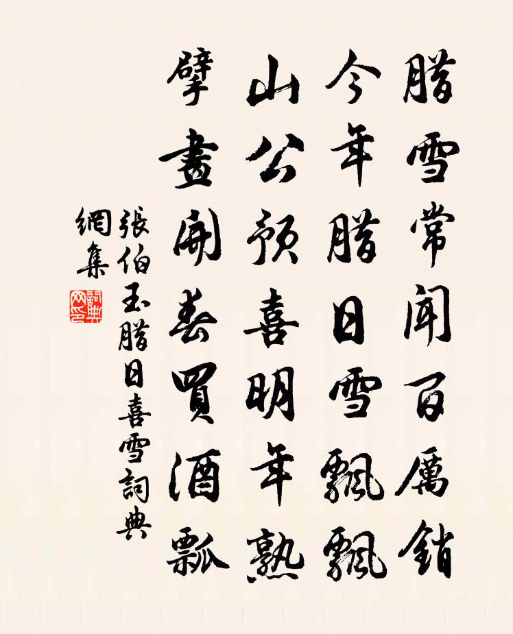 詩詞名句歷史字典書法欣賞書法字典國語詞典說文解字康熙字典古漢語字典標 題 作 者 詩 句 臘日喜雪作者:張伯玉 朝代:宋代臘日喜雪原文臘雪常聞百厲銷,今年臘日雪飄飄。山公預喜明年熟,擘畫開春買酒瓢。詩詞問答問:臘日喜雪的作者是誰?答:張伯玉問:臘日喜雪寫於哪個朝代?答:宋代張伯玉臘日喜雪書法欣賞臘日喜雪書法作品詩詞推薦菊花新葛長庚〔宋代〕弱水去蓬萊,四萬八千里。遠漠漠,俯仰天水青無際。鳥飛不到船去難,渺無依。翦錦字。雲信待憑鸞翼。青芝素送人游淮海(一作宿友人池)溫庭筠〔唐代〕背檣燈色暗,宿客夢初成。半夜竹窗雨,滿池荷葉聲。簟涼秋閤思,木落故山情。明發又愁起,桂花溪水清。馬上口占張栻〔宋代〕向來一雪壓霾昏,曉跨征鞍傍水村。七十二峰俱玉立,巍然更覺祝融尊。雪凍未解散策郡圃楊萬里〔宋代〕積雪偏工霽後凝,不妨冷極不妨清。靜聞檐滴元無雨,倒掛冰牙未怕晴。獨往獨來銀粟地,一行一步玉沙聲。圃中三日上辛祈谷除日宿齋戶部右曹元日賦三絕句蘇轍〔宋代〕北客南來歲欲除,燈山火急萬人扶。欲觀翠輦巡遊盛,深怯南宮鎖錀拘。如歸亭何永錫〔宋代〕獨臨朱檻愛平波,安穩歸舟兩兩過。數島雲霞栽橘社,一汀煙月采菱歌。湖心日定施青黛,砌下風恬展碧羅。好寫送曹縣丞入京朱長文〔唐代〕忠義家聲久,夫群更美才。吏民愁既去,交友約重來。別岫浮雲遠,征帆曉月開。棣華同郡府,眷戀共銜杯。實弟以詩來督作會文又因太原侄寄聲欲作不速胡宏〔宋代〕苦參道難學,放肆事容易。入腳不可深,駸駸成自棄。寄外劉彤〔宋代〕盡扇停揮白日長,清風細細襲羅裳。女重來報新簪熟,安得良人共一觴。清平樂晏幾道〔宋代〕笙歌宛轉。台上吳王宴。宮女如花倚春殿。舞綻縷金衣線。酒闌畫燭低迷。彩鴛驚起雙棲。月底三千繡戶,雲間十滄洲白鷺軒五首汪炎昶〔宋代〕雲影天光匝釣磯,氈毳微展雪毛衣。不知妙得天然趣,只道驚人意欲飛。呈周務本三絕鄭剛中〔宋代〕民因吏擾愈荒疲,不得田園破一犁。此邑端須知令尹,春來處處麥連畦。蝶戀花(題愛閣)葛長庚〔宋代〕冷雨疏風涼漠漠。雲去雲來,萬里秋陰薄。笑倚玉闌呼白鶴。煙籠素月青天角。竹影松聲渾似昨。醉膽如天,誰道詠史(六首選—)袁枚〔清代〕東漢恥機權,君子多硜硜。悲哉陳與竇,謀疎功不成。其時涼州反,有人頒孝經;意欲口打賊,賊聞笑不勝。雖無峽州甘泉寺陸游〔宋代〕江上甘泉寺,登臨擅一州。山亭喜無恙,老子得重遊。灘急常疑雨,林深欲接秋。歸途更清絕,倚杖喚漁舟。送僧歸護國寺晏殊〔宋代〕海嶠黃金剎,安禪不記秋。來膺臣宰召,歸泛越人舟。達性融三界,隨緣極四流。還持雙股錫,拂蘚坐岩幽。覽古四十二首 其三十六楊維楨〔元代〕小兒賀季真,棄官亦棄宅。遠謁王道者,去問術黃白。何物袖中藏,去道萬里隔。挽南皋劉二先生劉克莊〔宋代〕久無羔雁聘遺賢,白首邱園氣最全。聊與荊公續詩選,不聞譙叟入經筵。講師翁庶幾三昧,樸學余才說一篇。兩侍白髮趙汝鐩〔宋代〕朱顏留不住,白髮自應生。摘了依然有,徙勞打鑷聲。春夜溫故六言二十首劉克莊〔宋代〕京檜皆黃髮老,攸熺各黑頭公。當時號為小相,至今嘆作頑童。名句推薦大樹底下好遮陰張南莊《何典·第十回》 密雲雙鳳,初破縷金團。米芾《滿庭芳·詠茶》 世風之狡詐多端,到底忠厚人顛撲不破王永彬《圍爐夜話·第 * 則》 聞道皇華使,方隨皂蓋臣。王維《送李判官赴東江》 幾度東風吹世換,千年往事隨潮去。戴復古《滿江紅·赤壁懷古》 戎馬關山北,憑軒涕泗流。杜甫《登岳陽樓》 行人悵望蘇台柳,曾與吳王掃落花。姜夔《姑蘇懷古》 酹酒蒼茫,倚歌平遠,亭上玉虹腰冷。吳文英《十二郎·垂虹橋》 落梅庭榭香,芳草池塘綠。晏幾道《生查子·落梅庭榭香》 心事孤山春夢在,到思量、猶斷詩魂吳文英《極相思·題陳藏一水月梅扇》