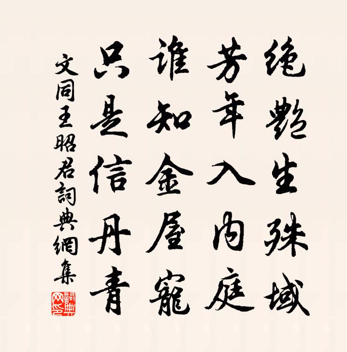 詩詞名句歷史字典書法欣賞書法字典國語詞典說文解字康熙字典古漢語字典標 題 作 者 詩 句 王昭君作者:文同 朝代:宋代王昭君原文絕艷生殊域,芳年入內庭。誰知金屋寵,只是信丹青。詩詞問答問:王昭君的作者是誰?答:文同問:王昭君寫於哪個朝代?答:宋代文同王昭君書法欣賞王昭君書法作品詩詞推薦和林和靖先生梅韻胡銓〔宋代〕紛紛紅紫勿相猜,自古騷人酷嗜梅。皂蓋折花憐老杜,黃梅時雨憶方回。一生耐凍天憐惜,滿世趨炎我獨來。桃李新年呈友許棠〔唐代〕一月月相似,一年年不同。清晨窺古鏡,旅貌近衰翁。處世閒難得,關身事半空。浮生能幾許,莫惜 * 。次韻徐庭珍春日雜言十首陳棣〔宋代〕輕陰醞釀勒花天,節物撩人接禁菸。沂上未成曾點服,杖頭聊掛阮生錢。趙提舉求作字余辭以不能工仍作詩謝之家鉉翁〔宋代〕少年振臂入場屋,寸晷謾書夸拙速。中年收斂歸法度,不能為顏僅為谷。晚歲頗為憂患困,弱腕不禁事物逐。要之秋日舟中有感梅堯臣〔宋代〕天乎余困甚,失偶淚傍沱。世事隨時遠,秋風順水多。鰥魚空戀穴,獨鳥未離柯。歲月都無幾,存亡可奈何。兒嬌重經烏石舖楊時〔宋代〕夾屋青松翠靄中,去年經此亦匆匆。重來烏石岡頭路,依舊松聲帶曉風。賜蘇易簡宋太宗〔宋代〕翰林承旨貴,清淨玉堂中。套用鹹依式,深嚴比更崇。歸家思值日,入內集英風。儒措門生盛,高明大化雄。彭湖道中雜書五首方回〔宋代〕近傳群盜息,稍免大軍興。閉戶聞村學,挑包遇野僧。籬間犬見客,狂吠極堪憎。病足歌彭龜年〔宋代〕馬有足,疲馳驅。牛有足,勞畲菑。不如大閽無更好,終日兀坐如黏黐。人言猶有深意存,螣蛇無足終能飛。此心送偶能禪者釋重顯〔宋代〕湖繞嚴城列象寬,萬家台榭水光寒。片帆隱隱生遙極,誰問曹溪意轉難。故慶雲長老{恭共換人}贊周必大〔宋代〕七尺軀,歸底處。一尺素,寫得住。余忠肅典贍益辨二帖贊岳珂〔宋代〕珥貂佩玉之舒徐兮。引筆行墨這豐腴兮。閱世論人以其書兮。尚可以想應元之初兮。寄吳明輔秘丞戴復古〔宋代〕吾鄉幸有吳夫子,星斗網羅文字胸。百鳥收聲聽鳴鳳,千山落木秀孤松。旁通滄海江山水,高壓雲城帢幘峰。每見臨水坐白居易〔唐代〕昔為東掖垣中客,今作西方社內人。手把楊枝臨水坐,閒思往事似前身。精衛填海佚名〔先秦〕又北二百里,曰發鳩之山,其上多柘木,有鳥焉,其狀如烏,文首,白喙,赤足,名曰:“精衛”,其鳴自詨。是王敬伯歌李端〔唐代〕妾本舟中女,聞君江上琴。君初感妾意,妾亦感君心。遂出合歡被,同為交頸禽。傳杯唯畏淺,接膝猶嫌遠。侍婢寄題不礙雲軒二首丁黼〔宋代〕駕鶴歸三島,騎麟入九霄。祗應明月夜,來此坐 * 。句元稹〔唐代〕兒歌楊柳葉,妾拂石榴花。松門待制應全遠,藥樹監搜可得知。髻鬟峨峨高一尺,門前立地看春風。題月下梅花王冕〔元代〕平生愛梅頗成癖,踏雪行穿一雙屐。六花散漫飛滿空,千里萬里同一色。沖寒不畏朔風吹,乘興來此江之湄。繁花和永叔郡齋聞百舌梅堯臣〔宋代〕響舌能令百鳥羞,聽時丹杏發山郵。春雲不定雨來急,濕翅蒼茫高樹頭。名句推薦蕭條亭障遠,悽慘風塵多庾信《擬詠懷二十七首·其二十六》 山暝聞猿愁,滄江急夜流。孟浩然《宿桐廬江寄廣陵舊遊》 妙極生知,睿哲惟宰。精理為文,秀氣成采。劉勰《文心雕龍·徵聖》 知其不可奈何而安之若命,德之至也。莊子《莊子·內篇·人間世》 山有木兮木有枝,心悅君兮君不知。佚名《越人歌》 暝色入高樓,有人樓上愁。李白《菩薩蠻·平林漠漠煙如織》 罩向金籠好羽儀,分明喉舌似君稀僧定渚《詠鸚鵡》 老至居人下,春歸在客先。劉長卿《新年作》 傷心故人去後,冷落新詩。晁沖之《漢宮春·梅》 淺情終似,行雲無定,猶到夢魂中。晏幾道《少年游·離多最是》