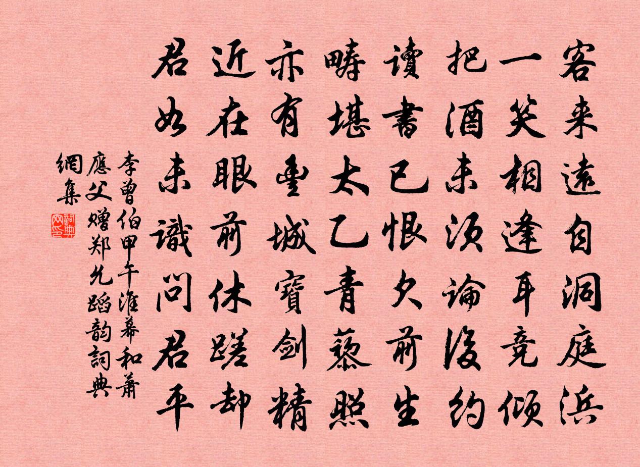 詩詞名句歷史字典書法欣賞書法字典國語詞典說文解字康熙字典古漢語字典標 題 作 者 詩 句 甲午淮幕和蕭應父贈鄭允蹈韻作者:李曾伯 朝代:宋代原文客來遠自洞庭浜,一笑相逢耳競傾。把酒未須論後約,讀書已恨欠前生。疇堪太乙青藜照,亦有豐城寶劍精。近在眼前休蹉卻,君如未識問君平。詩詞問答問:《甲午淮幕和蕭應父贈鄭允蹈韻》的作者是誰?答:李曾伯問:該詩寫於哪個朝代?答:宋代書法欣賞甲午淮幕和蕭應父贈鄭允蹈韻書法作品詩詞推薦嘲桃李商隱〔唐代〕無賴夭桃面,平明露井東。春風為開了,卻擬笑春風。登安陽城樓孟浩然〔唐代〕縣城南面漢江流,江嶂開成南雍州。才子乘春來騁望,群公暇日坐銷憂。樓台晚映青山郭,羅綺晴嬌綠水洲。向夕浣溪沙朱敦儒〔宋代〕雨濕清明香火殘。碧溪橋外燕泥寒。日長獨自倚闌乾。脫籜修篁初散綠,褪花新杏未成酸。江南春好與誰看。天平先隴道中,時將赴新安掾范成大〔宋代〕霜橋冰澗淨無塵,竹塢梅溪未放春。百疊海山鄉夢熟,三年江路旅愁生。松楸永寄孤窮淚,泉石終收漫浪身。好住宣州送裴坦判官往舒州時牧欲赴官歸京杜牧〔唐代〕日暖泥融雪半銷,行人芳草馬聲驕。九華山路雲遮寺,清弋江村柳拂橋。君意如鴻高的的,我心懸旆正搖搖。同來月橋詩喻良能〔宋代〕天迥月逾晶,地偏人亦靜。簫然尋丈橋,寄此綠淨境。洗盞薦寒光,掬泉弄清影。塵遠耳目醒,令人發深省。峽路山行即事十首袁說友〔宋代〕倚風修竹葉滋繁,穿石湍流浪吐吞。薄暮柴門人影寂,曉風煙樹鳥鳴喧。眉州燕遊雜詠十首起文堂晁公溯〔宋代〕天地有萬籟,中存韶濩音。斯文未嘗廢,但見古猶今。滿庭芳(九日用淵明二詩作)趙鼎〔宋代〕靡靡流光,淒淒風露,小園草木初凋。杳然塵影,爽氣界天高。愛此佳名重九,隨宜對、秋菊持醪。登臨處,哀蟬感興薛嵎〔宋代〕簞瓢吾道在,此樂語人難。遺卻形骸累,始知天地寬。遠山不辨樹,高屋易生寒。數夜雪風忽,編蘆壁未完。謝人惠千葉牡丹蘇轍〔宋代〕東風催趁百花新,不出門庭一老人。天女要知摩詰病,銀瓶滿送洛陽春。可憐最後開千葉,細數余芳尚一旬。更待雨夜楊萬里〔宋代〕歲晚能無感,詩成只獨喔。螢光寒欲淡,秋雨暮偏多。伴老貧無恙,留愁酒肯麽。吟蟲將落葉,為我拍還歌。呈張太平三首趙蕃〔宋代〕門牆十五載,每見辱加親。老至名不立,道乖家轉貧。世誰能我及,志欲向公申。剩欲搜詩獻,青山恐笑人。五方帝佚名〔宋代〕太宇清明,宣以方色。沛哉靈游,昭示幽則。崇配尊親,惟茲孝德。神熙蕃丕,涵育四極。望蓬萊馬鈺〔元代〕馬風子,因遇棄榮華。乞覓殘餘為活計,真清真淨做生涯。烹煉白硃砂。人莫笑。一志實堪夸。大道朝聞甘夕死,白髮顧逢〔宋代〕一莖白一莖,兩鬢忽然更。難把黃金買,從教青鏡明。染來不似舊,鑷去又重生。多少人無此,相看未可輕。偈頌三十八首釋如淨〔宋代〕掩室摩竭國,老胡豁開頂門。杜口毗耶城,淨名敗缺話柄。提上古兩端公案,發今朝一段威光。竹窗王安石〔宋代〕竹窗紅莧兩三根,山色遙供水際門。只我近知牆下路,能將屐齒記苔痕。雜曲歌辭。竹枝顧況〔唐代〕帝子蒼梧不復歸,洞庭葉下荊雲飛。巴人夜唱竹枝後,腸斷曉猿聲漸稀。眼兒媚馮偉壽〔宋代〕自顰雙黛聽啼鴉。簾外翠煙斜。社前風雨,已歸燕子,未入人家。鞋兒試著無人看,莫是忒寬些。想它樓上,悶拈名句推薦春江潮水連海平,海上明月共潮生。張若虛《春江花月夜》 君子以同而異。佚名《易傳·象傳下·睽》 一觴雖獨盡,杯盡壺自傾。陶淵明《飲酒·其四》 亂碧萋萋,雨後江天曉。梅堯臣《蘇幕遮·草》 仕宦當作執金吾,娶妻當得陰麗華。范曄《後漢書·本紀·皇后紀上》 天道遠,人道邇,非所及也,何以知之?左丘明《左傳·昭公·昭公十八年》 事無終始,無務多業。墨子《墨子·02章 修身》 波瀾誓不起,妾心古井水。孟郊《列女操 / 烈女操》 智用於眾人之所不能知,而能用於眾人之所不能見。王詡《鬼谷子·謀篇》 聞道長安燈夜好,雕輪寶馬如雲。毛滂《臨江仙·都城元夕》