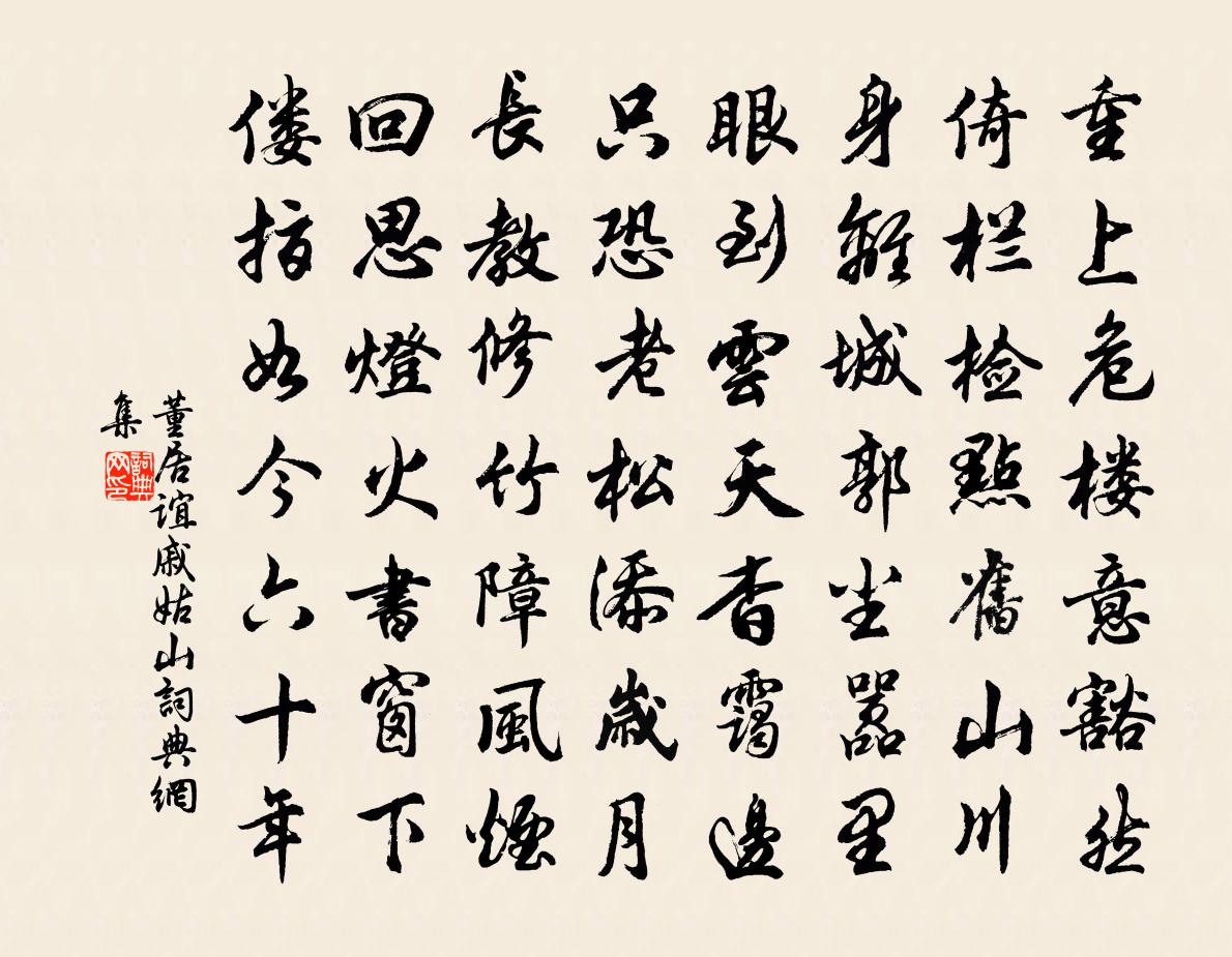 詩詞名句歷史字典書法欣賞書法字典國語詞典說文解字康熙字典古漢語字典標 題 作 者 詩 句 戚姑山作者:董居誼 朝代:宋代戚姑山原文重上危樓意豁然,倚欄檢點舊山川。身離城郭塵囂里,眼到雲天杳靄邊。只恐老松添歲月,長教修竹障風煙。回思燈火書窗下,僂指如今六十年。詩詞問答問:戚姑山的作者是誰?答:董居誼問:戚姑山寫於哪個朝代?答:宋代董居誼戚姑山書法欣賞戚姑山書法作品詩詞推薦次韻胡景參制機見壽二首陳著〔宋代〕南風吹笠走長須,一軸新詩一幅書。虎榜陳人有韓愈,鶴山佳婿得肩吾。行年八十死將似,求活須臾計已疏。慚愧詠懷八十二首·其一阮籍〔魏晉〕夜中不能寐,起坐彈鳴琴。薄帷鑒明月,清風吹我襟。孤鴻號外野,翔鳥鳴北林。徘徊將何見,憂思獨傷心。和李才甫先輩快閣五首黃庭堅〔宋代〕西南佳氣浮馬祖,東北祥風繞靜居。山邑豐年人少訟,身來訪道得齋魚。官滿寓濟川館得葉嘉仲和朱宰梅花詩次韻雲作戴栩〔宋代〕愛日經檐暖,游蜂撲紙窗。吾生豈拘束,一笑俯濤江。崖邊積雪取食清甚賦此張栻〔宋代〕陰崖積雪射寒光,入齒清甘得味嘗。應是山神知客意,故將瓊液沃詩腸。題招提院靜照堂聞人安壽〔宋代〕名藍小隱愜高情,雅構堂深豁眼明。萬慮平時身可外,一軒安處道初生。花縈寶砌當春盛,香滿金爐入座清。復有嘉禾頌七章章四句吳泳〔宋代〕中和既時,重穎既垂。自響其本,豈不爾思。送鑒座主釋智愚〔宋代〕紙燈吹滅尚迂迴,直至如今心未灰。台石鮮花將半蝕,不知焚鈔復誰來。漱玉灘陳岩〔宋代〕水石相逢驟作聲,鏗然律呂自天成。山中縱泛知音聽,亦有流魚傍岸行。望秦川歌周麟之〔宋代〕雨聲鳴棧不堪聽,盡日穿雲上杳冥。羯鼓催花渾不記,曲中空唱雨霖鈴。贈黃縣尉二首項安世〔宋代〕幾日真成去道州,如今未發已先愁。一城對酒猶疏闊,千里題詩底唱酬。雁不到君濂字水,魚應過我直名州。登臨游三岳山喬行簡〔宋代〕疑是乘風到九天,不知身在此山巔。萬家攢簇炊煙底,一水縈紆去鳥邊。便學塵緣輕似羽,何妨詩意涌如泉。停杯題楊秀才園三亭見山王炎〔宋代〕窗間酒榼與詩編,窗外山光翠入簾。山好要人能領略,直須胸次似陶潛。滿江紅(壽太守趙司直)佚名〔宋代〕太守風流,管領盡、十分春色。開藩了、萬花妝就,舒長化國。太白方觀宮錦樣,老人又現端門側。聽螺州、千里仇家酒白居易〔唐代〕年年老去歡情少,處處春來感事深。時到仇家非愛酒,醉時心勝醒時心。上王侯重九前蠲不濟寺債陳宓〔宋代〕史君救弊知原本,民賴浮屠產力寬。保障便為今日計,功名留與百年看。喜聞白紙租都放,不飲黃花酒亦歡。晨起溪庵十首劉克莊〔宋代〕戶外履綦常不到,手中鋤柄少曾閒。古時廢地今花塢,昨日荒陂忽蓼灣。牧馬童乖能識路,操蛇神黠怕移山。顏曾送別長翁制乾制赴審察程公許〔宋代〕戎幕接談笑,薦函聊姓名,自憐風退鷁,快見浪翻鯨。知己方面軍圖任,聊鑣夐有勞。明堂足材具,社櫟復何營。青玉案謝逸〔宋代〕蘆花飄雪迷洲渚。送秋水、連天去。一葉小舟橫別浦。數聲鴻雁,兩行鷗鷺。天淡瀟湘暮。蓬窗醉夢驚簫鼓。回首聞梅李處權〔宋代〕岩寺報梅開,可是知時節。映竹已蕭疏,臨流復清絕。正須幽士賞,莫縱狂僧折。山寒雲霧深,日暮更飛雪。名句推薦日夕涼風至,聞蟬但益悲。孟浩然《秦中感秋寄遠上人 / 秦中寄遠上人》 綠葉兮素華,芳菲菲兮襲予;屈原《九歌》 教也者,長善而救其失者也。戴聖《禮記·學記》 積學以儲寶,酌理以富才劉勰《文心雕龍·神思》 直道相思了無益,未妨惆悵是清狂。李商隱《無題·重幃深下莫愁堂》 君子務修其內而讓之於外。荀子《荀子·儒效》 黃葉古祠寒雨積,清山荒冢白雲多。于謙《岳忠武王祠》 凡傷寒之病,多從風寒得之。始表中風寒,入里則不消矣。張仲景《傷寒論·傷寒例》 東山老,可堪歲晚,獨聽桓箏。葉夢得《八聲甘州·壽陽樓八公山作》 窗白一聲雞,枕函聞馬嘶。顧貞觀《菩薩蠻·山城夜半催金柝》