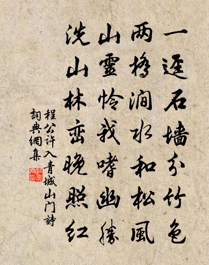 詩詞名句歷史字典書法欣賞書法字典國語詞典說文解字康熙字典古漢語字典標 題 作 者 詩 句 入青城山門詩作者:程公許 朝代:宋代入青城山門詩原文一逕石牆分竹色,兩橋澗水和松風。山靈憐我嗜幽勝,洗山林巒晚照紅。詩詞問答問:入青城山門詩的作者是誰?答:程公許問:入青城山門詩寫於哪個朝代?答:宋代程公許入青城山門詩書法欣賞入青城山門詩書法作品詩詞推薦偈頌六十五首釋普濟〔宋代〕一隊衲僧來,一隊衲僧去。打破睦州關,大地無寸土。滿江紅 登汪師展江樓次張周卿韻魏初〔元代〕落日江樓,山不盡、亂雲橫碧。還又見、人家煙火,倚天青壁。貔虎夜攢分遠近,魚龍入海無南北。道軍門、昨夜書事劉克莊〔宋代〕市朝無處避喧啾,思駕飛車事遠遊。古志曾雲壽多辱,前賢亦說耄宜休。愈訶彼佛為夷鬼,跖罵吾師作盜丘。安得湖上作陸游〔宋代〕耳目聰明手足輕,應酬幽事未忘情。百年日向漁樵過,千里雲從幾席生。樽酒每招鄰父共,圖書時與小兒評。但余江南曲李叔卿〔唐代〕湖上女,江南花,無雙越女春浣紗。風似箭,月如弦,少年吳兒曉進船。郗家子弟謝家郎,烏巾白袷紫香囊。菱歌重贈劉琨詩盧諶〔魏晉〕璧由識者顯。龍因慶雲翔。茨棘非所憇。翰飛游高岡。餘音非九韶。俁以儀鳯凰。新城非芝圃。曷由殖蘭芳。江州第十二文天祥〔宋代〕戎馬暗天宇,落日九江流。元惡迷是似,化作黃長虬。送晦翁十首王阮〔宋代〕精微元不在河汾,原道詞雄亦淺聞。自得正心誠意論,始知天未喪斯文。宮亭湖黃庭堅〔宋代〕左手作圓右手方,世人機敏便可爾。一風分送南北舟,斟酌鬼神宜有此。江津留語同濟僧,他日求我於宮亭。吁嗟夏日泛秘湖周弼〔宋代〕朝來泛舟花滿湖,亭午返棹風相呼。已收波浪入菱芡,晚開雲日媚菰蒲。群飛鼓翼數沙雁,一去沒頭雙野鳧。少留晚春二首呂祖謙〔宋代〕風絮流花一任渠,北窗高臥綠陰初。閉門春色閒中老,為謝平生董仲舒。司徒侍中杜正獻公輓辭五首蘇頌〔宋代〕任重嘗當國,功成急引年。榮華脫屣去,名節掩棺全。白日佳城遠,清風舉世傳。誄終朝有法,大行特高前。寄題喻叔奇國傅郎中園亭二十六詠野塘楊萬里〔宋代〕鴈下菰蒲報夕寒,鷺將荇藻作朝餐。野塘只許野人到,不要金張許史看。天池杜甫〔唐代〕天池馬不到,嵐壁鳥才通。百頃青雲杪,層波白石中。鬱紆騰秀氣,蕭瑟浸寒空。直對巫山出,兼疑夏禹功。魚龍食菱楊萬里〔宋代〕雞頭吾弟藕吾兄,頭角嶄然也不爭。白璧中藏煙水晦,紅裳左祖雪花明。一生子木非知已,千載靈均是主盟。每到壽馬裕齋觀文右江之水,三章,章四句陳著〔宋代〕春日載陽,薄言采芑。泳之游之,民之洽矣。聞新池擬就僧僦地未遂陳宓〔宋代〕一盆堪作沼,尋丈詎非塘。底用荷花盛,方能心境涼。忍將禾黍地,鑿出水雲鄉。極目平疇闊,時看白鷺翔。詩一首趙順孫〔宋代〕母在堂前為父憂,特令兒子謁公侯。大人若肯行方便,一點春風在筆頭。雜曲歌辭。宮中三台二首王建〔唐代〕魚藻池邊射鴨,芙蓉園裡看花。日色柘袍相似,不著紅鸞扇遮。池北池南草綠,殿前殿後花紅。天子千年萬歲,未樊江觀梅陸游〔宋代〕莫笑山翁老據鞍,探梅今夕到江乾。半灘流水浸殘月,一夜清霜催曉寒。倚醉更教重秉燭,怕寒元自怯憑欄。誰知名句推薦居庸關上子規啼,飲馬流泉落日低。朱彝尊《出居庸關》 相逢不飲空歸去,洞口桃花也笑人。佚名《增廣賢文·上集》 赤壁磯頭,一番過、一番懷古。戴復古《滿江紅·赤壁懷古》 寒氣先侵玉女扉,清光旋透省郎闈。李商隱《對雪二首》 正蹇驢吟影,茶煙灶冷,酒亭門閉。吳文英《無悶·催雪》 苟利國家生死以,豈因禍福避趨之。林則徐《赴戍登程口占示家人·其二》 紅葉黃花秋意晚,千里念行客。晏幾道《思遠人·紅葉黃花秋意晚》 西風亂葉溪橋樹。秋在黃花羞澀處。張榘《青玉案·被檄出郊題陳氏山居》 斜風細雨不須歸。蘇軾《浣溪沙·漁父》 雨中百草秋爛死,階下決明顏色鮮。杜甫《秋雨嘆三首》