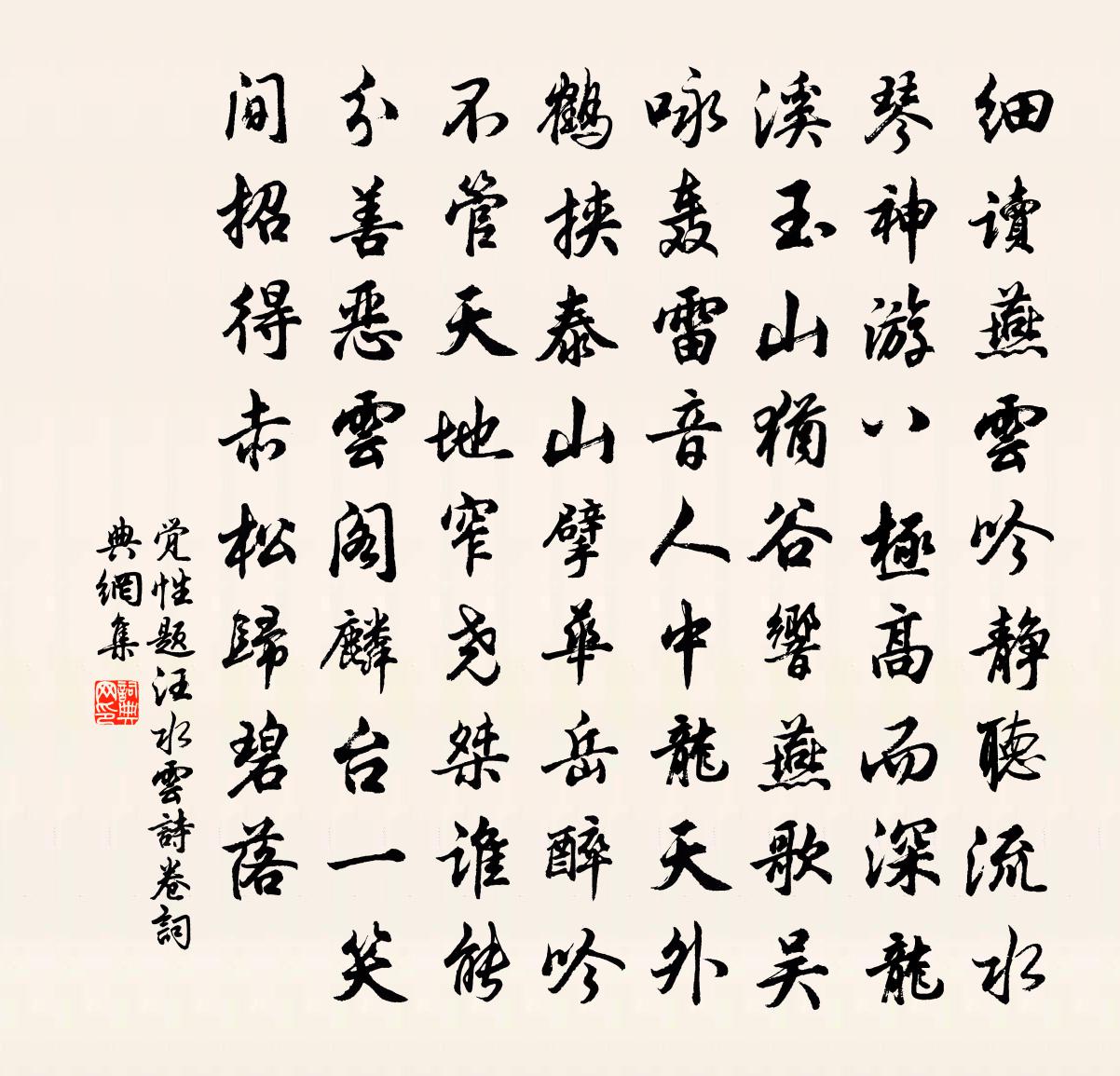 詩詞名句歷史字典書法欣賞書法字典國語詞典說文解字康熙字典古漢語字典標 題 作 者 詩 句 題汪水雲詩卷作者:覺性 朝代:宋代題汪水雲詩卷原文細讀燕雲吟,靜聽流水琴。神遊八極高而深,龍溪玉山猶谷響,燕歌吳詠轟雷音。人中龍,天外鶴。挾泰山,擘華岳。醉吟不管天地窄,堯桀誰能分善惡。雲閣麟台一笑間,招得赤松歸碧落。詩詞問答問:題汪水雲詩卷的作者是誰?答:覺性問:題汪水雲詩卷寫於哪個朝代?答:宋代覺性題汪水雲詩卷書法欣賞題汪水雲詩卷書法作品詩詞推薦牡丹鄭谷〔唐代〕畫堂簾卷張清宴,含香帶霧情無限。春風愛惜未放開,柘枝鼓振紅英綻。最高樓佚名〔宋代〕司春有序,排次到荼。遠預報,在庭知。蕊珠宮裡晨妝罷,披香殿下曉班齊。探花正、驅使問,菊花期。元不遜、寄贈翠岩奉上人戴叔倫〔唐代〕蘭若倚西岡,年深松桂長。似聞葛洪井,還近贊公房。掛衲雲林淨,翻經石榻涼。下方一回首,煙露日蒼蒼。詠史上魏相陳普〔宋代〕人倫大變歲二百,蕭曹以來誰在心。相業更生王吉疏,文學春秋猶未深。次韻王廷老寄子瞻蘇轍〔宋代〕歌吹新成百尺台,青山臨水巧崔嵬。佳人解作回文語,狂客能鳴摻鼓雷。擷菊傳杯醒復醉,采菱盪漿去仍回。新年觀舞女施肩吾〔唐代〕纏紅結紫畏風吹,裊娜初回弱柳枝。買笑未知誰是主,萬人心逐一人移。幽居即事陸游〔宋代〕屏居江海涯,杳杳菰蒲深,俛仰夏令中,澤國正多陰。桑椹熟以紫,水鳥時遺音。偶得一瓢酒,鄰里聊相尋。青苔篇曹勛〔宋代〕陵陸變滄海,復作清淺流。扶疎蕊淵桂,先驚蒲柳秋。姑蘇台未乾,坐見麋鹿游。秦皇正遊覽,黃屋指沙丘。乃知讀張子房傳華岳〔宋代〕英雄欲立異時名,四體難逃五鼎烹。何事秦車已虀粉,子房和客總全生。拜嚴方范祠趙蕃〔宋代〕東都重風節,先生實啟之。有士蓋如此,不拯家國危。乃知大廈傾,未易一木支。我讀黨錮傳,涕流每交頤。往來和人見贈四首曹勛〔宋代〕嘗借虜前三尺地,從容壯節進銅盤。如今袖手林泉去,惟喜天開二聖歡。贈楊德祖王粲〔魏晉〕我君餞之。其樂泄泄。選人歌佚名〔唐代〕今年選數恰相當,都由座主無文章。案後一腔凍豬肉,所以名為姜侍郎。送赴省諸友方善夫昆仲劉克莊〔宋代〕君家科級每蟬聯,何況高才更妙年,肄業機雲同屋住,論文坡潁對床眠。一雙璧有連城價,九轉丹能拔宅仙。聽雨軒四首李洪〔宋代〕春到池塘草自青,飛花時度破窗欞。恨無好句追顏謝,賴有鳴蛙鼓吹聽。挽龔汀州二首劉克莊〔宋代〕早日曾廬墓,中年懶建牙。的無金遺子,僅有笏傳家。窮巷觀時事,叢祠閱歲華。天乎清白吏,名位止斯耶。張守唱和紅字韻詩八首劉子翬〔宋代〕一卮那惜醉,引劍坐生風。怒發冠沖綠,憂顏鏡損紅。莫輕秦黷武,舊恥漢和戎。慷慨今賢守。燕然擬勒功。秋步述所見利登〔宋代〕趁晴收斷薪,破曉循幽浦。山寒樹欲風,雲重天將雨。兔奔初種畦,雞拾獲殘畝。葉深樵無蹤,水落魚可數。移合浦郭功甫見寄蘇軾〔宋代〕君恩浩蕩似陽春,合浦何如在海濱。莫趁明珠弄明月,夜深無數採珠人。早過淇縣查慎行〔清代〕高登橋下水湯湯,朝涉河邊露氣涼。行過淇園天未曉,一痕殘月杏花香。名句推薦思悠悠,恨悠悠,恨到歸時方始休。白居易《長相思·汴水流》 察見淵魚者不詳,智料隱匿者有殃。列子及其弟子《列子·說符》 綠葉素榮,紛其可喜兮。屈原《九章》 不如歸去下簾鉤,心兒小,難著許多愁吳淑姬《小重山·謝了荼蘼春事休》 更深人去寂靜,但照壁孤燈相映。周邦彥《關河令·秋陰時晴漸向暝》 凡流言、流說、流事、流謀、流譽、流愬,不官而衡至者,君子慎之荀子《荀子·致士》 人生若只如初見,何事秋風悲畫扇。納蘭性德《木蘭花·擬古決絕詞柬友》 還與去年人,共藉西湖草。蘇軾《卜運算元·感舊》 山檣谷塹依然在,弱吐強吞盡已空。杜牧《題武關》 鄉淚客中盡,孤帆天際看。孟浩然《早寒江上有懷 / 早寒有懷 / 江上思歸》