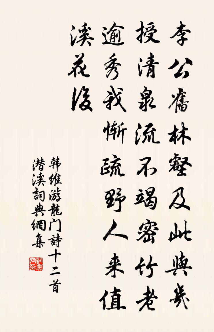 詩詞名句歷史字典書法欣賞書法字典國語詞典說文解字康熙字典古漢語字典標 題 作 者 詩 句 游龍門詩十二首潛溪作者:韓維 朝代:宋代游龍門詩十二首潛溪原文李公舊林壑,及此與幾授。清泉流不竭,密竹老逾秀。我慚疏野人,來值溪花後。詩詞問答問:游龍門詩十二首潛溪的作者是誰?答:韓維問:游龍門詩十二首潛溪寫於哪個朝代?答:宋代韓維游龍門詩十二首潛溪書法欣賞游龍門詩十二首潛溪書法作品詩詞推薦冬夜舉公房送崔秀才歸南陽楊衡〔唐代〕聞君動征棹,犯夜故來尋。強置一尊酒,重款百年心。燈白霜氣冷,室虛松韻深。南陽三顧地,幸偶價千金。水調歌頭·徐州中秋蘇轍〔宋代〕離別一何久,七度過中秋。去年東武今夕,明月不勝愁。豈意彭城山下,同泛清河古汴,船上載涼州。鼓吹助清賞大酺樂韓偓〔唐代〕晚日催弦管,春風入綺羅。杏花如有意,偏落舞衫多。小飲袁說友〔宋代〕殘蟬古路無人跡,瑟瑟西風已三日。杜門卻掃處一室,顛倒筆硯理書帙。平生但恐辜吟筆,薄宦雲浮奚固必。客來挽陳夫人卓氏二首黃公度〔宋代〕貴不改舊習,老猶遵幼儀。安貧偕隱者,急義勝男兒。餘澗河九里,寧馨桂一枝。秋毫有遺恨,石窌剖封遲。織圖二十四首經樓璹〔宋代〕素絲頭緒多,羨君好安排。青鞋不動塵,緩步交去來。眽眽意欲亂,眷眷首重回。王言正如絲,亦付經綸才。附米黻所作輓詩五首蘇軾〔宋代〕平生出處不同塵,末路相知太息頻。力疾來辭如永訣,古書跋讚許猶新。荊州既失三遺老,碧落新添幾侍宸。若誦得道陽王哲〔元代〕得道陽來得道陽。自然碧洞雲房。玉訣雲符清氣爽,金丹大藥勝衣裝。豈似人間輕薄郎。徒夸黃白滿箱筐。我寶三次韻子由書王晉卿畫山水一首,而晉卿和二首蘇軾〔宋代〕此境眼前聊妄想,幾人林下是真休。我今心似一潭月,君已身如萬斛舟。看畫題詩雙鶴鬢,歸田送老一羊裘。明年牡丹羅隱〔唐代〕艷多煙重欲開難,紅蕊當心一抹檀。公子醉歸燈下見,美人朝插鏡中看。當庭始覺春風貴,帶雨方知國色寒。日晚懷三山友人陳起〔宋代〕春前深惜別,病後政無詩。青又生菱角,紅應熟荔枝。魚甘賓席暖,風逆客帆遲。徒結連宵夢,郵音負所期。旅宿淮陽亭口號(一作宋之問詩)張九齡〔唐代〕日暮荒亭上,悠悠旅思多。故鄉臨桂水,今夜渺星河。暗草霜華發,空亭雁影過。興來誰與晤,勞者自為歌。山歌佚名〔明代〕不寫新詞不寫詩,一方素帕寄心知。心知接了顛倒看,橫也絲來豎也絲。這般心事有誰知!送金漢臣明府徐蜚英贊府還婺源方回〔宋代〕星源長貳兩賢者,丰采精神玉不如。詩外更工長短句,腹中何限古今書。平生事可心無愧,我輩人常氣有餘。記取古斷腸曲三十首周端臣〔宋代〕錦屏殘睡思忡忡,心緒無聊酒易中。柳院蘚廳慵不到,斑鳩啼暖落花風。已亥雜詩 80龔自珍〔清代〕夜思師友淚滂沱,光影猶存急網羅。言行較詳官閥略,報恩如此疚心多。提乾漁溪俞桂〔宋代〕不涉驚濤心自穩,柳陰陰處著孤舟。的知世路多機穽,一線閒名付直鉤。梅花十絕方岳〔宋代〕自有詩來幾許詩,玉堂吹徹又茅茨。阿誰不愛梅花句,未省梅花愛阿誰。摸魚兒吳潛〔宋代〕滿園林、瘦紅肥綠,休休春事無幾。杜鵑喚起三更夢,窗外露澄風細。渾不寐。但目看、一簾夜月移花未。推衾自次宋省齋問月楊公遠〔宋代〕開樽酹酒問嬋娟,來照人間是幾年。從古到今今復古,才圓又缺缺還圓。隔千里共何同異,描萬象真無醜妍。最是名句推薦雲鬢花顏金步搖,芙蓉帳暖度春宵。白居易《長恨歌》 牛羊自歸村巷,童稚不識衣冠。王維《田園樂七首·其四》 一身報國有萬死,雙鬢向人無再青。陸游《夜泊水村》 所志在功名,離別何足嘆。陸龜蒙《別離》 高情已逐曉雲空。不與梨花同夢。蘇軾《西江月·梅花》 眺聽良多感,徙倚獨沾襟。李密《淮陽感秋》 風雨如晦,雞鳴不已。佚名《風雨》 爐火照天地,紅星亂紫煙。李白《秋浦歌十七首》 一觴雖獨盡,杯盡壺自傾。陶淵明《飲酒·其四》 想牧之、千載尚神遊,空山冷。吳潛《滿江紅·齊山繡春台》