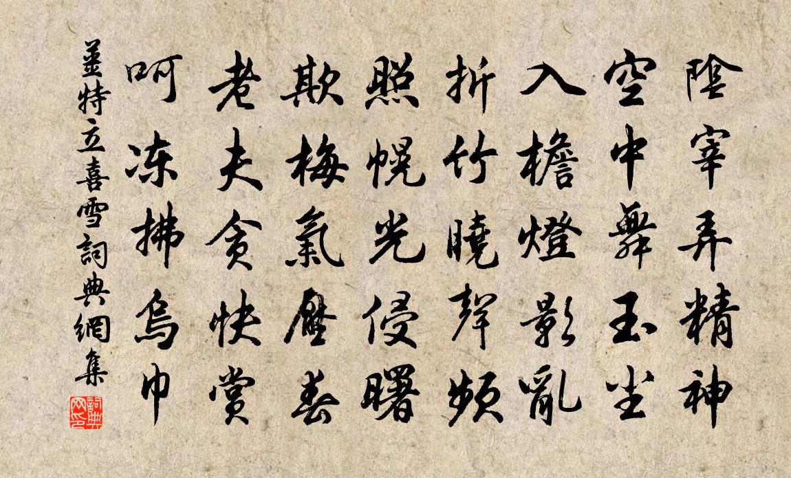 詩詞名句歷史字典書法欣賞書法字典國語詞典說文解字康熙字典古漢語字典標 題 作 者 詩 句 喜雪作者:姜特立 朝代:宋代喜雪原文陰宰弄精神,空中舞玉塵。入檐燈影亂,折竹曉聲頻。照幌光侵曙,欺梅氣壓春。老夫貪快賞,呵凍拂烏巾。詩詞問答問:喜雪的作者是誰?答:姜特立問:喜雪寫於哪個朝代?答:宋代姜特立喜雪書法欣賞喜雪書法作品詩詞推薦題白龍洞三首趙蕃〔宋代〕瘦竹依奇石,流清照古梅。那知道傍舍,遽絕眼中埃。肯憚巾沖雨,深防屐破苔。病來無腳力,一為上崔嵬。酬劉侍郎使君(劉太真)韋應物〔唐代〕瓊樹凌霜雪,蔥茜如芳春。英賢雖出守,本自玉階人。宿昔陪郎署,出入仰清塵。孰雲俱列郡,比德豈為鄰。風雨信國太夫人慕容氏輓詞二首周必大〔宋代〕門地榮聽履,夫家世夢松。初終無一欠,富貴有三從。疾愈龍宮藥,恩加象服封。乘鸞期忽至,談笑返仙峰。玉泉祈雨張伯玉〔宋代〕南州富潨射,萬壑縱奔瀨。茲泉一何高,敻與寥廓對。邈非猿鳥到,迅恐岩{左石右敖}碎。霜落天地清,玉立江游景仁東園蘇轍〔宋代〕新春甫驚蟄,草木猶未知。高人靜無事,頗怪春來遲。肩輿出東郊,輕裘試朝曦。百草招生意,喬松解寒姿,尺書二呂劉克莊〔宋代〕韓呂真喬木,蟠根與國同。伯泰太史氏,子約大愚公。許介之以丞相周益公所書古樂府四篇見寄敬題樂雷發〔宋代〕紙上珊瑚間木難,曾敲黃閣卸吟鞍。賞音今有平園否,得句堪尋岣嶁刊。鸚鵡夜棲金屋冷,的盧秋戰玉關寒。春風病目作近體詩五首晁說之〔宋代〕江頭未省逢春事,風雨朝朝夜夜深。皎潔一生余白髮,辛勤百計只丹心。不疑鄭默世能怨,敢恨虞翻論所侵。明日偈釋善昭〔宋代〕胡僧金錫光,為法到汾陽。六人成大器,勸請為敷揚。漁家傲洪皓〔宋代〕圃蕙庭桐雕大半。西風不借行人便。不用留題明月觀。西園宴。顏酡浪說觴無算。萬斛羈愁推不遠。千杯魯酒何曾和盧贊府游紀國道場慧淨〔唐代〕日光通漢室,星彩晦周朝。法城從此構,香閣本岧嶢。株盤仰承露,剎鳳俯摩霄。落照侵虛牖,長虹拖跨橋。高才宿疏山釋紹嵩〔宋代〕竹輿穿雨上疏山,寒涕重頤獨掩關。病客欲眠渾不寐,白猿啼在白雲間。留行都陳造〔宋代〕久飫南來飯,長維北去船。薰衣子笑韻,入箸望潮鮮。意適忘漂泛,吾生計食眠。歸期何用數,寬待藕花天。甲子歲暮陸游〔宋代〕世間巧拙亦何施?萬事難禁歲月移。遲死幾時天有意,要令自悟不須師。秋日程顥〔宋代〕閒來無事不從容,睡覺東窗日已紅。萬物靜觀皆自得,四時佳興與人同。道通天地有形外,思入風雲變態中。富貴鄴公菴歌釋雲知〔宋代〕呼猿澗西藏石筍,丹桂蒼松達鷲嶺。幾年陳跡絕纖埃,一旦佳名出清景。山家時喜來五馬,相攜款曲空岩下。遂許聞公擇過雲龍張山人輒往從之公擇有詩戲用其蘇軾〔宋代〕我生固多憂,肉食常苦墨。軒然就一笑,猶得好飲力。聞君過雲龍,對酒兩靜默。急攜清歌女,山郭及未昃。一歡游虎丘趙彥橚〔宋代〕文書窮日幾時休,得得尋幽到虎丘。望處平蕪迷遠近,林端飛鳥去夷猶。吳王事古遺人恨,西子名存逝水流。從昔八聲甘州(和劉倉賀蜀捷)李曾伯〔宋代〕自六朝、用武詫荊州,襟喉重疆陲。更西風似箭,峽江如線,事勢夔夔。須仗中流砥柱,天付治平誰。甚矣吾衰矣端午文天祥〔宋代〕五月五日午,薰風自南至。試為問大鈞,舉杯三酹地。田文當日生,屈原當日死。生為薛城君,死作汨羅鬼。高堂名句推薦眉睫才交,夢裡便不能張主;眼光落地,泉下又安得分明。陳繼儒《小窗幽記·集醒篇》 前年伐月支,城上沒全師。張籍《沒蕃故人》 昨夜吳中雪,子猷佳興發。李白《答王十二寒夜獨酌有懷》 虎踞龍蟠何處是,只有興亡滿目。辛棄疾《念奴嬌·登建康賞心亭呈史致道留守》 野田春水碧於鏡,人影渡傍鷗不驚。汪藻《春日·一春略無十日晴》 今人不見古時月,今月曾經照古人。李白《把酒問月·故人賈淳令予問之》 不愁屋漏床床濕,且喜溪流岸岸深曾幾《蘇秀道中》 女曰雞鳴,士曰昧旦。佚名《女曰雞鳴》 白酒新熟山中歸,黃雞啄黍秋正肥。李白《南陵別兒童入京》 臨難不顧生,身死魂飛揚阮籍《詠懷其五十三》