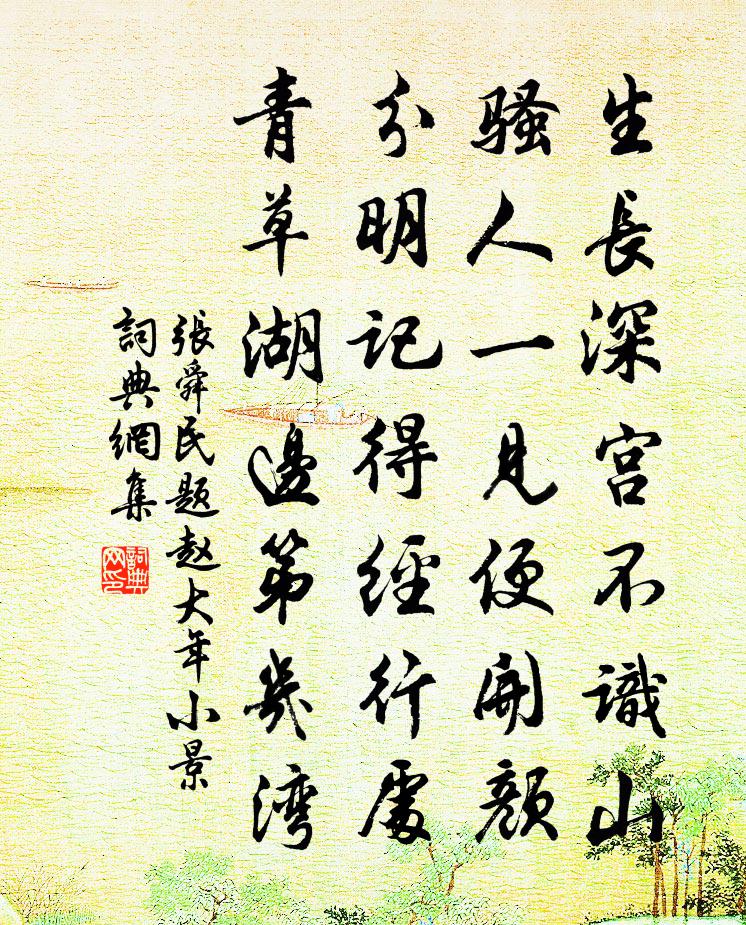 詩詞名句歷史字典書法欣賞書法字典國語詞典說文解字康熙字典古漢語字典標 題 作 者 詩 句 題趙大年小景作者:張舜民 朝代:宋代題趙大年小景原文生長深宮不識山,騷人一見便開顏。分明記得經行處,青草湖邊第幾灣。詩詞問答問:題趙大年小景的作者是誰?答:張舜民問:題趙大年小景寫於哪個朝代?答:宋代張舜民題趙大年小景書法欣賞題趙大年小景書法作品詩詞推薦宿台州城外林景熙〔宋代〕荒驛丹丘路,秋高酒易醒。霜增孤月白,江截亂峰青。旅雁如曾識,哀猿不可聽。到家追此夕,三十五郵亭。赴資陽經嶓冢山(漢水所出,元和三年已授此官)羊士諤〔唐代〕寧辭舊路駕朱轓,重使疲人感漢恩。今日鳴騶到嶓峽,還勝博望至河源。對竹圖唐寅〔明代〕簞瓢不厭久沉倫,投著虛懷好主人。榻上氍毹黃葉滿,清風日日坐陽春。此君少與契忘形,何獨相延厭客星。苔滿明福觀王傅〔宋代〕泉源山下延平曠,路入松關起清爽。飛雲西峙積翠台,突兀三千六百丈。杏花片片鋪金壇,天風吹桂香漫山。遊人元友山新山新居仇遠〔宋代〕幽居穩占南山下,人跡稀疏水竹村。轉巷始知猶有路,傍湖更好別開門。酒尊盡日嘗謀婦,詩課閒時略抱孫。孤鶴挽向倅王洋〔宋代〕襟量塵埃外,功名慷慨中。人懷不滿望,身有未全功。逸氣猶驚眼,馳光息轉蓬。蕭條古原上,松柏自號風。叔父給事輓詞十首黃庭堅〔宋代〕隴上千山漢節回,掃除民蜮不為災。蜀茶總入諸蕃市,胡馬常從萬里來。緣識宋太宗〔宋代〕任從寒暑鎮常侵,一氣韜藏萬種心。堪笑愚痴澆盪甚,卻非淳樸不幽深。四喜邵雍〔宋代〕一喜長年為壽域,二喜豐年為樂國。三喜清閒為福德,四喜安康為福力。軍中寄內陳子全〔宋代〕一望瀟湘遍露迷,胡笳吹月夜淒淒。回天無力心難死,矢日同仇志應齊。但使首陽存漢地,不教陰塞牧羌羝。聲名春日行次錢塘卻寄台州姚中丞杜荀鶴〔唐代〕豈為無心求上第,難安帝里為家貧。江南江北閒為客,潮去潮來老卻人。兩岸雨收鶯語柳,一樓風滿角吹春。花前沁園春 嘲昆季析居凌雲翰〔元代〕樹上凌霄,堂前紫荊,秋來尚芳。柰牝雞晨語,**憔悴,妖狐晝嘯,鴻雁分張。仁智匪周,喜憂非舜,一旦天倫求筇杖朱長文〔唐代〕霜筠來自蜀山遙,天骨輕清素節高。我若得之如佩玉,君應輟此似秋毫。次韻斯遠二十六日三絕趙蕃〔宋代〕春風去我孰能留,寒疾聞君頓已瘳。示以斜斜並整整,故知莫莫復休休。與和甫時甫分題畫卷夔得剡溪圖姜夔〔宋代〕枯槎啅乾鵲,交臂失夫君。柰此一尊酒,憑高空水雲。奉和翁文堯戲寄黃滔〔唐代〕掘蘭宮裡數名郎,好是乘軺出帝鄉。兩度還家還未有,別論光彩向冠裳。茉莉花二首陶弼〔宋代〕海客園林珠樹木,水仙賓從玉簪裳。錦桃每用紅絲樓,蜂采須成白蜜房。玉女搖仙佩 秋情張玉娘〔元代〕霜天破夜,一陣寒風,亂淅入簾穿戶。醉覺珊瑚,夢回湘浦,隔水曉鐘聲度。不作高唐賦。笑巫山神女,行雲朝暮春日書事五首韓元吉〔宋代〕憶上金華第一峰,相君官重酒樽同。夢尋絕壑誰重到,零落山桃小院風。漁家傲歐陽修〔宋代〕妾解清歌並巧笑。郎多才俊兼年少。何事拋兒行遠道。無音耗。江頭又綠王孫草。昔日採花呈窈窕。玉容長笑花枝名句推薦獨抱影兒眠,背看燈花落。汪懋麟《誤佳期·閨怨》 繡面芙蓉一笑開,斜飛寶鴨襯香腮。李清照《浣溪沙·閨情》 知之者不如好之者,好之者不如樂之者。孔子弟子《論語·雍也篇》 正己而不求於人則無怨。上不怨天,下不尤人。子思《中庸·第十四章》 君馬黃,我馬白。李白《君馬黃》 生當復來歸,死當長相思。蘇武《留別妻》 少年易老學難成,一寸光陰不可輕。朱熹《偶成》 酒困路長惟欲睡,日高人渴漫思茶。蘇軾《浣溪沙·簌簌衣巾落棗花》 雨過月華生,冷徹鴛鴦浦。柳永《甘草子·秋暮》 春宵苦短日高起,從此君王不早朝。白居易《長恨歌》