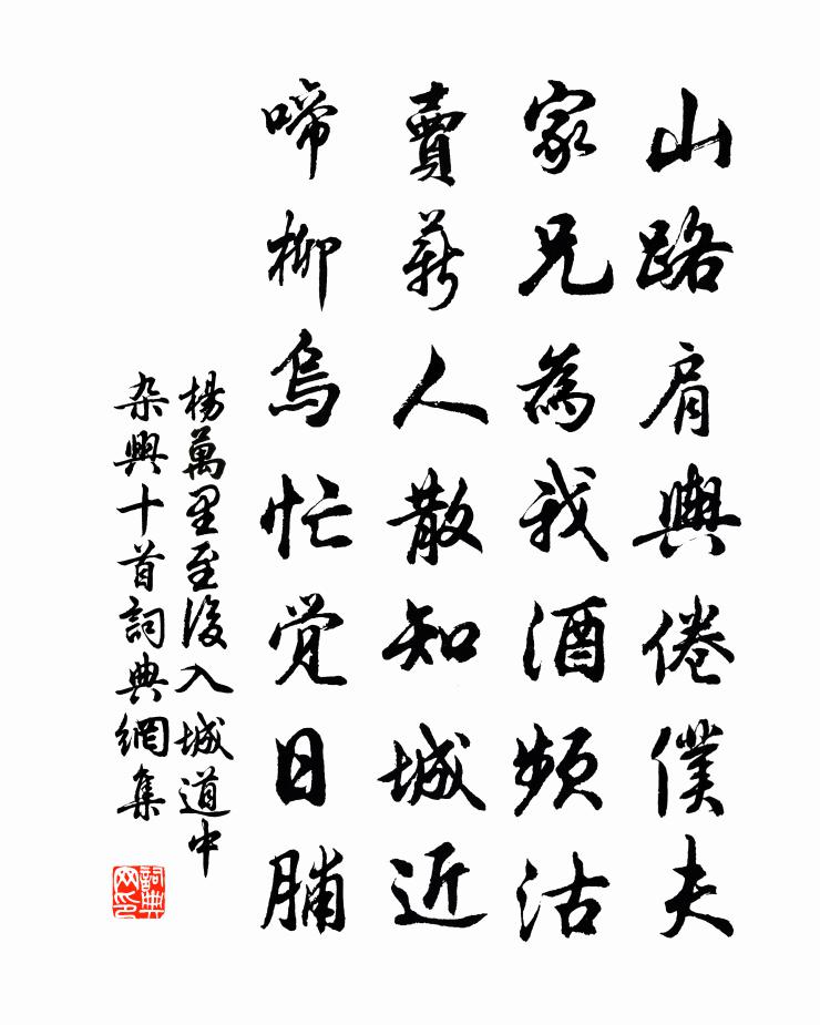 詩詞名句歷史字典書法欣賞書法字典國語詞典說文解字康熙字典古漢語字典標 題 作 者 詩 句 至後入城道中雜興十首作者:楊萬里 朝代:宋代至後入城道中雜興十首原文山路肩輿倦僕夫,家兄為我酒頻沽。賣薪人散知城近,啼柳烏忙覺日脯。詩詞問答問:至後入城道中雜興十首的作者是誰?答:楊萬里問:至後入城道中雜興十首寫於哪個朝代?答:宋代問:楊萬里的名句有哪些?答:楊萬里名句大全楊萬里至後入城道中雜興十首書法欣賞至後入城道中雜興十首書法作品詩詞推薦贈別表兄韋卿權德輿〔唐代〕新讀兵書事護羌,腰間寶劍映金章。少年百戰應輕別,莫笑儒生淚數行。送李侍郎西京留台司馬光〔宋代〕先公勛烈盛監梅,清白仍聞世濟才。華省拂衣辭簿領,長衢回首謝塵埃。嵩峰排霧依稀出,洛水迎入迤邐來。寄語道中見問津者宋祁〔宋代〕欲問迷津意,都緣別徑多。亡羊曾自此,老馬欲如何。旁午晨車邁,間關夕蓋過。不須貪遠客,危恨寄風波。挽雍宣教知義廖行之〔宋代〕憶昔居黌舍,曾陪戱彩斑。才華推粹美,功績嘆間關。有子能傳業,無丹可駐顏。哀詞臨隧路,明晦萬重山。再用前韻袁甫〔宋代〕小時所學老何如,自詫西河不記洙。曾子斯言譏背本,祗今猶足警吾徒。春日(一作初春)王績〔唐代〕前旦出園游,林華都未有。今朝下堂來,池冰開已久。雪被南軒梅,風催北庭柳。遙呼灶前妾,卻報機中婦。年光至陳留陳與義〔宋代〕煙際亭亭塔,招人可得回。等閒為夢了,聞健出關來。日落河冰壯,天長鴻雁哀。平生遠遊意,隨處一徘徊。與興福老枯崖乘月觀濤蒲壽宬〔宋代〕無心攜起碧筇條,偶爾來從漁父招。山色多情似吳越,濤聲牽夢到金焦。魚龍一任風雲便,鷗鷺不知天海遙。共倚上巳日賜裴度李昂〔唐代〕注想待元老,識君恨不早。我家柱石衰,憂來學丘禱。賦得春風扇微和邵偃〔唐代〕微風扇和氣,韶景共芳晨。始見郊原綠,旋過御苑春。三條開廣陌,八水泛通津。煙動花間葉,香流馬上人。逶迤興一釋崇岳〔宋代〕只這一脈,人間顯赫。妙轉綿綿,甚生標格。信美寺岑上人(一作司空圖詩)鄭谷〔唐代〕巡禮諸方遍,湘南頗有緣。焚香老山寺,乞食向江船。紗碧籠名畫,燈寒照淨禪。我來能永日,蓮漏滴階前。淥羅晴晝古汴高士〔宋代〕第一岩前景若何,江流瀲灩漾晴羅。遊仙道士無縈擊,也共白雲棲一窩。禪人並化主寫真求贊釋正覺〔宋代〕眉目岩岩,身心靜恬。萬機自息,一默誰參。虛空兮霽雲卷谷,清白兮夜月濯潭。春入叢林兮謾道化工百億,神遊牽牛花三首楊萬里〔宋代〕曉思歡欣晚思愁,繞籬縈架太嬌柔。木犀未發芙蓉落,買斷西風恣意秋。杭州雜詩和林石田汪元量〔宋代〕天目絲絲雨,江頭翦翦風。鼓鞞千艇合,刁斗萬家同。金馬憐焦土,銅駝壓草叢。杞天愁欲墮,黑入太陰中。馬上見殘月宋祁〔宋代〕娟娟天外月,正見上朝人。老桂欹藏樹,織鉤側抱輪。氣清仍泛露,光淡即迎晨。尚作裴回意,西樓對結鄰。龍隱岩李師中〔宋代〕春波飽微綠,斗柄涵虛明。方舟貫岩腹,鵝鸛相酬鳴。仰窺穹窿頂,宛轉百怪呈。僅餘鱗甲碎,不見頭角獰。下闖十二時行孝文白居易〔唐代〕雞鳴醜,高樓大宅得安久。常勸父母發慈心,孝得題名終不朽。金山寺王安石〔宋代〕重經高處寺,一與白雲親。樹木有春意,江山如故人。幽軒含氣象,偏影落風塵。日暮臨歸去,徘徊欲損神。名句推薦百年歌自苦,未見有知音。杜甫《南征》 欲治身,先治心;欲責人,先責己。宋濂、王褘《元史·列傳·卷二》 莫嫌舉世無知己,未有庸人不忌才。查慎行《三閭祠》 問他有甚堪悲處?思量卻也有悲時,重陽節近多風雨。辛棄疾《踏莎行·庚戌中秋後二夕帶湖篆岡小酌》 談歡則字與笑並,論戚則聲共泣偕劉勰《文心雕龍·誇飾》 情往似贈,興來如答。劉勰《文心雕龍·物色》 一聲已動物皆靜,四座無言星欲稀。李頎《琴歌》 遊人不管春將老,來往亭前踏落花。歐陽修《豐樂亭遊春·其三》 多君相門女,學道愛神仙李白《送內尋廬山女道士李騰空二首》 粽包分兩髻,艾束著危冠。陸游《乙卯重五詩》