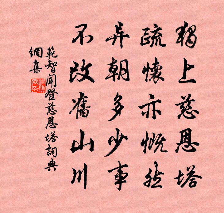 詩詞名句歷史字典書法欣賞書法字典國語詞典說文解字康熙字典古漢語字典標 題 作 者 詩 句 登慈恩塔作者:范智聞 朝代:宋代登慈恩塔原文獨上慈恩塔,疏懷亦慨然。異朝多少事,不改舊山川。詩詞問答問:登慈恩塔的作者是誰?答:范智聞問:登慈恩塔寫於哪個朝代?答:宋代范智聞登慈恩塔書法欣賞登慈恩塔書法作品詩詞推薦二十一日柘龍橋道中項安世〔宋代〕早禾登架晚禾青,雨後官塘處處平。山馬未胡行木彴,水牛亭午臥深坑。人家總在林間住,生計惟憑隴上耕。青嶂瀑上見梅有懷老溪上人蒲壽宬〔宋代〕野水橫斜最老枝,一生心事雪霜知。世人重眼不重鼻,只愛花光與補之。春圃六言三首劉子翬〔宋代〕小凍猶殘柳雪,新□□□□□。□□□□□□,□酒時須一中。池州夫子廟麟台韋表微〔唐代〕二儀既閉,三象乃乖。聖道埋郁,人心不開。上無文武,下有定哀。吁嗟麟兮,孰為來哉。周雖不綱,孔實嗣聖。縱筆陸游〔宋代〕冉冉殘年迫耄期,肱雖三折未成醫。北山愚公世方笑,東郭順子吾所師。萬里元非破賊手,一生無奈造物兒。梅雨次韻嚴子文旅中見贈范成大〔宋代〕杯中疇昔共江天,傾座新詩報警聯。海浦寸心空共月,京華雙鬢各凋年。交情敢說同方友,句法甘從弟子員。有意偶成李流謙〔宋代〕早年種竹作漁竿,笠澤煙波夢未闌。已向塵根消縛脫,猶將文字校甘酸。風松自有閒宮徵,溪鷺初無俗肺肝。最愛題畫仇遠〔宋代〕天上高飛地上行,終難萬里附鵬程。鷺鷥股肉無人割,老守菰蒲過一生。同永叔子聰游嵩山賦十二題其五玉女窗梅堯臣〔宋代〕玉洞倚霞壁,天窗露微明。驂鸞去不返,啼鳥空相驚。萬木自虧蔽,捫蘿復誰情。楊柳枝葛長庚〔宋代〕挼碎梅花一斷腸。送斜陽。風煙縹渺月微茫。又昏黃。平野寒蕪何處斷,接天長。短籬淺水橘青黃。度清香。要做葬西施輓歌王炎〔宋代〕西望吳王國,雲書鳳字牌。連江起珠帳,擇地葬金釵。滿地紅心草,三層碧玉階。春風無處所,淒恨不勝懷。和姜總管喜民間種麥虞儔〔宋代〕腰鐮刈晚禾,荷鋤種新麥。田家競作苦,羔豚勞歲夕。翠浪愜初懷,黃雲期後穫。晴暖得天時,肥瘠隨地力。賸欲送沈左司從汪參政分省高啟〔明代〕重臣分陝去台端,賓從威儀盡漢官。四塞河山歸版籍,百年父老見衣冠。函關月落聽雞度,華岳雲開立馬看。知爾張家渡買魚徐僑〔宋代〕北堂老人性嗜魚,有魚一飯空無餘。行水登舟喜動色,幾月乃得三四食。溪涸舟膠挽不去,舍舟行行溪上路。路入題齋壁陸游〔宋代〕平生喜蕭散,垂老厭奔走。三年鏡湖上,樂事未曾有。晨開一卷書,暮把一卮酒。病除覺身輕,赤腳自蹋藕。乃知掛金索佚名〔宋代〕二更里,人靜萬事都無染。一對金蟾,上下來盤旋。嚇退三屍,奔走如雷電。白雪漫漫,降下瓊花片。田家屋上壺梅堯臣〔宋代〕修蔓屋頭綴,大壺檐外重。霜乾葉猶苦,風斷根未移。收掛煙突近,開充酒具遲。賤生無所用,會有千金時。挽王華甫提刑二首劉克莊〔宋代〕丱角從諸老, * 客五侯。風雲疑反手,江海不回頭。寂寂生堪笑,皇皇死未酬。空餘老知識,閉戶著窮愁。舟中書事張耒〔宋代〕久客益知行路難,鏡中雙鬢不須看。山川積雪堅冰地,舟楫長淮古汳間。饋費主人勤俗禮,書來故里勸加餐。北歸六十吟五首方回〔宋代〕晝暑微遒暮已涼,中秋近□更重陽。少時痛飲不勝樂,老病積憂無此狂。歲六十翁扶藥餌,家三百指望裘裳。空庭名句推薦君子莫大乎與人為善。孟子《孟子·公孫丑章句上·第八節》 池邊釣女日相隨,妝成照影竟來窺孟浩然《高陽池送朱二》 欲訴奇愁無可訴,算興亡、已慣司空見。梁啓超《金縷曲·丁未五月歸國旋復東渡卻寄滬上諸君子》 至誠而不動者,未之有也;不誠,未有能動者也。孟子《孟子·離婁章句上·第十二節》 酒賤常愁客少,月明多被雲妨。蘇軾《西江月·世事一場大夢》 女曰雞鳴,士曰昧旦。佚名《女曰雞鳴》 無那塵緣容易絕,燕子依然,軟踏簾鉤說。納蘭性德《蝶戀花·辛苦最憐天上月》 北極懷明主,南溟作逐臣。宋之問《途中寒食題黃梅臨江驛寄崔融》 雖然不如延年妹,亦是當時絕世人。李白《中山孺子妾歌》 今日樓台鼎鼐,明年帶礪山河辛棄疾《西江月·堂上謀臣尊俎》