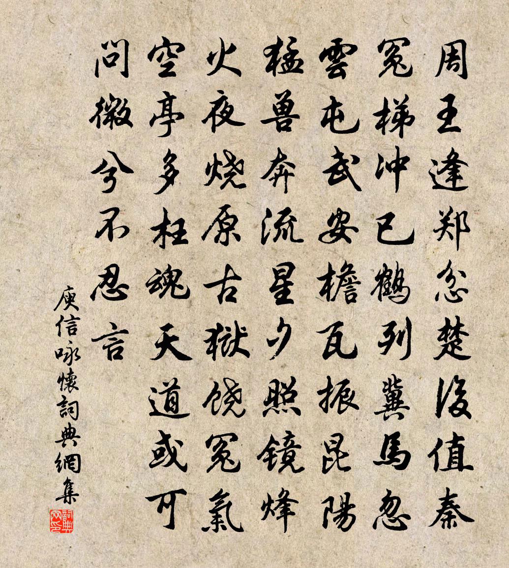 詩詞名句歷史字典書法欣賞書法字典國語詞典說文解字康熙字典古漢語字典標 題 作 者 詩 句 詠懷作者:庾信 朝代:南北朝詠懷原文周王逢鄭忿,楚後值秦冤。梯衝已鶴列,冀馬忽雲屯。武安檐瓦振,昆陽猛獸奔。流星夕照鏡,烽火夜燒原。古獄饒冤氣,空亭多枉魂。天道或可問,微兮不忍言。詩詞問答問:詠懷的作者是誰?答:庾信問:詠懷寫於哪個朝代?答:南北朝問:庾信的名句有哪些?答:庾信名句大全庾信詠懷書法欣賞詠懷書法作品詩詞推薦和陸郎中送出關姜特立〔宋代〕黃塵烏帽六年間,心跡何嘗一間閒。今日船頭忽東轉,始知有味是家山。送何清賈主簿歸任梅堯臣〔宋代〕不遠水雲間,悠悠泝鷁還。分亭接雞犬,舉酒對河山。殘雪依荒磧,寒煙入暝灣。借人鸞枳嘆,一併在離顏。宿許山人別業釋簡長〔宋代〕嵐霽景初分,溪橋對石門。犬聲知遠客,燒影見前村。古木秋生菌,空山夜答猿。幾因留我宿,靜話極詩源。春江閒步贈張山人白居易〔唐代〕江景又妍和,牽愁發浩歌。晴沙金屑色,春水麴塵波。紅簇交枝杏,青含卷葉荷。藉莎憐軟暖,憩樹愛婆娑。書信行月大師求頌釋正覺〔宋代〕霽明夜永月行空,破暗真光默默中。一點至靈虛且應,十方圓鑒照而沖。床頭爐篆浮寒紫,壁上龕燈對冷紅。個裡偈頌三十首釋印肅〔宋代〕失卻本來面目,個個日南長至。先祖時節苦臨,處處笙歌樂醉。也參禪,亦詳義,也貧窮,亦富貴。蒙頭塞耳有誰秋閨思二首張仲素〔唐代〕碧窗斜月藹深暉,愁聽寒螿淚濕衣。夢裡分明見關塞,不知何路向金微。秋天一夜靜無雲,斷續鴻聲到曉聞。欲寄鵲踏枝·過人家廢園作龔自珍〔清代〕漠漠春蕪春不住,藤刺牽衣,礙卻人行道。偏是無情偏解舞,蒙蒙撲面皆飛絮。繡院深沉誰是主?一朵孤花,牆角臨江仙晁補之〔宋代〕自古齊山重九勝,登臨夢想依依。偶來恰值菊花時。難逢開口笑,須插滿頭歸。昨夜一江風色好,平明秋浦帆飛。兵火後野望艾可翁〔宋代〕江村兵火復,月色似長淮。鼓角連秋思,風塵帶客懷。諸公朝漠北,一老哭天涯。猶幸舂陵夜,蔥蔥氣尚佳。上喻史君重建霞起堂六首陳夢建〔宋代〕丈人昔日經行處,草暗苔荒四十春。誰倚高寒訪陳跡,璇題寶墨一時新。懷伯謨趙蕃〔宋代〕為憶窗間句,思從物外人。白雲空在望,青眼為誰新。一別已數載,再來還幾晨。期君歸對策,過我莫嫌貧。西閣口號(呈元二十一)杜甫〔唐代〕山木抱雲稠,寒江繞上頭。雪崖才變石,風幔不依樓。社稷堪流涕,安危在運籌。看君話王室,感動幾銷憂。八月三日即事白玉蟾〔宋代〕煙冷渾沾水,溪清可數魚。鴉翻千點墨,雁草數行書。今日征帆下,前年上國初。詩盟寒復講,無酒興何如。次韻明仲游棲雲閣劉子翬〔宋代〕溪山步步開圖障,山影更隨溪蕩漾。迴環兩縣煙雨奇,一目盡奄長橋上。乾楓枯柳澹不春,歡伯為解愁城屯。書空竹竿佚名〔先秦〕籊籊竹竿,以釣於淇。豈不爾思?遠莫致之。泉源在左,淇水在右。女子有行,遠兄弟父母。淇水在右,泉源在左湖上閒居(一作閒居湖上)竇參〔唐代〕避影將息陰,自然知音稀。向來深林中,偶亦有所窺。飛鳥口銜食,引雛上高枝。高枝但各有,安知宜不宜。止止題鄭防畫夾五首黃庭堅〔宋代〕子母猿號槲葉,山南山北危機。世故誰能樗里,彀中皆是由基。次韻范氏子園居即事三首蘇籀〔宋代〕媚蘭多畦畹,黨竹論尺尋。倦矣一枝足,卓哉千里心。氣含湖海姿,名掛羆虎林。長髯罥世累,禿鬢微霜侵。雕鑽雜詩四首張說〔唐代〕抱薰心常焦,舉旆心常搖。天長地自久,歡樂能幾朝。君看西陵樹,歌舞為誰嬌。山閒苦積雨,木落悲時遽。賞心名句推薦臨水一長嘯,忽思十年初。白居易《垂釣》 勝敗兵家事不期,包羞忍恥是男兒。杜牧《題烏江亭》 秋草六朝寒,花雨空壇。更無人處一憑闌。朱彝尊《賣花聲·雨花台》 夫因兵死守蓬茅,麻薴衣衫鬢髮焦。杜荀鶴《山中寡婦 / 時世行》 已忍伶俜十年事,強移棲息一枝安。杜甫《宿府》 琵琶金翠羽,弦上黃鶯語。韋莊《菩薩蠻》 自我來黃州,已過三寒食。蘇軾《寒食雨二首》 天行有常,不為堯存,不為桀亡。荀子《荀子·天論》 四百年來成一夢,堪愁。王安石《南鄉子·自古帝王州》 志於道,據於德,依於仁,游於藝。孔子弟子《論語·述而篇》