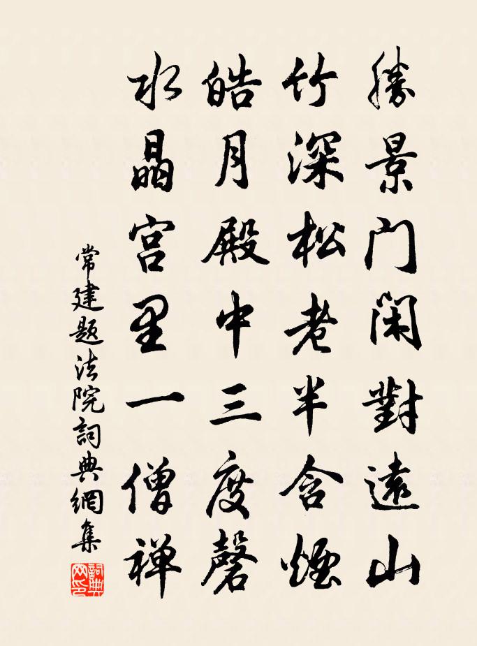 勝景門閒(開)對遠山,竹深松老半含煙。皓(皎,素)月殿中三度磬,水晶宮裡一僧禪。