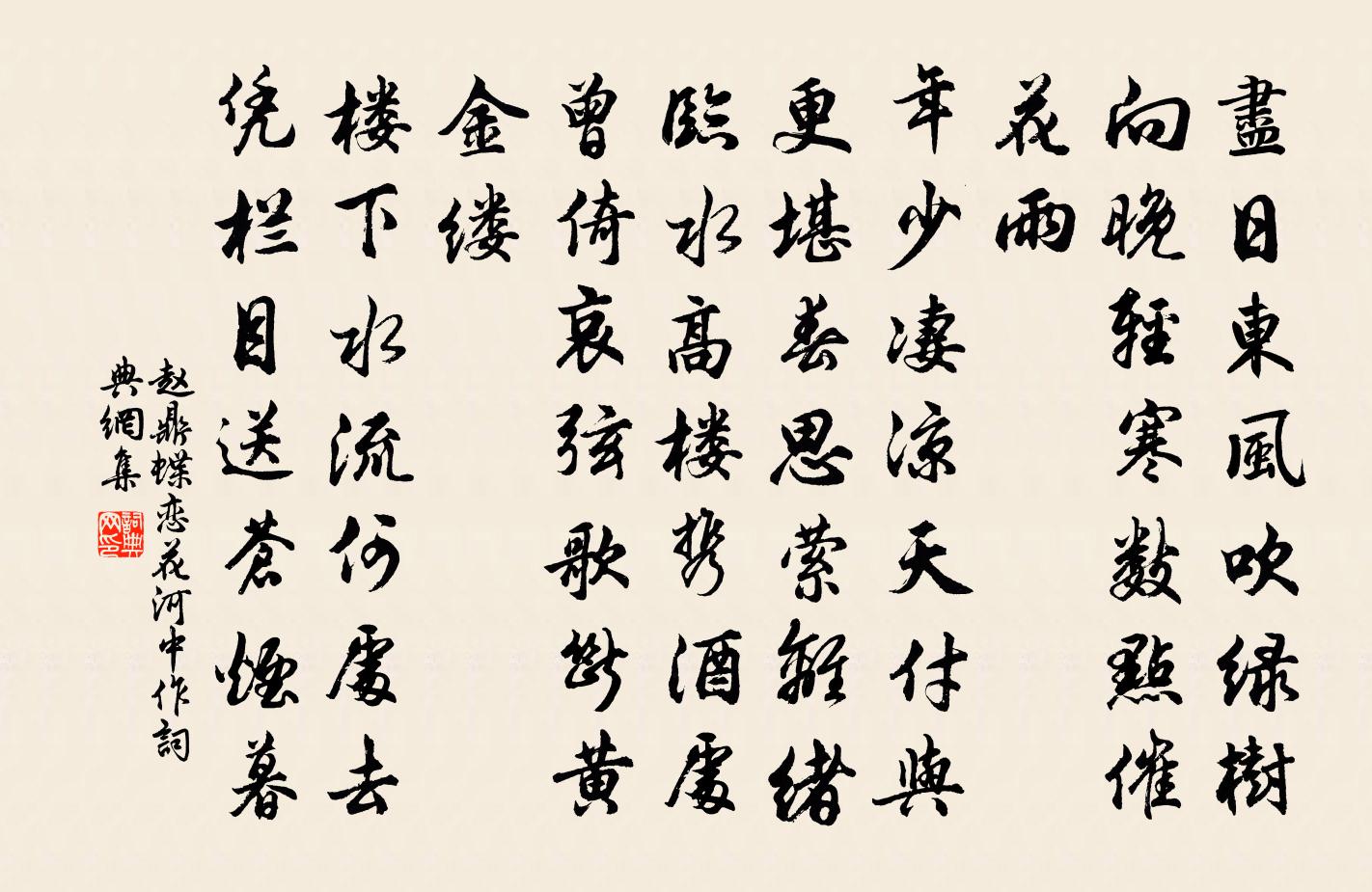 這是一首故地重遊的懷人詞,懷念往昔一位曾於臨水高樓一曲賦別的女子。上片記時,下片記地,風物依然,而她已不在,通篇貫串著傷離念遠之情。開頭三句點明時令,又以春盡花落、孤獨寂寞的時空環境暗寓“重來崔護”之感 。“催花雨”在宋詞中有用於春初催花開的,如晏幾道《泛清波摘遍》:“催花雨小,著柳風柔,都似去年時候好 。”易祓《喜遷鶯》:“一霎兒晴,一霎兒雨,正是催花時候 。”也有用於春末催花落的,如李清照《點絳唇》:“惜春春去,幾點催花雨。”趙鼎詞中“催花雨”意思則是後者。“年少淒涼”四字蘊含無限傷感 。“年少”本是青春和歡樂的時節,但詞人卻感到淒涼,完全是為“春思”和“離緒”所困,而主因則在於詞人多情。但把“年少淒涼 ”說成是“天付與 ”,則又有自我解嘲的味道,意思是情之所鍾,無可解脫。這“年少淒涼”的況味,不能不甘心忍受了 。“臨水高樓”三句,緊接上片的“離緒”而轉向懷人。這三句是追敘往事,在“臨水高樓”這昔游之地回憶當年送別時的情景 。“曾倚哀弦 ”,指以絲竹伴唱。詞在唐宋時是合樂歌唱的,有琵琶等弦樂伴奏 。“倚”就是以聲合曲。黃金縷用來形容初春鵝黃色的柳條,古人有折楊柳贈別的風俗“歌斷黃金縷”在這裡也有作為離別之曲的含意,與上句“哀弦”相應 。“樓下水流何處去”一句引用唐杜牧詩。杜牧《題安州浮雲寺寄湖州張郎中》詩 :“去夏疏雨余,同倚朱欄語。當時樓下水,今日到何處。恨如春草多,事與孤鴻去。楚岸柳何窮,別愁紛若絮。”