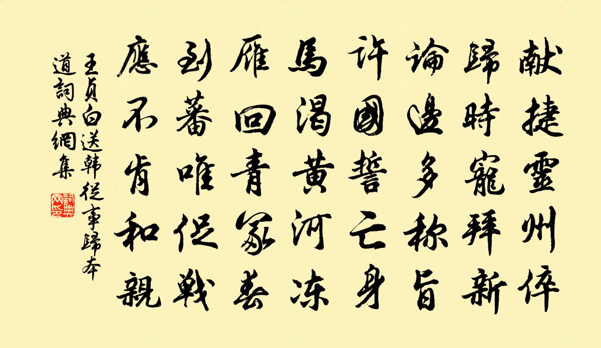詩詞名句歷史字典書法欣賞書法字典國語詞典說文解字康熙字典古漢語字典標 題 作 者 詩 句 送韓從事歸本道作者:王貞白 朝代:唐代送韓從事歸本道原文獻捷靈州倅,歸時寵拜新。論邊多稱旨,許國誓亡身。馬渴黃河凍,雁回青冢春。到蕃唯促戰,應不肯和親。詩詞問答問:送韓從事歸本道的作者是誰?答:王貞白問:送韓從事歸本道寫於哪個朝代?答:唐代問:送韓從事歸本道是什麼體裁?答:五律王貞白送韓從事歸本道書法欣賞送韓從事歸本道書法作品注釋全唐詩:卷701-37詩詞推薦水調歌頭劉過〔宋代〕弓劍出榆塞,銅槧上蓬山。得之渾不費力,失亦匹如閒。未必古人皆是,未必今人俱錯。世事沐猴冠。老子不分別南山有台詩經〔先秦〕南山有臺,北山有菜。樂只君子,邦家之基。樂只君子,萬壽無期。南山有桑,北山有楊。樂只君子,邦家之光。平原郡齋二首黃庭堅〔宋代〕生平浪學不知株,江北江南去荷鋤。窗風文字翻葉葉,猶似勸人勤讀書。登仕郎曾忠佐迎母王于樂氏母許新居成即歸於周必大〔宋代〕夏屋渠渠斲采椽,筍輿就養有成言。南陔久嘆薪吹棘,北戶空勞草樹萱。堂上只容瞻像設,寢中那復問寒暄。朝思山園文同〔宋代〕久雨無所適,新晴步山園。西風滿高林,敗葉驚已翻。時節急如此,世事安可論。夜歸燈下吟,寒蟲伴幽喧。少年游趙子發〔宋代〕曉山日薄半春陰。煙暖柳拖金。滿眼新晴,歌聲妝影,悠蕩碧雲心。閒庭客散人歸去,疏雨濕羅襟。樓閣濛濛,斷延福寺張守質〔宋代〕步入禪關一徑賒,攝衣登眺夕陽斜。金谿碧落千條練,紫塔光涵五色霞。月擊扁舟漁火渡,風清古碣隱君家。遊人和長安孫舍人見寄魏野〔宋代〕長安君到轉民安,夏少炎蒸臘少寒。接使管玄登月榭,勸農旌旆入煙巒。龍池似錦花堪賞,鶉野如雲稼好觀。見說關仝驟雨圖劉克莊〔宋代〕四山昏昏如潑墨,行人對面不相覿。淒乎太陰布肅殺,暗然混沌未開闢。千丈拿空蟄龍起,一聲破柱春雷疾。我疑發館陶王安石〔宋代〕促轡數殘更,似聞雞一鳴。春風馬上夢,沙路月中行。笳鼓遠多思,衣裘寒始輕。稍知田父穩,燈火閉柴荊。和劉太守十州詩菊花洲陳瓘〔宋代〕光景不留人易老,恨無羽翼出塵埃。世間那有飛升藥,且傍汀洲採菊來。橫橋觀薺陳著〔宋代〕物理元隨世事新,靜觀知是泮宮人。穿花野薺雖微草,也占年年一分春。真娘墓周弼〔宋代〕青鳥傳書渡海遲,亂山衰草葬蛾眉。錦囊消歇余香在,狼藉春風荳營蔻枝。天闕山楊修〔宋代〕牛頭天際碧凝嵐,王導無稽示妄談。若以遠山為上闕,長安應合指終南。達磨贊釋紹曇〔宋代〕一葦橫江,九年面壁。直指單傳,人信不及。面對梁王言不識,咦,泥團亂拋擲。唐明皇游月宮葛秋崖〔宋代〕秦漢求仙事已非,等間卻遇月中妃。如何不覓長生藥,只記霓裳一曲歸。銅石山胡銓〔宋代〕是處山皆石,他山盡不知。固非從地出,疑是補天余。下隨一拳小,高凌千仞虛。奇章應未見,名不下中書。奉酬於中丞使君郡齋臥病見示一首皎然〔唐代〕宿昔祖師教,了空無不可。枯槁未死身,理心寄行坐。仁公施春令,和風來澤我。生成一草木,大道無負荷。論入洛陽易士達〔宋代〕季龍方始是童時,視志觀聲已嘆奇。嘯倚上都門外者,如何夷甫卻先知。次韻琛庭即事胡仲弓〔宋代〕吏塵飛不到,官況盡淒涼。實貨歸周府,虛名屬晉堂。日移槐影轉,風細荔花香。若問公私事,閒蛙話最長。名句推薦碧水丹山映杖藜,夕陽猶在小橋西。沈周《題畫》 報答春光知有處,應須美酒送生涯。杜甫《江畔獨步尋花七絕句》 相識滿天下,知心能幾人?佚名《增廣賢文·上集》 樂易者常壽長,憂險者常夭折。荀子《荀子·榮辱》 無常亂之國,無不可理之民者。吳兢《貞觀政要·卷五· * 平》 山迴路轉不見君,雪上空留馬行處。岑參《白雪歌送武判官歸京》 口之宣言也,善敗於是乎興左丘明《國語·周語·邵公諫厲王弭謗》 百囀無人能解,因風飛過薔薇。黃庭堅《清平樂·春歸何處》 人生一世,草長一春。佚名《增廣賢文·上集》 紅豆不堪看,滿眼相思淚。牛希濟《生查子·新月曲如眉》