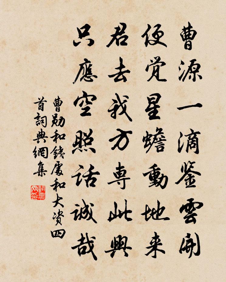 詩詞名句歷史字典書法欣賞書法字典國語詞典說文解字康熙字典古漢語字典標 題 作 者 詩 句 和錢處和大資四首作者:曹勛 朝代:宋代和錢處和大資四首原文曹源一滴鑒雲開,便覺星蟾動地來。君去我方專此興,只應空照話誠哉。詩詞問答問:和錢處和大資四首的作者是誰?答:曹勛問:和錢處和大資四首寫於哪個朝代?答:宋代曹勛和錢處和大資四首書法欣賞和錢處和大資四首書法作品詩詞推薦題雷峰塔南山小景毛滂〔宋代〕錢塘花門外西湖花西,萬松花深處古招花提。孤塔昂昂據要會,湖光灩灩明岩扉。道人安禪日卓午,寺外湖船沸簫野釣韓偓〔唐代〕細雨桃花水,輕鷗逆浪飛。風頭阻歸棹,坐睡倚蓑衣。淨社莊長老請贊釋可湘〔宋代〕似真非真,似假非假。遠遠描邈將來,雙眉移在眼下。誰其為之,西山淨社,切忌認驢而作馬。襄州試白雲歸帝鄉黃滔〔唐代〕杳杳復霏霏,應緣有所依。不言天路遠,終望帝鄉歸。高岳和霜過,遙關帶月飛。漸憐雙闕近,寧恨眾山違。陣觸呈蔣薛二友趙師秀〔宋代〕中夜清寒入緼袍,一杯山茗當香醪。鳥飛竹葉霜初下,人立梅花月正高。無欲自然心似水,有營何止事如毛。春來枯魚過河泣李白〔唐代〕白龍改常服,偶被豫且制。誰使爾為魚,徒勞訴天帝。作書報鯨鯢,勿恃風濤勢。濤落歸泥沙,翻遭螻蟻噬。萬乘清明胡仲參〔宋代〕杯酒濃澆壠上春,東風吹起紙灰塵。可堪腸斷中原路,草掩芒丘不見人。皇太后閣六首蘇軾〔宋代〕寶冊瓊瑤重,新庭松桂香。雪消春未動,碧瓦麗朝陽。傳言玉女(五月四日孫僉判四昆仲攜具稽古堂觀競渡,有作)郭應祥〔宋代〕稽古堂前,恰見四番端午又來江上,聽鳴鼉急鼓。棹歌才發,漠漠一川煙雨。輕舟搖揚,心掀舞。倦客今年續命,送湯伯紀歸番易劉克莊〔宋代〕華宗所產必人英,久見諸賢說父兄。荀氏晚添文若出,楊家又有敬之生。進堪負荷斯文責,退亦流傳後世名。身老句滕元發〔宋代〕寒日邊聲斷,春風塞草長。傳聞漢都護,歸奉萬年觴。嘲魯儒李白〔唐代〕魯叟談五經,白髮死章句。問以經濟策,茫如墜煙霧。足著遠遊履,首戴方山巾。緩步從直道,未行先起塵。秦家愛日齋孫華孫〔元代〕曹宗儒講學之室去日誠可惜,來日還可愛。耀靈如轉丸,今昨忽相代。粵從識日來,旦莫幾明晦。去來與來去,歲秋晚霽後野望憶夏侯審盧綸〔唐代〕天晴禾黍平,暢目亦傷情。野店雲日麗,孤莊砧杵鳴。川原唯寂寞,岐路自縱橫。前後無儔侶,此懷誰與呈。小詩謝霅川使君幫祠庭薄俸程公許〔宋代〕地行不必羨飛仙,驤首青雲恐疾顛。但得一廛耕谷口,底須萬騎戰祁連。齋房盡日清如水,吾道從來直似弦。賴有清夜秦觀〔宋代〕子夜天無雲,稀星耿頑碧。茫茫行役者,對此焉不息。胡為蝸角端,相與競尋尺。勸君歸去來,飛空鳥無跡。越王勾踐墓柴望〔宋代〕秦望山頭自夕陽,傷心誰復賦淒涼。今人不見亡吳事,故墓猶傳霸越鄉。雨打亂花迷復道,鳥翻黃葉下宮牆。登臨送丘宗卿博士出守嘉禾以視民如傷為韻呂祖謙〔宋代〕堂下萬休戚,堂上一笑嚬。是心苟不存,對面越與秦。豚魚尚可孚,況此能言民。君看津頭柳,葉葉皆相親。讀書陸游〔宋代〕歸志寧無五畝園,讀書本意在元元。燈前目力雖非昔,猶課蠅頭二萬言。葺居五首蘇轍〔宋代〕庭方止數尋,風月所從入。百年養毒樹,攢芒比刀戟。伐之念生久,不伐愁跣足。且復為人謀,庖椹利朝食。名句推薦酌酒以自寬,舉杯斷絕歌路難。鮑照《擬行路難·其四》 萬里寒光生積雪,三邊曙色動危旌。祖詠《望薊門》 瘦雪一痕牆角,青子已妝殘萼。王庭筠《謁金門·雙喜鵲》 謙似乎諂,然謙是虛心,諂是媚心;故處世貴謙,而不可諂。王永彬《圍爐夜話·第四三則》 分手脫相贈,平生一片心。孟浩然《送朱大入秦》 遠與君別者,乃至雁門關。江淹《古離別》 治世不一道,便國不必法古。商鞅《商君書·更法》 時不可再,機不可失魏徵《隋書·列傳·卷三》 飄飄何所似,天地一沙鷗。杜甫《旅夜書懷》 結髮為夫妻,恩愛兩不疑。蘇武《留別妻》