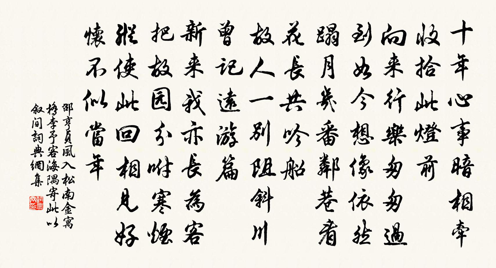 詩詞名句歷史字典書法欣賞書法字典國語詞典說文解字康熙字典古漢語字典標 題 作 者 詩 句 風入松 南金寓橋李,予客海隅,寄此以敘間作者:邵亨貞 朝代:元代原文十年心事暗相牽。收拾此燈前。向來行樂匆匆過,到如今、想像依然。蹋月幾番鄰巷,看花長共吟船。故人一別阻斜川。曾記遠遊篇。新來我亦長為客,把故園、分咐寒煙。縱使此回相見,好懷不似當年。詩詞問答問:《風入松 南金寓橋李,予客海隅,寄此以敘間》的作者是誰?答:邵亨貞問:該詩寫於哪個朝代?答:元代問:該詩是什麼體裁?答:詞書法欣賞風入松 南金寓橋李,予客海隅,寄此以敘間書法作品詩詞推薦句張康國〔宋代〕銀瞻不雨溜常滴,玉樹無風花自開。出城所見賦五題宋祁〔宋代〕二月雨堪愛,霏霏膏澤盈。添成竹箭浪,催發杏花耕。迥濕風頭冷,微含日腳明。居然嘉應在,誰是束長生。午窗坐睡蘇軾〔宋代〕 * 花盤兩膝,花竹几閣雙花肘。此間道路熟,逕到無何有。身心兩不見,息息安且久。睡蛇本亦無,何用鉤與手句釋曉瑩〔宋代〕誰復知予懶是真。念奴嬌黃應武〔宋代〕乾坤開闢,桂林有、元氣自來融結。石磴盤空行木杪,天柱屹然中立。窟宅幽深,泉源清遠,不是靈神擘。潛通後游龍華寺二首范宗尹〔宋代〕古寺山環合,崎嶇路僅通。一庵寒閉戶,群木夜號風。幽勝窮探盡,塵勞洗滌空。茲游恐不再,聊記小詩中。水龍吟閻蒼舒〔宋代〕少年聞說京華,上元景色烘晴晝。朱輪畫轂,雕鞍玉勒,九衢爭驟。春滿鰲山,夜沈陸海,一天星斗。正紅球過了再和王灼〔宋代〕幼婦傳來舊受辛,知君滿腹貯陽春。壽星台宿應同邑,草聖詩仙合一人。紫橐禁中留賦詠,白蓮社裡煉丰神。誰言徐夫人挽章度正〔宋代〕芬芳蘭蕙畹,籩豆有司存。抱燭丹心苦,深居德性尊。庭前桑有附,戶外竹生孫。遺範章章古,新詩詔後昆。初夏陸游〔宋代〕江鄉初夏暑猶輕,霽日園林有晚鶯。聊置尊罍師北海,盡除屏障學東平。綠槐露濕單衣爽,紅藥風翻病眼明。每感滿江紅(壽趙樞密)牟巘〔宋代〕七莢新春,問底事、以人為日。記貞觀、鄭公恰至,名因人得。況是今朝生上相,老天著意尤端的。便喚為、人日仲秋夜郡內西亭對月張登〔唐代〕天高月滿影悠悠,一夜炎荒並覺秋。氣與露清凝眾草,色如霜白怯輕裘。高臨華宇還知隙,靜映長江不共流。□直幽恨詩安邑坊女〔唐代〕卜得上峽日,秋江風浪多。巴陵一夜雨,腸斷木蘭歌!挽林韶州劉克莊〔宋代〕東起平戎策,鈴齋晝掩扉。身留嶠南老,餉至洛中稀。瘴自茅花起,喪同薏苡歸。不知湯介子,朝論是耶非。白田獺魅別村女詩佚名〔唐代〕潮來逐潮上,潮落在空灘。有來終有去,情易復情難。腸斷腸中子,明月秋江寒。寄劉擇之新居成裘萬頃〔宋代〕西風吹雁過吾廬,特地傳君一紙書。九載不須論舊事,萬金良豆得新居。春回院落花侵座,雨過池塘水繞除。我欲酥花韻吳頤〔宋代〕玉指纖纖出後房,似矜隨意得奇芳。只愁暖律爭先落,賴有凝脂可旋妝。近比含飴知有味,不須嚼蕊自聞香。未應安公子·遠岸收殘雨柳永〔宋代〕遠岸收殘雨。雨殘稍覺江天暮。拾翠汀洲人寂靜,立雙雙鷗鷺。望幾點、漁燈隱映蒹葭浦。停畫橈、兩兩舟人語。絕境羅隱〔唐代〕絕境非身事,流年但物華。水梳苔發直,風引蕙心斜。凡客從題鳳,膚音未勝蛙。小船兼有槳,始與問漁家。初到郡齋宋祁〔宋代〕專城四十外,中石二千餘。曠日慚良術,班春賴細書,學慵前志忘,身遠故人疏。姑俟天藏疾,雌堂日燕居。省分名句推薦父不慈則子不孝顏之推《顏氏家訓·治家篇》 馬上相逢無紙筆,憑君傳語報平安。岑參《逢入京使》 共看明月應垂淚,一夜鄉心五處同。白居易《望月有感》 宮中彩女顏如花,飄然揮手凌紫霞,從風縱體登鸞車。李白《飛龍引二首·其一》 常隨寶鐙陪金勒,絕塞指揮萬馬嘶。俞益謨《中洲株柳》 好名羈行,重利無虧。來俊臣《羅織經·保身卷第七》 雨後雙禽來占竹,秋深一蝶下尋花。文同《北齋雨後》 放逐肯消亡國恨?歲時猶動楚人哀!查慎行《三閭祠》 依舊桃花面,頻低柳葉眉。韋莊《女冠子·昨夜夜半》 既熟慣,則更覺親密;既親密,則不免一時有求全之毀,不虞之隙。曹雪芹《紅樓夢·第五回》