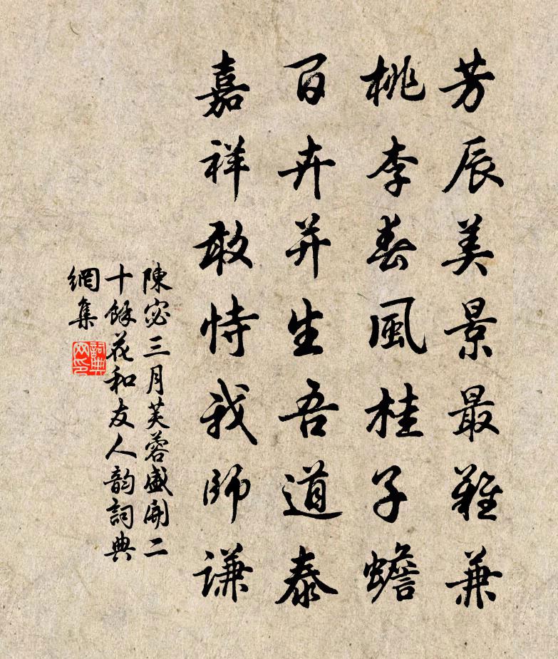 詩詞名句歷史字典書法欣賞書法字典國語詞典說文解字康熙字典古漢語字典標 題 作 者 詩 句 三月芙蓉盛開二十餘花和友人韻作者:陳宓 朝代:宋代原文芳辰美景最難兼,桃李春風桂子蟾。百卉並生吾道泰,嘉祥敢恃我師謙。詩詞問答問:《三月芙蓉盛開二十餘花和友人韻》的作者是誰?答:陳宓問:該詩寫於哪個朝代?答:宋代書法欣賞三月芙蓉盛開二十餘花和友人韻書法作品詩詞推薦皇雅十首《西師》六章尹洙〔宋代〕帝曰將臣,予嘉乃庸。廢命毒民,爾弗有終。邦典用疑,惟罪惟功。靡殛而削,協於厥中。秣陵懷古陳維崧〔清代〕紅板橋頭,錦衣倉北,金陵從古皇州。記離宮牆外,年少曾游。忽聽九重仙樂,東風細細度龍樓。依稀認,寧王玉處州月夜穆中丞席和主人劉言史〔唐代〕羌竹繁弦銀燭紅,月光初出柳城東。忽見隱侯裁一詠,還須書向郡樓中。閨怨周在〔明代〕江南二月試羅衣,春盡燕山雪尚飛。應是子規啼不到,故鄉雖好不思歸。喜遷鶯 曉行劉一止〔宋代〕曉光催角。聽宿鳥未驚,鄰雞先覺。迤邐煙村,馬嘶人起,殘月尚穿林薄。淚痕帶霜微凝,酒力沖寒猶弱。嘆倦客踏莎行(寄姊妹)蘇氏〔宋代〕孤館深沈,曉寒天氣。解鞍獨自闌乾倚。暗香浮動月黃昏,落梅風送沾衣袂。待寫紅箋,憑誰與寄。先教覓取嬉遊郴江百詠並序北園阮閱〔宋代〕一塢春風北苑芽,滿川流水武陵花。溪東舊觀仙人宅,城內高樓刺史家。過乾越宿熊氏澹園偕東采駕閣西玉國正二同年黎廷瑞〔宋代〕當年曲江燕,並醉西湖舟。芳夢故依然,落花水空流。今晨定何朝,聯裾此夷猶。暄風不驚波,小泊琵琶洲。無人摸魚子 明初賦摸魚子壽予,既次其韻,而可許有壬〔元代〕買陂塘旋載楊柳,歸來此是先務。他鄉故里都休校,舊雨不如今雨。鴻在渚。笑爾尚南飛,吾已安孤嶼。黃花解語湖外寄處賓上人裴說〔唐代〕怪得意相親,高攜一軸新。能搜大雅句,不似小乘人。嶽麓擎枯檜,瀟湘吐白蘋。他年遇同道,為我話風塵。送黎六郎赴陽翟少府韋應物〔唐代〕試吏向嵩陽,春山躑躅芳。腰垂新綬色,衣滿舊芸香。喬樹別時綠,客程關外長。只應傳善政,日夕慰高堂。次韻彥博游無為馬豀並呈孫隆州李流謙〔宋代〕聲處無人語合頭,出門猝猝又還休。縛茅晚歲欣同社,並轡名峰得勝游。松下一筇真可老,山中五月已如秋。未應和趙季行用蘭花韻三首劉宰〔宋代〕結根喦谷謝群芳,多謝光風為發揚。騷客毋煩賦紉佩,省郎行矣趣含香。眾樂亭二首錢公輔〔宋代〕勢壓平湖四面佳,好風明月是生涯。鯨鯢背上浮三島,菡萏香中放兩衙。屏列已疑雲母淨,簾垂不待水精奢。此心扇子詩李石〔宋代〕無適無莫羲皇人,不憂不懼擊壤民。只有太平容易事,事於何處費精神。次韻徐監岳四首陳造〔宋代〕湖間波聲環佩音,湖上遊子紛如林。坐窗日夢舊遊處,屯雲重務專積陰。淒風剝香梅塢滑,輕煙暝翠松行深。畫船久病寄二三親友賀鑄〔宋代〕早昧攝生理,百勞戕至真。藥靈翻佐病,詩癖竟窮人。終負黃壚恨,長違白首親。一囊安可得,四壁未應貧。燈下偈頌十三首釋智遇〔宋代〕老和尚死去二十五年,有誰撐門拄戶。雖與松源同日行,不會松源三轉語。父子背馳,面不相睹,直至如今成莽齒小桃紅張可久〔元代〕一城秋雨豆花涼,閒倚平山望。不似年時鑑湖上,錦雲香,採蓮人語荷花盪。西風雁行,清溪漁唱,吹恨入滄浪。湖樓早起江湜〔清代〕面湖樓好納朝光,夜夢分明起輒忘。但記曉鍾來兩寺,一鐘聲短一聲長。名句推薦夫情動而言形,理髮而文見劉勰《文心雕龍·體性》 土膏欲動雨頻催,萬草千花一餉開;范成大《春日田園雜興》 惟草木之零落兮,恐美人之遲暮。屈原《離騷》 荷笠帶斜陽,青山獨歸遠。劉長卿《送靈澈上人》 正而過則迂,直而過則拙,故迂拙之人,猶不失為正直。王永彬《圍爐夜話·第一一O則》 窮兵極武,仁者不為。令狐德棻《周書·列傳·卷二十七》 幼敏悟過人,讀書輒成誦。歐陽修《畫地學書》 露濕晴花春殿香,月明歌吹在昭陽。李益《宮怨》 時無英雄,使豎子成名!房玄齡《晉書·列傳·第十九章》 小雨纖纖風細細,萬家楊柳青煙里。朱服《漁家傲·小雨纖纖風細細》