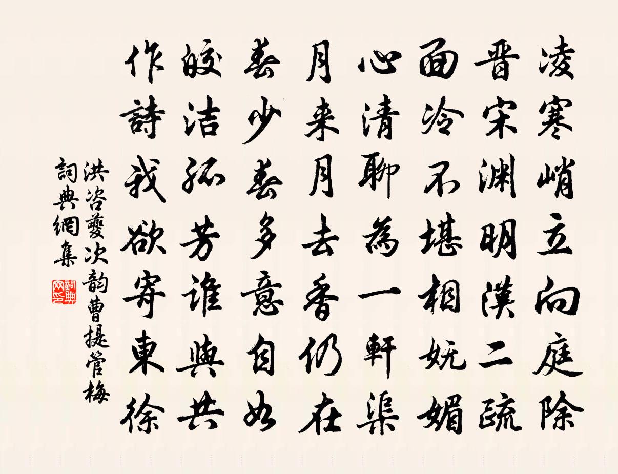 詩詞名句歷史字典書法欣賞書法字典國語詞典說文解字康熙字典古漢語字典標 題 作 者 詩 句 次韻曹提管梅作者:洪咨夔 朝代:宋代次韻曹提管梅原文凌寒峭立向庭除,晉宋淵明漢二疏。面冷不堪相嫵媚,心清聊為一軒渠。月來月去香仍在,春少春多意自如。皎潔孤芳誰與共,作詩我欲寄東徐。詩詞問答問:次韻曹提管梅的作者是誰?答:洪咨夔問:次韻曹提管梅寫於哪個朝代?答:宋代洪咨夔次韻曹提管梅書法欣賞次韻曹提管梅書法作品詩詞推薦再使河北司馬光〔宋代〕桑麥青青四月初,皇華使者又指車。為臣豈得辭王事,只向金鑾坐讀書。李正將病歸董嗣杲〔宋代〕從軍傳勇略,信腳困行間。病廢羞長劍,秋歸見故山。鏡中雙鬢改,眾里一身還。風雪沉昏夜,猶思戌散關。惜花韓偓〔唐代〕皺白離情高處切,膩香愁態靜中深。眼隨片片沿流去,恨滿枝枝被雨淋。總得苔遮猶慰意,若教泥污更傷心。臨軒趙季茂通判惠詩走筆奉和十篇岳珂〔宋代〕草堂無不宜,猶記樂天詩。尚有驚猿怨,莫教司馬知。上宮仙闕近,左蠡客帆吹。欲涉窮陘步,茲狂何悔為。桂枝香(寄揚州馬觀復。時新舊侯交惡,甚思去年中秋泛月,感恨難言)劉辰翁〔宋代〕 * 人去。但桂影徘徊,荒杯承露。東望鞭芙縹緲,寒光如注。去年夜半橫江夢,倚危檣,參差曾賦。茫茫角動,代贈方岳〔宋代〕碧玉香深冷翠篝,夢魂不到玉搔頭。暮天欲雪寒如此,且問梅花愁不愁。和澗泉賦山楹周文璞〔宋代〕共惟古至人,用意事物表。一丘謾摧殘,八極自圍繞。不勞日月運,坐見歲時了。魯夢久不作,楚賦那遽曉。既煩句徐似道〔宋代〕劉顯貴為天子友,退之窮作相君書。題吳熙老風雲圖張耒〔宋代〕雨腳橫空萬牛弩,烈風吹山山欲仆。草披木拔何足道,大江翻瀾失洲渚。路旁失轡者誰子,道阻且長泥沒屨。鞭驢頌證道歌證道歌釋印肅〔宋代〕在欲行禪知見力,活計千般全不識。十波羅蜜鎮長存,龐公老漢通訊息。偈頌六十五首釋普濟〔宋代〕不參禪,不問道。豎起鐵脊樑,死蛇鑽出劃。不是禪,不是道。雲門千歲僧,越山鼐長老。贈苦行僧雍裕之〔唐代〕幽深紅葉寺,清淨白毫僧。古殿長鳴磬,低頭禮晝燈。庵中雜書陸游〔宋代〕萬物並作吾觀復,眾人皆醉我獨醒。走遍世間無著處,閉門鋤菜伴園丁。丐祠不獲方岳〔宋代〕老馬倦長路,歸鴻愜深林。廬山共江左,久已費越吟。樵川邈何方,豈解操南音。三書光范門,香火盟初心。頗聞頌古九十八首釋印肅〔宋代〕信地無閒處,知心用不非。微塵佛國土,妙在一毫釐。應當知是見,所說但隨宜。古錐無做作,謾把布毛吹。官滿趨朝留滯吳門即事書懷十首仲並〔宋代〕小樓巀嶭亂山橫,獨倚朱欄度晚晴。忽聽如簧語音好,祗緣高處最宜鶯。贈丘先生鄭巢〔唐代〕雲泉心不爽,垂日坐柴關。硯取檐前雨,圖開異國山。原僧招過宿,沙鳥伴長閒。地與中峰近,殘陽獨不還。虢州南池候嚴中丞不至岑參〔唐代〕池上日相待,知君殊未回。徒教柳葉長,漫使梨花開。駟馬去不見,雙魚空往來。思想不解說,孤負舟中杯。正月二日葛天民〔宋代〕小巷春陰獨掩扉,峭寒著盡過冬衣。老來情緒無多子,禁得梅花似雪飛。觀湖丘葵〔宋代〕潮來沙石沒,潮去沙石露。士生那無學,學則詞章富。名句推薦不管三七二十一馮夢龍《醒世恆言·卷一》 春欲盡,日遲遲,牡丹時歐陽炯《三字令·春欲盡》 獨有宦遊人,偏驚物候新。杜審言《和晉陵陸丞早春遊望》 無端更渡桑乾水,卻望并州是故鄉。劉皂《旅次朔方 / 渡桑乾》 霜殞蘆花淚濕衣,白頭無復倚柴扉。與恭《思母》 願我如星君如月,夜夜流光相皎潔。范成大《車遙遙篇》 如來者即諸法如義。鳩摩羅什譯《金剛經·究竟無我》 東籬把酒黃昏後,有暗香盈袖。李清照《醉花陰·薄霧濃雲愁永晝》 打起黃鶯兒,莫教枝上啼。金昌緒《春怨 / 伊州歌》 賞罰如加於身,賦斂如取己物。此愛民之道也。姜子牙《六韜·文韜·國務》