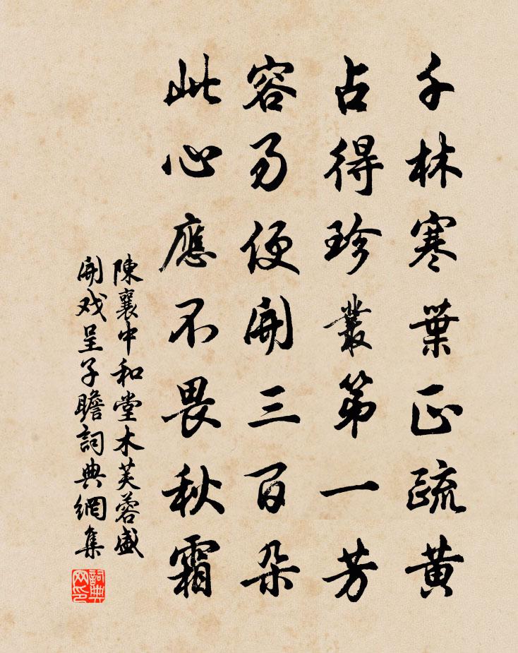 詩詞名句歷史字典書法欣賞書法字典國語詞典說文解字康熙字典古漢語字典標 題 作 者 詩 句 中和堂木芙蓉盛開戲呈子瞻作者:陳襄 朝代:宋代中和堂木芙蓉盛開戲呈子瞻原文千林寒葉正疏黃,占得珍叢第一芳,容易便開三百朵,此心應不畏秋霜。詩詞問答問:中和堂木芙蓉盛開戲呈子瞻的作者是誰?答:陳襄問:中和堂木芙蓉盛開戲呈子瞻寫於哪個朝代?答:宋代陳襄中和堂木芙蓉盛開戲呈子瞻書法欣賞中和堂木芙蓉盛開戲呈子瞻書法作品詩詞推薦米元章墓誌帖贊岳珂〔宋代〕予觀柳少師,在唐以能書聞。當時碑誌或非其筆,則人以不孝議其子孫。噫嘻,陳君之傳,夫豈以其文。如寶晉省秋懷陳維崧〔清代〕秋氣橫排萬馬,盡屯在、長城牆下。每到三更素商瀉。濕龍樓,暈鴛機,迷爵瓦。誰復憐卿者?酒醒後、槌床悲詫次韻孔四著作北行滹沱黃庭堅〔宋代〕駝褐蒙風霜,雞聲眇墟里。青燈進豆粥,落月踏冰水。平生不龜藥,才可衛十指。持比千戶封,誰能優劣此。遊樂磧江中石洲馮時行〔宋代〕石出杖藜穩,沙暄牽興長。半江鷗鳥地,三峽水雲鄉。攜客撐煙艇,開樽俯綠塘。便當從此去,煙雨釣滄浪。論詩絕句依老人韻林泳〔宋代〕風騷一脈苦難知,媲白抽黃世不疑。沈謝諸人聲律起,千年無復性情詩。泊昭亭山下得亭字梅堯臣〔宋代〕雲中峰午午,潭上樹亭亭。久作大梁客,貧留小阮醒。灘愁江舸澀,祠信楚巫靈。日暮渡頭立,山歌不可聽。代吳守與趙侯為壽劉過〔宋代〕夜上南樓望玉京,將星光底壽星明。不須便即騎黃鶴,且為皇家致太平。乙丑仲冬自甯遠來游陽華李長庚〔宋代〕沿崖渡水六七里,劃見幽岩畫屏倚。卻躡長虹信步行,下瞰淺清皆腳底。漫郎泉石之董狐,妙語品題良不誣。千岩和謝景英提乾曹勛〔宋代〕公家繡戶壓城垣,物采隨時入懶軒。人倚層樓風滿檻,江涵秋影月當門。剩聞薌淥羅襦麗,醉看金荷燭影昏。可但木蘭花令蘇軾〔宋代〕高平四面開雄壘。三月風光初覺媚。園中桃李使君家,城上亭台遊客醉。歌翻楊柳金尊沸。飲散憑闌無限意。雲深江神子/江城子劉鎮〔宋代〕送春曾到百花洲。夕陽收。暮雲留。想伴花神,騎鶴上揚州。回首湖山情味淡,重把酒,更登樓。相思南浦古津頭縱筆陸游〔宋代〕素月徘徊牛斗間,天風吹鶴度函關。一年似此佳時少,喚起陳摶醉華山。相見歡楊炎正〔宋代〕江湖萬里征鴻。再相逢。多少風煙摸在、笑談中。歌裙醉。羅巾淚。別愁濃。瘦減腰圍不礙、帶金重。過青陽齊丘舊隱周南〔宋代〕利盡漁民五季年,誰蠲丁口畝輸錢。不將公量收家邑,漫把徵賢改應天。敬賦虛齋孫君容膝陳著〔宋代〕雲連屋不居,三閒葺茅茨。田園非不寬,一畝環竹籬。楚楚山下花,湛湛池邊□。丈室南坡□,容膝以扁之。誰謂除夜寄張達羅隱〔唐代〕梅花已著眼,竹葉況粘唇。只此留殘歲,那堪憶故人。亂罹書不遠,衰病日相親。江浦思歸意,明朝又一春。佛池口大風復泊范成大〔宋代〕碧葦無思連天生,青山有情終日橫。風聲洶怒木朝拔,川氣流光珠夜明。誰能坐守白頭浪,我欲往騎金背鯨。俯仰趙德麟有詩言過萬壽縣得玉芝乃以供一醉之味張耒〔宋代〕王孫憔悴食無肉,天遣枯腸出雙玉。荒園夜飲供一醉,仙物無乃遭輕辱。王孫高名滿天下,剸膾龍蛟刀幾熟。眼高香積寺午齋程公許〔宋代〕峻陟龍門路,來參雞骨師。樓台春雨霽,魚鼓午齋時。倦憩僧留話,荒尋僕僮隨。一筇支野步,且以暮為期。過九疑馬大同〔宋代〕帝德於今祀萬年,如何遺像托疏椽。憑誰為假丹青手,付與梅仙十萬錢。名句推薦黃山僅見其腳,惜未一瞻面目。沈復《浮生六記·浪遊記快》 長者立,幼勿坐。長者坐,命乃坐。李毓秀《弟子規·出則弟》 人怕三見面,樹怕一墨線。佚名《增廣賢文·下集》 夢回人遠許多愁,只在梨花風雨處。辛棄疾《玉樓春·風前欲勸春光住》 二月春花厭落梅。仙源歸路碧桃催。晏幾道《浣溪沙·二月春花厭落梅》 野曠天低樹,江清月近人。孟浩然《宿建德江》 父子有親,君臣有義,夫婦有別,長幼有序,朋友有信。孟子《孟子·滕文公章句上·第四節》 傍鄰聞者多嘆息,遠客思鄉皆淚垂。李頎《聽安萬善吹觱篥歌》 天際疏星趁馬,簾晝隙、冰弦三疊。吳文英《暗香·送魏句濱宰吳縣解組分韻得闔字》 一葉浮萍歸大海,為人何處不相逢!吳承恩《西遊記·第四十回》