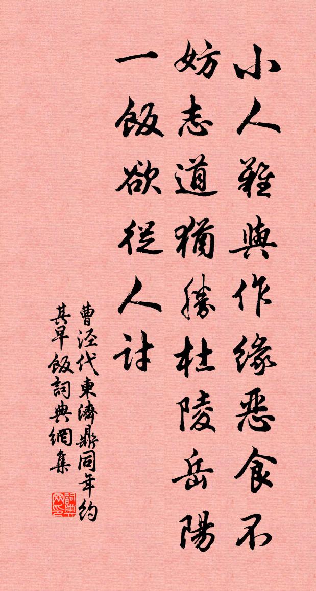 詩詞名句歷史字典書法欣賞書法字典國語詞典說文解字康熙字典古漢語字典標 題 作 者 詩 句 代柬濟鼎同年約其早飯作者:曹涇 朝代:宋代代柬濟鼎同年約其早飯原文小人難與作緣,惡食不妨志道。猶勝杜陵岳陽,一飯欲從人討。詩詞問答問:代柬濟鼎同年約其早飯的作者是誰?答:曹涇問:代柬濟鼎同年約其早飯寫於哪個朝代?答:宋代曹涇代柬濟鼎同年約其早飯書法欣賞代柬濟鼎同年約其早飯書法作品詩詞推薦再過宜興舟中見芍藥數枝憶淮鄉花之盛為之悵仲並〔宋代〕故眼相看未作疏,平生風味是吾廬。娉娉裊裊誰家子,浪說傾城總不如。別後讀鶴田李元暉新詩用其體方回〔宋代〕菊悴蘭摧憶別離,雪邊重映十年詩。淚凝紫篠湘靈怨,血迸紅英蜀魄悲。曠野虎狼喧寇暴,長途魚雁隔親知。莊生早春示陳元達一首王阮〔宋代〕北陸藏冰後,東風入律和。梅因三弄少,麥賴六花多。簪盍思喧馬,燈游羨鬧蛾。躬耕吾不倦,其奈沒田何。縠波趙時韶〔宋代〕鮫人機軸巧,織出水晶宮。浣濯有新雨,卷舒無定風。晴嵐輕染綠,斜日半澆紅。漁父無端甚,輕舠截箇中。頌古二十一首釋鼎需〔宋代〕騎虎頭,把虎尾,霹靂一聲驚萬里。坐觀成敗老將軍,腦後一槌誰敢擬。擬不擬,個個無裩長者子。琴曲歌辭王敬伯歌李端〔唐代〕妾本舟中客,聞君江上琴。君初感妾嘆,妾亦感君心。遂出合歡被,同為交頸禽。傳杯惟畏淺,接膝猶嫌遠。侍婢次韻李袁州絕句七首趙蕃〔宋代〕路從迫窄因山轉,喜見臨岐釋子庵。野茗柏香俱不惡,老松高竹更相參。春日雜興十首秦觀〔宋代〕東方有美人,容華茂春粲。抱影守單棲,含睇理哀彈。聲意一何切,所歡邈雲漢。徒然事膏沐,孰與徂昏旦。微誠聲聲慢·尋尋覓覓李清照〔宋代〕尋尋覓覓,冷冷清清,淒悽慘慘戚戚。乍暖還寒時候,最難將息。三杯兩盞淡酒,怎敵他晚來風急!雁過也,正傷答王道濟寺丞觀許道寧山水圖黃庭堅〔宋代〕往逢醉許在長安,蠻溪大硯磨松煙。忽呼絹素翻硯水,久不下筆或經年。一日踏門撼門鈕,巾帽欹斜猶索酒。舉杯句胡僧〔宋代〕何年飲著聲聞酒,直到而今醉不醒。何事將軍封萬戶,卻教紅粉去和戎。端午感懷舒岳祥〔宋代〕曾飲昌陽七十三,老來大布當輕衫。豫儲當采三年艾,緩計空尋六日蟾。楚俗舊時沉黍恨,唐宮此日賜衣沾。梔香楊柳枝·桃源仙子不須夸司空圖〔唐代〕桃源仙子不須夸,聞道惟裁一片段預告。何似浣紗溪畔住,綠陰相間兩三家。和公儀上馬王珪〔唐代〕太微星畔鎖中台,五歲重叨第眾材。桃李更饒當日盛,詠觴尤喜一春陪。賦成英俊無過漯,詩似神仙並姓梅。拂曉江南曲柳惲〔南北朝〕汀洲采白苹,日落江南春。洞庭有歸客,瀟湘逢故人。故人何不返,春華復應晚。不道新知樂,只言行路遠。永寧里小園與沈校書接近,悵然題寄羊士諤〔唐代〕故里心期奈別何,手移芳樹憶庭柯。東皋黍熟君應醉,梨葉初紅白露多。和陶停雲吳芾〔宋代〕淵明抱節,不渝風雨。為米折腰,頗厭艱阻。歸臥柴桑,孤松獨撫。希蹤前賢,寤寐傾佇。送李莽之制乾東歸探韻得今字度正〔宋代〕萬卷胸中貯古今,西遊蜀道手捫參。寶彝殘刻窺心畫,清廟遺音振學林。雅行瓊瑰珠慰我,每陪樽俎定論心。飄飄思歸八絕胡寅〔宋代〕昨日春風花滿山,回頭秋葉錦斑斑。終年竅綠慚憂寄,何事遲留久未還。早春有懷亡友秋曉恕齋小山諸公陳紀〔宋代〕詩成誰與共賡酬,又綠前汀桂若洲。舊友凋零渾似夢,新春蕭索亦如秋。陰晴氣候惟共睡,今古乾坤只載愁。我與名句推薦長幼有序。孟子《孟子·滕文公章句上·第四節》 黃雞白酒,君去村社一番秋。辛棄疾《水調歌頭·送楊民瞻》 夫死戰場子在腹,妾身雖存如晝燭。張籍《征婦怨》 難相見,易相別,又是玉樓花似雪。韋莊《應天長·別來半歲音書絕》 未晚先投宿,雞鳴早看天。佚名《增廣賢文·上集》 無數春筍滿林生,柴門密掩斷行人。杜甫《詠春筍》 莫唱當年長恨歌,人間亦自有銀河。袁枚《馬嵬》 務本節用財無極。荀子《荀子·成相》 知人既以為難,自知誠亦不易。吳兢《貞觀政要·卷三·論擇官》 斜風細雨作春寒。對尊前。朱淑真《江城子·賞春》