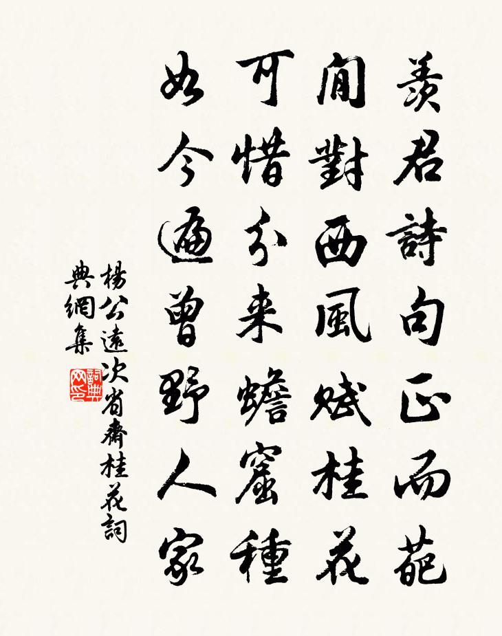 詩詞名句歷史字典書法欣賞書法字典國語詞典說文解字康熙字典古漢語字典標 題 作 者 詩 句 次省齋桂花作者:楊公遠 朝代:宋代次省齋桂花原文羨君詩句正而葩,閒對西風賦桂花。可惜分來蟾窟種,如今遍曾野人家。詩詞問答問:次省齋桂花的作者是誰?答:楊公遠問:次省齋桂花寫於哪個朝代?答:宋代楊公遠次省齋桂花書法欣賞次省齋桂花書法作品詩詞推薦禪人寫真求贊釋正覺〔宋代〕春山似肥,春雪才晞。默中有句,用也無機。不來而來兮非三界之籠絡,無住而住兮是二儀之範圍。秋日夙興張鎡〔宋代〕晨起浴倍佳,爽疏洞膚發。靈蕪郁寶鼎,清忱睇天闕。三十六帝座,一一神遠謁。旋瞻雲始盈,灑雨響飃忽。余霏上周益公曹彥約〔宋代〕荒村建午月,斯螽動股鳴。借問暑方熾,何意作秋聲。自言本寒族,四言本寒族,四海無令名。振羽每自嘆,在野偈頌二首釋齊已〔宋代〕漸漸雞皮鶴髮,父少而子老。看看行步躘蹱,疑殺木上座。直饒金玉滿堂,照顧白拈賊。豈免衰殘老病,正好著精【仙呂】錦橙梅張可久〔元代〕紅馥馥的臉襯霞,黑髭髭的鬢堆鴉。料應他,必是箇中人,打扮的堪描畫。顫巍巍的插著翠花,寬綽綽的穿著輕紗泰州守許寺正輓詞二首周必大〔宋代〕身襲黃門慶,腰懸紫綬龜。未登知命歲,遽逼蓋棺期。風咽哀笳恨,雲凝斷壟悲。只應潘岳淚,重憶悼亡時。和西川李尚書漢州微月游房太尉西湖劉禹錫〔唐代〕木落漢川夜,西湖懸玉鉤。旌旗環水次,舟楫泛中流。目極想前事,神交如共游。瑤琴久已絕,松韻自悲秋。閒居雜詠三十二首兄弟陳淳〔宋代〕兄長而弟幼,天屬之羽翼。一言在有序,不可事私閱。江神子李之儀〔宋代〕今宵莫惜醉顏紅,十分中,且從容。須信歡情,回首似旋風。流落天涯頭白也,難得是,再相逢。十年南北感征鴻定風波李珣〔唐代〕志在煙霞慕隱淪,功成歸看五湖春。一葉舟中吟復醉,雲水,此時方認自由身。花島為鄰鷗作侶,深處,經年不見和王子元中秋會飲余靖〔宋代〕混元鼓橐四氣平,西商之氣爽且輕。望舒按轡出東海,孤輪斲冰碾太清。碧落坦夷輪不停,銀河浩蕩波無聲。千家菩薩蠻 湖上即事劉因〔元代〕樓前曲浪歸橈急。樓中細雨春風涇。終日倚危闌。故人湖上山。高情渾似舊。只在東風瘦。薄晚去來休。裝成一段奉懷粹戲成李彌遜〔宋代〕期人至不傷秋晚,覓句無工愁夜長。誰與寒窗催好林,幾重白氎一盂香。朝中措朱敦儒〔宋代〕閒愁無奈指頻彈。芳景為誰殘。可惜良宵虛過,且容草草謀歡。招要楚雨,留連漢佩,多謝青鸞。濃艷暗香爭暖,佛友唐寅〔明代〕學佛俄經二十年,於今地上擁青蓮。我來願結三生友,共看當時手指天。鄂渚送池州程使君劉長卿〔唐代〕蕭蕭五馬動,欲別謝臨川。落日蕪湖色,空山梅冶煙。江湖通廨舍,楚老拜戈船。風化東南滿,行舟來去傳。次韻楊少雲桂花高文虎〔宋代〕溶溶漠漠秋光淡,耿耿寥寥夜色清。不是靈根函爽氣,如何醖得此香成。玉兔搗霜千萬粒,淒風折作四花凝。廣寒和靜照詩韻釋普濟〔宋代〕半千尊者眼如眉,一一從頭為點開。踏斷石橋成兩段,方知親過一回來。泊釣台毛幵〔宋代〕白鶴千秋去不歸,山川蕭瑟閟光輝。孫郎祖墓今無主,不及先生一釣磯。九井王安石〔宋代〕沿崖涉澗三十里,高下犖确無人耕。捫蘿挽蔦到山趾,仰見吹瀉何崢嶸。餘聲投林欲風雨,末勢卷土猶溪阬。飛蟲名句推薦連山變幽晦,綠水函晏溫柳宗元《飲酒》 綠淨春深好染衣。際柴扉。賀鑄《釣船歸·綠淨春深好染衣》 移舟泊煙渚,日暮客愁新。孟浩然《宿建德江》 便做無情,莫也愁人苦朱淑真《蝶戀花·送春》 雲壓西村茅舍重,怕他榾柮同燒。陳維崧《臨江仙·寒柳》 見世人可取者多,則德日進矣。王永彬《圍爐夜話·第五六則》 青海長雲暗雪山,孤城遙望玉門關。王昌齡《從軍行七首·其四》 坐愁群芳歇,白露凋華滋。李白《秋思》 燕子飛來窺畫棟,玉鉤垂下簾旌。歐陽修《臨江仙·柳外輕雷池上雨》 玄都觀里桃千樹,花落水空流。元好問《人月圓·玄都觀里桃千樹》