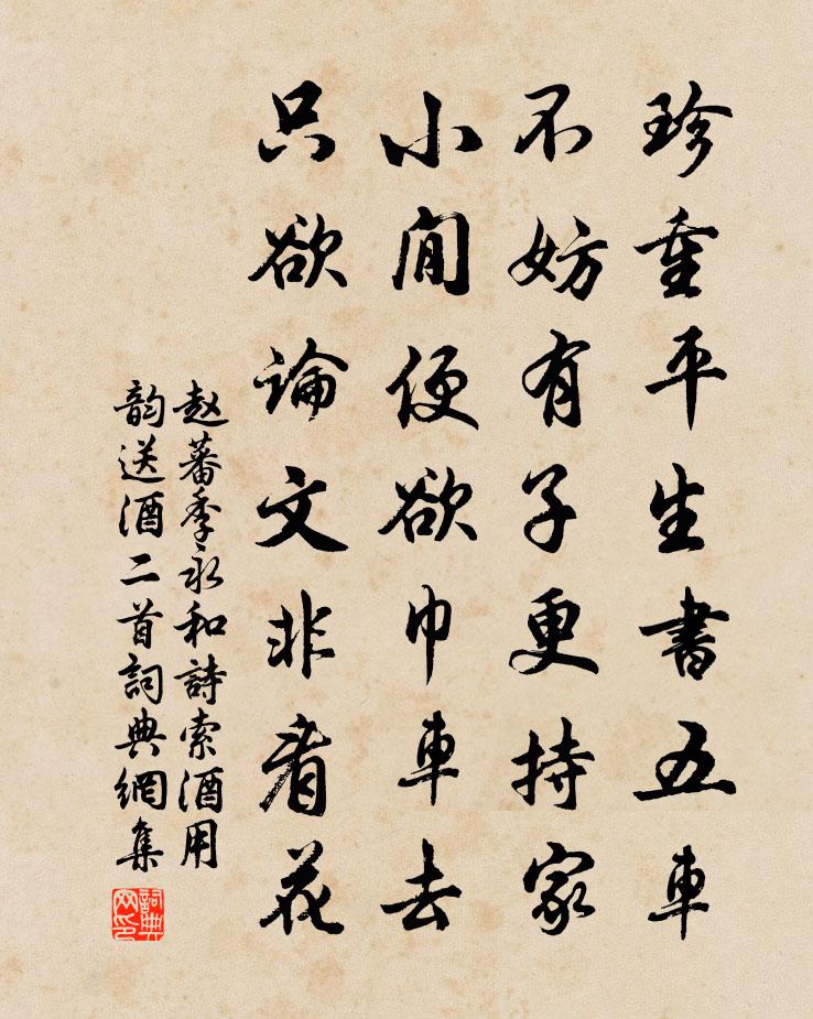 詩詞名句歷史字典書法欣賞書法字典國語詞典說文解字康熙字典古漢語字典標 題 作 者 詩 句 季永和詩索酒用韻送酒二首作者:趙蕃 朝代:宋代季永和詩索酒用韻送酒二首原文珍重平生書五車,不妨有子更持家。小閒便欲巾車去,只欲論文非看花。詩詞問答問:季永和詩索酒用韻送酒二首的作者是誰?答:趙蕃問:季永和詩索酒用韻送酒二首寫於哪個朝代?答:宋代趙蕃季永和詩索酒用韻送酒二首書法欣賞季永和詩索酒用韻送酒二首書法作品詩詞推薦夢洞庭釋敬安〔清代〕昨夜汲洞庭,君山青入瓶。倒之煮團月,還以浴繁星。一鶴從受戒,群龍來聽經。何人忽吹笛,使我松間醒。宴越府陳法曹西亭孫逖〔唐代〕公府西岩下,紅亭間白雲。雪梅初度臘,煙竹稍迎曛。水木涵澄景,簾櫳引霽氛。江南歸思逼,春雁不堪聞。書妙應庵壁張栻〔宋代〕窗前新竹淨娟娟,借我風涼一榻眠。試問莊周說鵬鷃,何如洙泗舉魚鳶。致仕曾幾〔宋代〕妻孥挽我奉真祠,老子婆娑正坐誰。受祿功無一毫末,休官事有十年遲。尚容款曲懸車地,絕勝倉皇易簀時。請祝乳燕飛(壽乾官)劉克莊〔宋代〕風流八十,是人間妝點,孩兒眉額。再著三星添上面,又是一般奇特。且置零頭,舉將成數,算起君須識。從今十雪晴楊凝式〔唐代〕春來冰未泮,冬至雪初晴。為報方袍客,豐年瑞已成。西山吟許大〔唐代〕自從明府歸仙后,出入塵寰直至今。不是藏名混時俗,賣藥沽酒要安心。應制賞花寇準〔宋代〕上苑經春雨,宸游屬盛時。花光籠寶檻,柳色暗龍池。瀲灩雕觴滿,融和暖日遲。共歌成至樂,千載搖聲詩。自立秋前病過白露猶未平遣懷陸游〔宋代〕飢能堅志節,病可養精神。不動成羆臥,微勞學鳥伸。功名知幻境,憂患笑前身。藥裹吾何厭,秋燈作夢新。烈祖孝高輓歌二首李中〔唐代〕誰解叩乾關,音容去不還。位方尊北極,壽忽殞南山。鳳輦應難問,龍髯不可攀。千秋遺恨處,雲物鎖橋山。仙馭制履贈楊達姚月華〔唐代〕金刀剪紫絨,與郎作輕履。願化雙仙鳧,飛來入閨里。吳參政輓詩三首高斯得〔宋代〕中外逾三紀,勤勞備百為。韓公飽經濟,杜杞困驅馳。風靜千屯祲,春回數路飢。江淮與襄漢,何地不豐碑。頌古一○一首釋子淳〔宋代〕法爾非修本十成,平常酬答最分明。端然指出長安道,無奈遊人不肯行。次韻公權燈花朱長文〔唐代〕蘭膏未耗結花新,花自無情喜在人。生向輕籠先得地,開從細焰別裝春。飛蛾雖繞光難掩,夢蝶初回色尚勻。更待道林寺送莫侍御(一作麓州精舍送莫侍御歸寧)張謂〔唐代〕何處堪留客,香林隔翠微。薜蘿通驛騎,山竹掛朝衣。霜引台烏集,風驚塔雁飛。飲茶勝飲酒,聊以送將歸。九月二十日微雪,懷子由弟二首蘇軾〔宋代〕江上同舟詩滿篋,鄭西分馬涕垂膺。未成報國慚書劍,豈不懷歸畏友朋。官舍度秋驚歲晚,寺樓見雪與誰登。遙知次韻王少清告歸七首項安世〔宋代〕蓮幕斑衣底,何因有旅愁。錦官城裡客,雲上澤邊州。夜夜還鄉夢,年年異縣秋。鶺鴒憐羽翼,鴻雁憶朋儔。便作麂杜甫〔唐代〕永與清溪別,蒙將玉饌俱。無才逐仙隱,不敢恨庖廚。亂世輕全物,微聲及禍樞。衣冠兼盜賊,饕餮用斯須。午睡起消搖園中因登山麓薄暮乃歸陸游〔宋代〕老病攻百骸,徽纆困束縛;頹然一熟睡,如獲萬金藥。窗明竹影亂,林暖鳥聲樂。灰深香欲上,火活湯正作,毫甌春日寄友(一作春日南台初晴望寄友)李群玉〔唐代〕晴氣熏櫻蕊,豐蒙雪滿林。請君三斗酒,醉臥白羅岑。名句推薦翠葆參差竹徑成。新荷跳雨淚珠傾。周邦彥《浣沙溪·翠葆參差竹徑成》 亭皋木葉下。隴首秋雲飛。柳惲《搗衣詩》 草秀故春色,梅艷昔年妝。李世民《元日》 坐開桑落酒,來把菊花枝。杜甫《九日楊奉先會白水崔明府》 榮非己莫恃,禍惟他勿縱。來俊臣《羅織經·瓜蔓卷第十二》 曉寒料峭尚欺人,春態苗條先到柳。毛滂《玉樓春·己卯歲元日》 一信字是立身之本,所以人不可無也王永彬《圍爐夜話·第六則》 夫謀必素見成事焉,而後履之左丘明《國語·吳語·越王勾踐命諸稽郢行成於吳》 言則稱於湯文,行則譬於狗豨,傷矣哉。墨子《墨子·46章 耕柱》 無限傷心夕照中,故國淒涼,剩粉余紅。夏完淳《一剪梅·詠柳》
