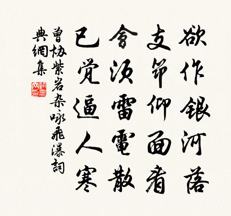 詩詞名句歷史字典書法欣賞書法字典國語詞典說文解字康熙字典古漢語字典標 題 作 者 詩 句 紫岩雜詠飛瀑作者:曾協 朝代:宋代紫岩雜詠飛瀑原文欲作銀河落,支筇仰面看。會須雷電散,已覺逼人寒。詩詞問答問:紫岩雜詠飛瀑的作者是誰?答:曾協問:紫岩雜詠飛瀑寫於哪個朝代?答:宋代曾協紫岩雜詠飛瀑書法欣賞紫岩雜詠飛瀑書法作品詩詞推薦永遇樂楊無咎〔宋代〕黃葉繽紛,碧江清淺,錦水秋暮。畫鼓冬冬,高牙颭颭,離棹無由駐。波聲笳韻,蘆花蓼穗,翻作別離情緒。須知司馬遷墓牟融〔唐代〕落落長才負不羈,中原回首益堪悲。英雄此日誰能薦,聲價當時眾所推。一代高風留異國,百年遺蹟剩殘碑。經過和仲固春日村居即事十二絕胡寅〔宋代〕正眼如君了了明,未嘗沉醉本來醒。自將周易規兒輩,白馬空傳一藏經。春日寫懷龍輔〔宋代〕暖氣逼房楹,開簾多鳥聲。竹春思筍嫩,地日識泥晴。西湖壽星院此君軒蘇軾〔宋代〕臥聽謖謖碎龍鱗,俯看蒼蒼立玉身。一舸鴟夷江海去,尚余君子六千人。寄李頤老趙汝騰〔宋代〕易說刊成未,心傳自能雲。寄聲揚舶使,一力主斯文。再用前韻李彌遜〔宋代〕努力避喧遭掣村,強顏追好得嗔拳。交情只有春風厚,千里隨人不用錢。風李嶠〔唐代〕落日生蘋末,搖揚遍遠林。帶花疑鳳舞,向竹似龍吟。月動臨秋扇,松清入夜琴。若至蘭台下,還拂楚王襟。與張十八同效阮步兵一日復一夕韓愈〔唐代〕一日復一日,一朝復一朝。只見有不如,不見有所超。食作前日味,事作前日調。不知久不死,憫憫尚誰要。富貴詩一首李淑〔宋代〕多羅四十年,偶未識摩氈。近有王宣政,時時與紙錢。水調歌頭張翥〔元代〕三十九年我,老色上吟髭。生辰月宿南斗,正合退之詩。今歲兩逢正月,準算恰成四十,歲暮日斜時。臘彘剮紅玉成都汪元量〔宋代〕錦城滿目是煙花,處處紅樓賣酒家。坐看浮雲橫玉壘,行觀流水盪金沙。巴童棧道騎高馬,蜀卒城門射老鴉。見說題秋墉小景陳深〔宋代〕寒溪上下碧,水鳥去來輕。衰柳傷秋色,應知盡不成。堯歌(一作舜歌,賞鄭氏莊客去婦)孟郊〔唐代〕爾室何不安,爾孝無與齊。一言應對姑,一度為出妻。往轍才晚鐘,還轍及晨雞。往還跡徒新,很戾竟獨迷。娥女冬夜吳龍翰〔宋代〕讀罷床頭一卷易,晚風凍盡銅壺滴。起傍危闌嘯一聲,月明何處人橫笛。武康附夜航入京董嗣杲〔宋代〕今晚後溪風色順,暑威未肯回涼信。獨泛官河雨氣收,野林鴉落歸無陣。聽鍾搖出港汊重,新塘光現橫空龍。松頭三月二十日多葉杏盛開蘇軾〔宋代〕零露泫月蕊,溫風散晴葩。春工了不睡,連夜開此花。芳心誰剪刻,天質自清華。惱客香有無,弄妝影橫斜。中山宮詞十首張樞〔宋代〕堯殿融春天宴開,山呼才了樂聲催。侍臣宣勸君恩重,宰相親王對舉杯。偈頌七十六首釋師範〔宋代〕恍恍惚惚,杳杳冥冥,非精非物,非佛非心。缺齒老胡得之而不識,颺在乎嵩山之陰。諸人還識得麽,水上青青綠絕句佚名〔宋代〕釣罷孤舟系葦梢,酒開新瓮鮓開包。自從江浙為漁父,二十餘年手不叉。名句推薦妾身悔作商人婦,妾命當逢薄倖夫。徐再思《陽春曲·閨怨》 有梅無雪不精神,有雪無詩俗了人。盧梅坡《雪梅·其二》 花謝花飛花滿天,紅消香斷有誰憐。曹雪芹《紅樓夢·第二十七回》 離恨做成春夜雨。添得春江,劃地東流去楊炎正《蝶戀花·別范南伯》 青青河畔草,綿綿思遠道。佚名《飲馬長城窟行》 鳥向檐上飛,雲從窗里出。吳均《山中雜詩》 八月長江萬里晴,千帆一道帶風輕。崔季卿《晴江秋望》 何處可為別,長安青綺門。李白《送裴十八圖南歸嵩山二首》 明朝游上苑,火速報春知。武則天《臘日宣詔幸上苑 / 催花詩》 野棠花落,又匆匆過了,清明時節。辛棄疾《念奴嬌·書東流村壁》