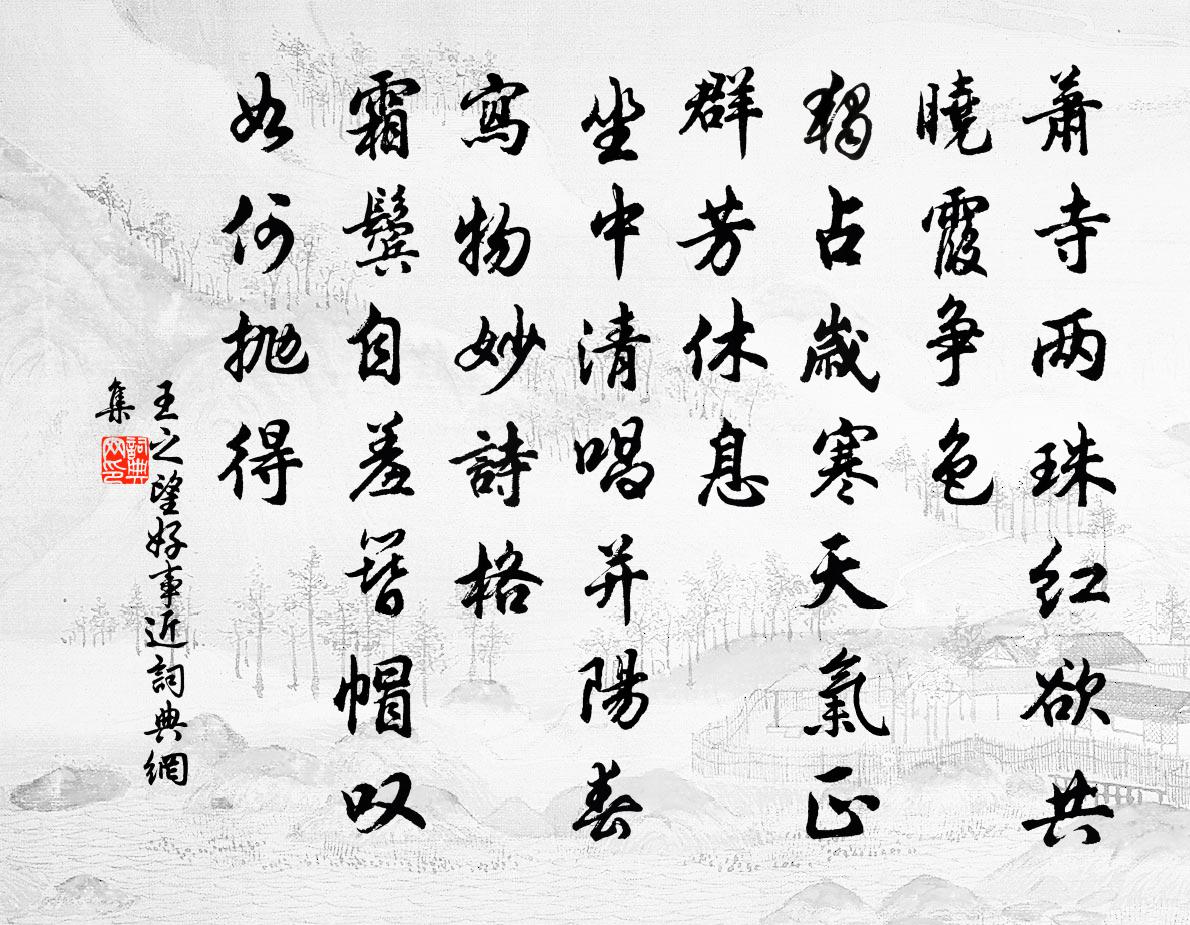詩詞名句歷史字典書法欣賞書法字典國語詞典說文解字康熙字典古漢語字典標 題 作 者 詩 句 好事近作者:王之望 朝代:宋代好事近原文蕭寺兩珠紅,欲共曉霞爭色。獨占歲寒天氣,正群芳休息。坐中清唱並陽春,寫物妙詩格。霜鬢自羞簪帽,嘆如何拋得。詩詞問答問:好事近的作者是誰?答:王之望問:好事近寫於哪個朝代?答:宋代問:好事近是什麼體裁?答:詞王之望好事近書法欣賞好事近書法作品詩詞推薦十二時歌釋印肅〔宋代〕日昳未,擔板玄沙愛鱉鼻。喪身失命幾多人,張口送晴何處避。不通宗,渾寐語,業識茫茫無本據。盲參不體弄蛇帶馬行王哲〔元代〕元初一得從初遇。便端正昭彰著。轉作重陽晨彩煦。晴空來往,碧霄堪住。瓊馬駙。引入長生步。赤光不動神光聚玩丹砂 土埪避暑丘處機〔元代〕仙院深沉古柏青。森森寒影拂苔輕。蕭條終日爽人情。洞冷不知門外暑,心閒唯覺腹中清。繞身渾似積冰凌。已亥雜詩 177龔自珍〔清代〕藏書藏帖兩高人,目錄流傳四十年。師友凋徂心力倦,羽 一記亦荊榛。閒步至鞠場值小雪陸游〔宋代〕倒盡床頭酒半罌,笑呼筇杖共閒行。梅花照水為誰瘦,雪片倚風如許輕。孟德遇冬思射獵,廣文垂老謝才名。歸來黃州赤壁下項安世〔宋代〕杜牧談兵語未公,都將事業付東風。三江不見劉玄德,已覺曹瞞在掌中。因誦張司業無事焚香坐有時尋竹行之句擬其體晁說之〔宋代〕寂寞江邊舍,欹斜架上書。焚香一童子,尋竹眾雞雛。更甚昔人懶,寧論今世疏。但慚為吏在,不得跨鯨魚。正仲次帥初前韻見示數日相訪再次韻酬之舒岳祥〔宋代〕絕憐幽谷此相親,屋角來禽作小春。梅笑故知情熟客,犬鋟不是眼生人。青燈知子別來意,烏幾扶吾病後身。莫怪平津朱槔〔宋代〕西風扶病上江樓,老眼淒迷一色秋。帆影戛雲追斷雁,角聲吹月舞潛是虯。栽培白業初無路,點檢青山始欲愁。左送劉儀先輩大名尉司馬光〔宋代〕潭潭相府開,旌騎擁三台。聞道廷中吏,無非天下才。策名新振拔,把板尚低回。勿為卑飛困,青冥盡此來。玉田八景玉灘夜月李堪〔宋代〕鳴玉灘頭片月生,波光掩映釣舟橫。何人隔岸吹長笛,一曲涼州恰二更。羈旅呈介甫王令〔宋代〕羈旅迫歲晚,班毛混滿簪。游無輠下馬,坐乏囊中金。塵漲風聲濁,天昏雪氣深。幸聞清論數,竟日解悲吟。送楊舒州衛博〔宋代〕我昔懷軍書,西行盡淮泗。是時敵方張,長江飲渴騎。憨將何一律,兩地一朝棄。川原厭膏血,關山接烽燧。巋然宿西林寺白居易〔唐代〕木落天晴山翠開,愛山騎馬入山來。心知不及柴桑令,一宿西林便卻回。[柴桑令,劉遺民是也。]鵲橋仙(七夕送荷花)方岳〔宋代〕銀河無浪,瓊樓不暑。一點柔情如水。肯捐蘭珮了渠愁,盡閒卻、纖纖機杼。波心沁雪,鷗邊分雨。翦得荷花能楚城壞復修又賦劉克莊〔宋代〕補罅扶傾手段新,舉頭千丈又嶙峋。主謀何止堪戶祝,妄議真當抵鬼薪。見說傳更增邏卒,已聞犯夜少奸民。小偷晚望貫休〔唐代〕落日碧江靜,蓮唱清且閒。更尋花發處,借月過前灣。次韻韶守狄大夫見贈二首蘇軾〔宋代〕森森畫戟擁朱輪,坐詠梁公覺有神。白傅閒遊空誦句,拾遺窮老敢論親。東海莫懷疏受意,西風倖免庚公塵。為公初晴出南山過西湖往九峰復飲於湖光徐僑〔宋代〕積雨郁愁思,初日破春泥。勝處欲何往,游情翻自迷。柳招追綠渡,梅引逐香蹊。卻憶杜陵老,殷勤出碧雞。游橘洲齊己〔唐代〕春日上芳洲,經春蘭杜幽。此時尋橘岸,昨日在城樓。鷺立青楓杪,沙沈白浪頭。漁家好生計,檐底系扁舟。名句推薦今宵酒醒何處?楊柳岸,曉風殘月。柳永《雨霖鈴·寒蟬淒切》 夜聽胡笳折楊柳,教人意氣憶長安。王翰《涼州詞二首》 將失權,不操其勢,亦如魚龍脫於江湖,欲求游洋之勢,奔濤戲浪,何可得也。諸葛亮《將苑·卷一·兵權》 幾多情,無處說,落花飛絮清明節。魏承班《漁歌子·柳如眉》 傳聞一戰百神愁,兩岸強兵過未休。曹松《己亥歲二首·僖宗廣明元年》 斜月沉沉藏海霧,碣石瀟湘無限路。張若虛《春江花月夜》 俄而未霰零,密雪下。謝惠連《雪賦》 客醉倚河橋,清光愁玉簫。高觀國《菩薩蠻·何須急管吹雲暝》 行多有病住無糧,萬里還鄉未到鄉。盧綸《逢病軍人》 千門開鎖萬燈明,正月中旬動帝京。張祜《正月十五夜燈》