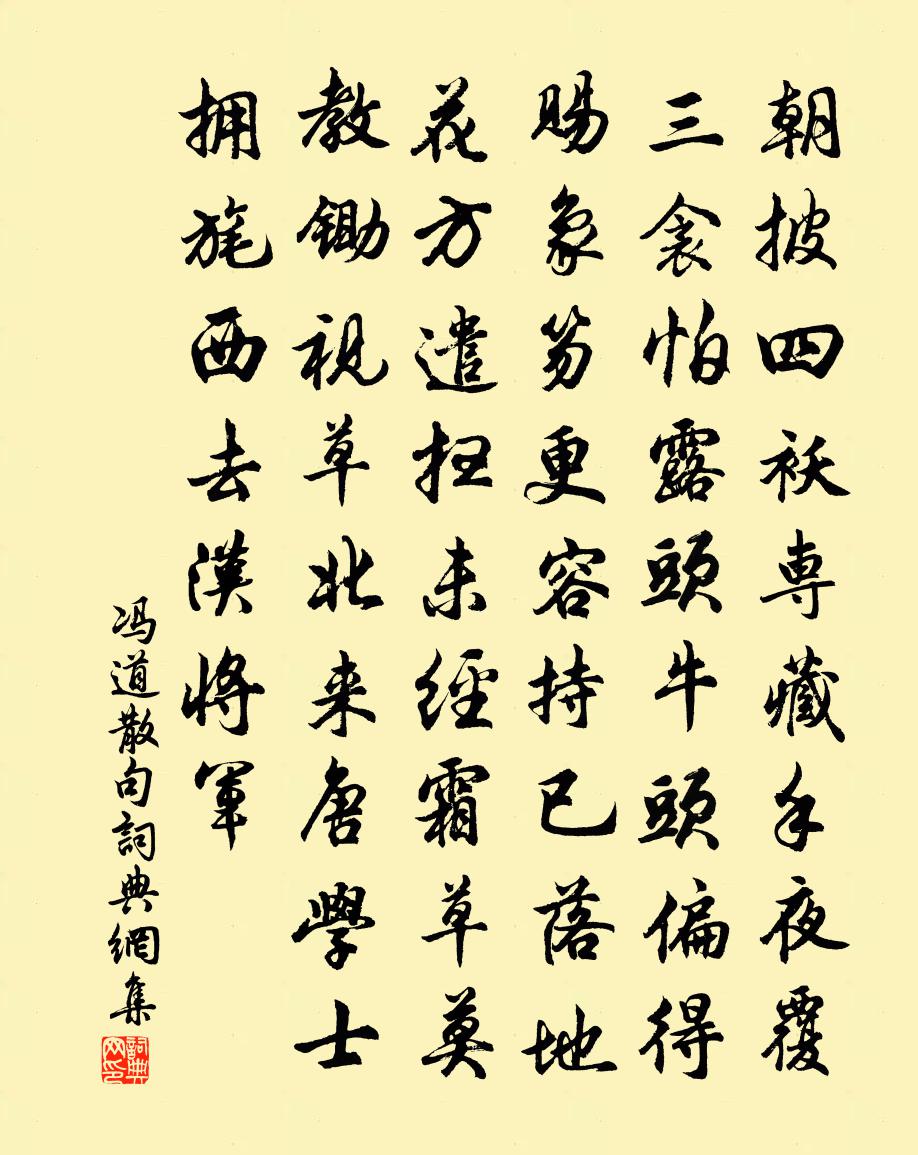 詩詞名句歷史字典書法欣賞書法字典國語詞典說文解字康熙字典古漢語字典標 題 作 者 詩 句 句作者:馮道 朝代:唐代句原文朝披四襖專藏手,夜覆三衾怕露頭。牛頭偏得賜,象笏更容持。已落地花方遣掃,未經霜草莫教鋤。視草北來唐學士,擁旄西去漢將軍。詩詞問答問:句的作者是誰?答:馮道問:句寫於哪個朝代?答:唐代問:句是什麼體裁?答:句馮道句書法欣賞句書法作品注釋全唐詩:卷737-6詩詞推薦劉仙岩劉克莊〔宋代〕絕頂來尋煉藥蹤,老仙端的是吾宗。寄聲月白風清夜,定許相期第幾峰。浣溪沙(壽方稚川)洪适〔宋代〕占得登高一日先。跨雲來作地行仙。天將 * 助長年。健筆已凌枚叟賦,高懷欲著祖生鞭。駸駸彯組向甘泉。村醪二尊獻張平陽蘇軾〔宋代〕詩里將軍已築壇,後來裨將欲登難。已驚老健蘇梅在,更作風流王謝看。□出定知書滿腹,瘦生應為語雕肝。□□憑闌陳普〔宋代〕高豁乾坤眼,山晴緣雨收。夕陽流水繞,荒草白雲浮。柳蔭小溪側,樵歌古渡頭。憑虛發清嘯,安得仲宣樓。到淨慈展墓次韻吳棣窗陳著〔宋代〕有客肯尋僧,新吟漬剡藤。交情自秋月,浮世看春冰。猶顧慈雲榻,相期元夜鐙。我來當付約,樓上看陳登。題武侯廟李復〔宋代〕梁甫高吟一幅巾,聯翩眾盜肯同群。久蟠丘壑雖龍臥,默計江山已鼎分。庸蜀欲開來日月,隆中先見會風雲。雜耕虞美人石孝友〔宋代〕醉尋芳草城頭路。底事頻凝佇。麗譙直下小層樓。鴛瓦重重勻砌、幾重愁。睡紅顰翠春風面。咫尺無由見。從教笑龍興客旅效子美寓居同谷七歌李新〔宋代〕蕭蕭角聲疊疊鼓,招提曠蕩漾無環堵。編蓬懸席不遮攔,西面透風東面雨。官歸庇身無一瓦,反更罹此百憂苦。嗚和韓子文五首曾協〔宋代〕與君聯轡聽冬瓏,下馬荀陳列座中。南北東西鄉國異,笑談天與一尊同。寄雲谷王府判黃庚〔宋代〕曾記還家日,重來約夏初。自從一別從,又是十年余。原憲非關病,嵇康懶讀書。無從問訊息,近況果何如。過濟源登裴公亭用閒閒老人韻耶律楚材〔元代〕山接青霄水浸空,山光灩灩水溶溶。風回一鏡揉藍淺,雨過千峰潑黛濃。蘇才翁與予定林下之約今被命提點湖南刑獄恐韓維〔宋代〕軒冕予已輕,山水君所欒。相逢說高興,南望欲奔趠。今君被國恩,明刑弼予教。群公許風棱,列郡瞻氣貌。朝廷憶荊州舊遊陸游〔宋代〕書劍萬里行翩翩,度關登隴常慨然。射麋雲夢最樂事,至今曠快思楚天。落筆千言不加點,班荊百榼命割鮮。有時邊將別殷文圭〔唐代〕地角天涯倍苦辛,十年鉛槧未酬身。朱門泣別同鮫客,紫塞旅遊隨雁臣。漢將出師沖曉雪,胡兒奔馬撲征塵。行行絛蔣廷玉〔宋代〕八百青銅買,歸來系黑豹。松毛倒垂膝,棕綆曲圍腰。穩稱輕小帽,宜懸小藥瓢。有時吟未就,頻在手中搖。贈前京華王制屬洪咨夔〔宋代〕赤時風欲盡,黃花霜未乾。病添予許老,窮迫子能寒。劍蝕蛟還吼,袍塵鶻尚盤。山東河北事,欲語淚汍瀾。秋日感懷祖無擇〔宋代〕多病多愁客,新秋百感生。異鄉違土性,孤宦見人情。案厭留燈讀,田思帶雨耕。不堪臨曉鏡,潘鬢二毛成。春晚渡河有懷羅鄴〔唐代〕煙收綠野遠連空,戍壘依稀入望中。萬里山河星拱北,百年人事水歸東。扁舟晚濟桃花浪,走馬晴嘶柳絮風。鄉思次梁粹錄囚上饒方岳〔宋代〕此老清如許,寧求使節知。檄分風憲重,山到月岩奇。秋色深宜雨,寒花併入詩。聖朝本仁厚,鼠輩亦吾兒。次徐相公韻十首劉錡釋行海〔宋代〕五色戎旌百萬鞍,徒夸龍虎統兵官。囂喧閃電蕃營亂,陣算迴風虜帳寒。兵法用過黃石遠,血盟瀝公盡心乾。太平名句推薦糟糠不飽者不務粱肉,短褐不完者不待文繡。韓非及後人《韓非子·五蠹》 白雲江上故鄉,月下風前吟處。子蘭《秋日思舊山》 金柳搖風樹樹,系彩舫龍舟遙岸。柳永《破陣樂·露花倒影》 從臣皆半醉,天子正無愁。李商隱《陳後宮》 問世間,情是何物,直教生死相許?元好問《摸魚兒·雁丘詞 / 邁陂塘》 抽刀斷水水更流,舉杯消愁愁更愁。李白《宣州謝朓樓餞別校書叔雲》 請君看取東流水,方識人間別意長。嚴仁《鷓鴣天·惜別》 紫泉宮殿鎖煙霞,欲取蕪城作帝家。李商隱《隋宮》 潭州官舍暮樓空,今古無端入望中。李商隱《潭州》 今夜鄜州月,閨中只獨看。杜甫《月夜》